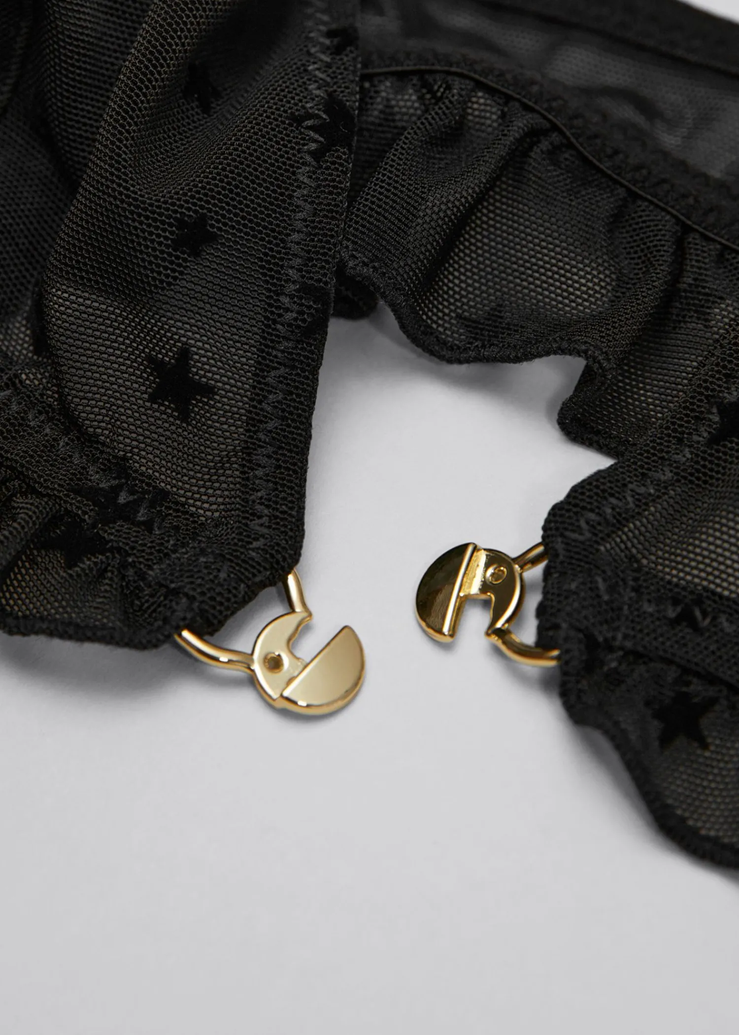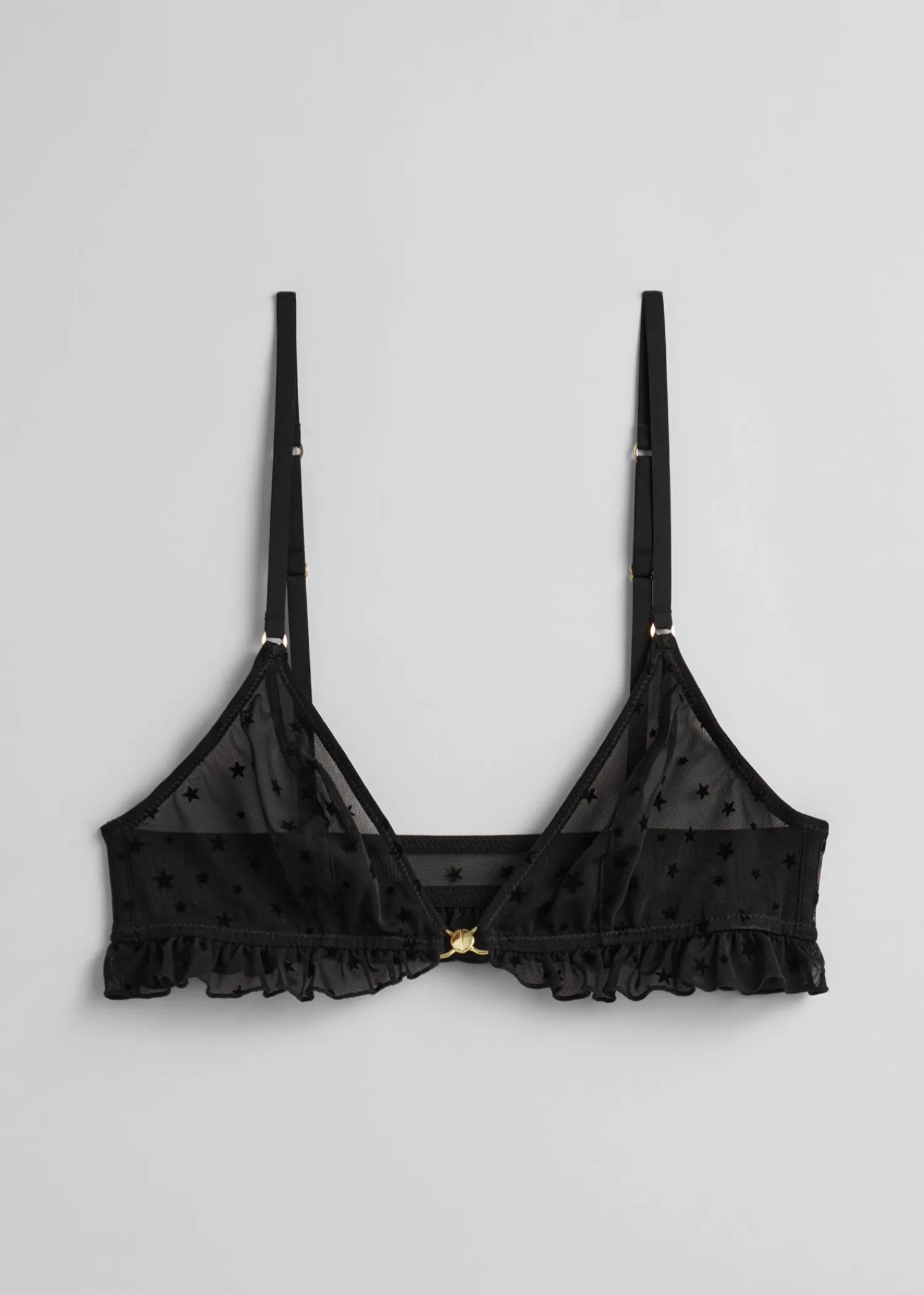 Gennemsigtig Blød Bh Med Et Allover Stjernemotiv Og En Flæsekant Forneden. Justerbare Skulderstropper. Lille Metalspænde Mellem Kopperne