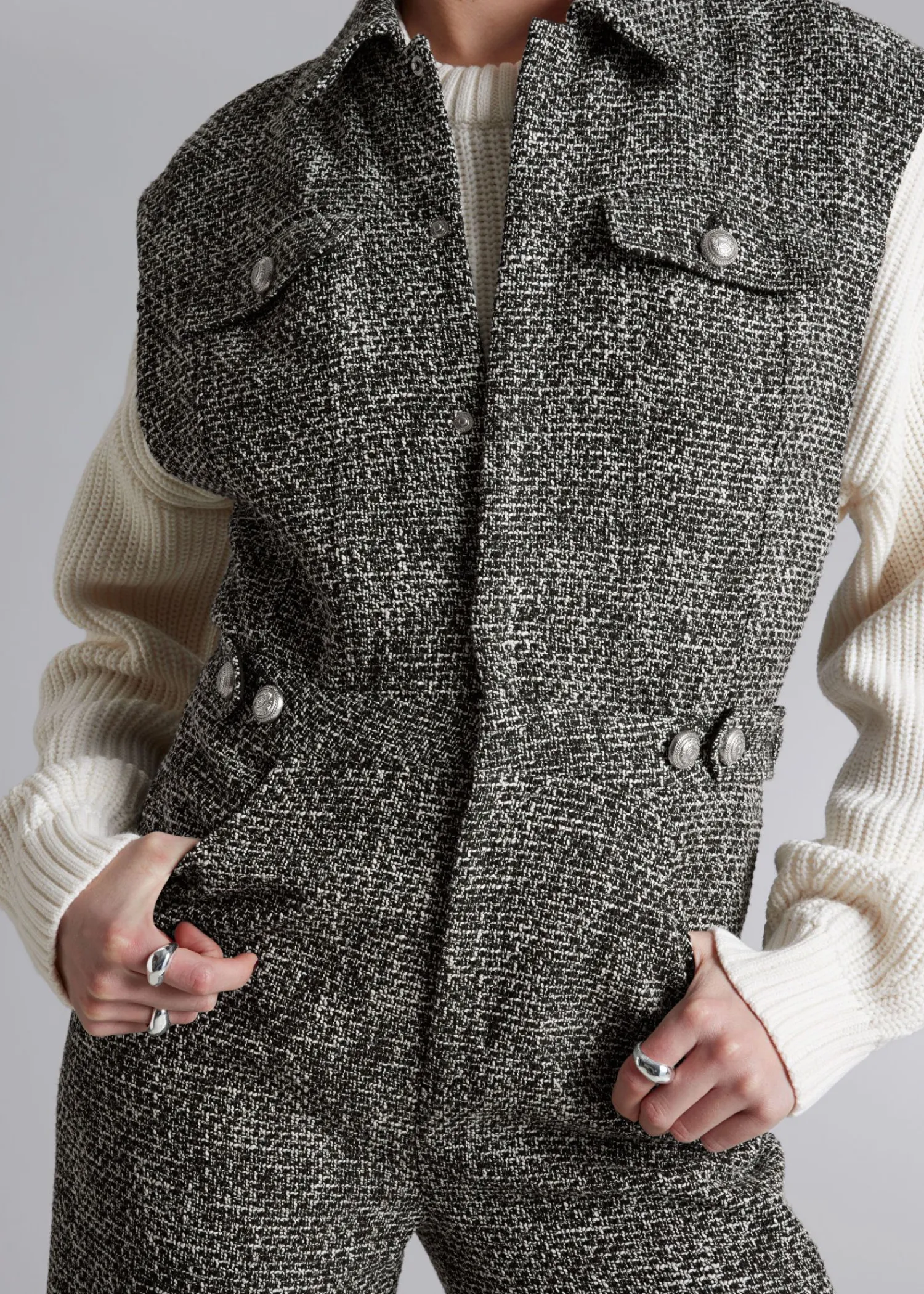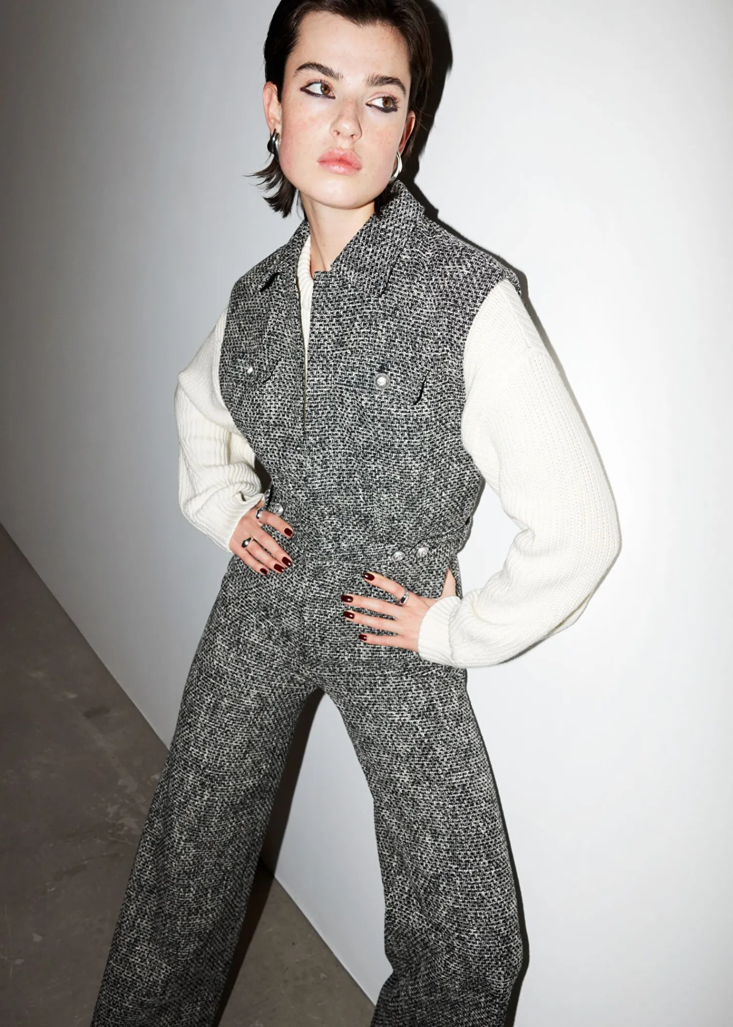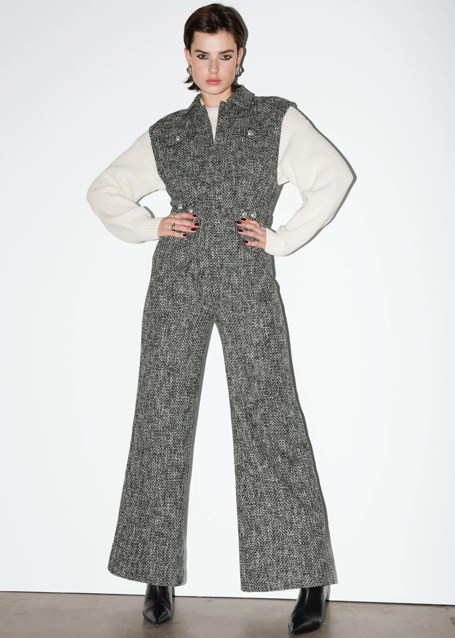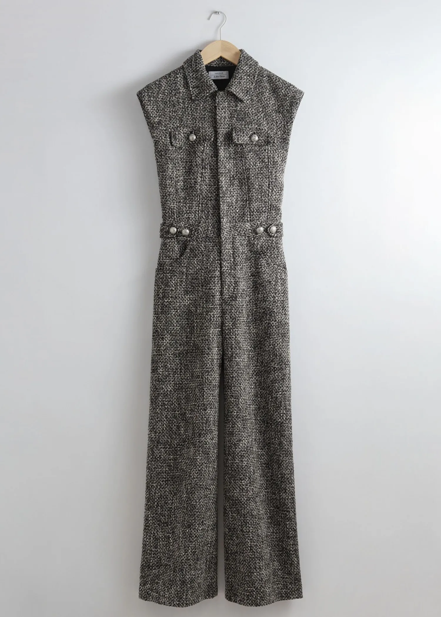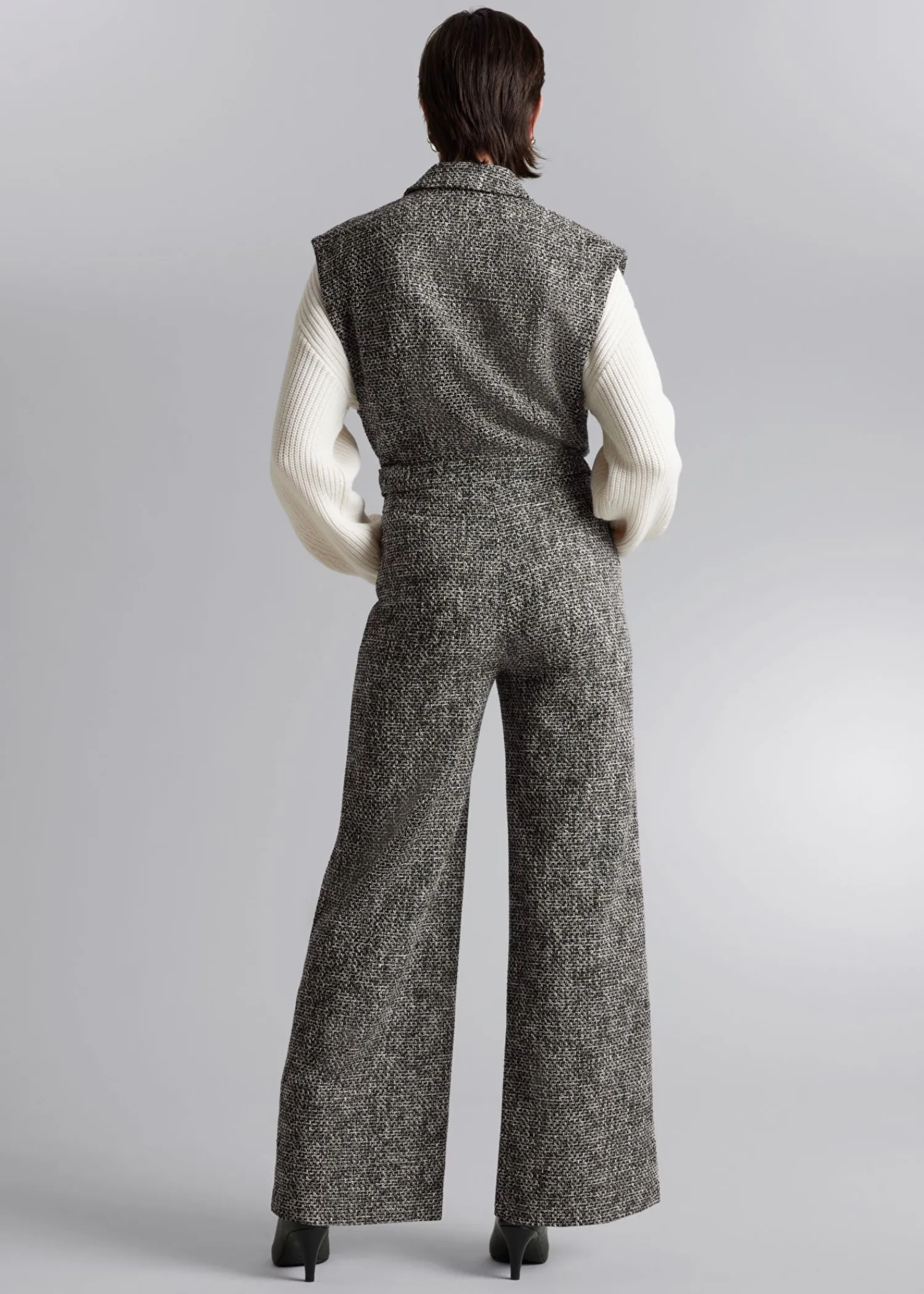Ærmeløs Tweed Jumpsuit Med Krave Med En Tætsiddende Top Og Brede Ben. Sporet Med Skjulte Trykknapper I Midten Foran. Foret Top Klaplomme Med Knap På Brystet Knappede Faner I Taljen Duo-Lommer I Siden Lynlåsgylp Med Krog- Og Stanglukning Længde På Indersøm: 75 Cm / 29,5″ (Eu 36 / Uk 8 / Us 4)