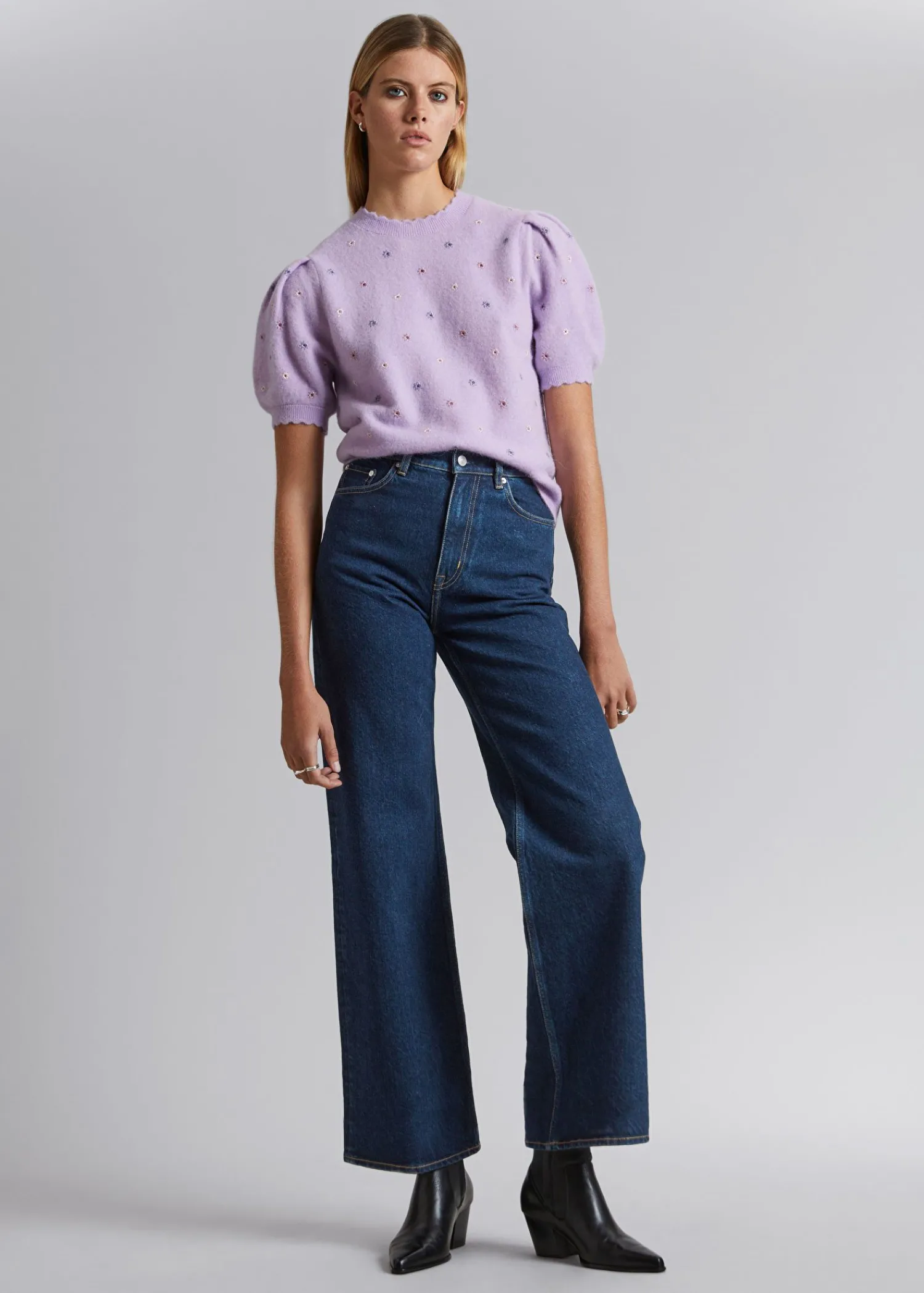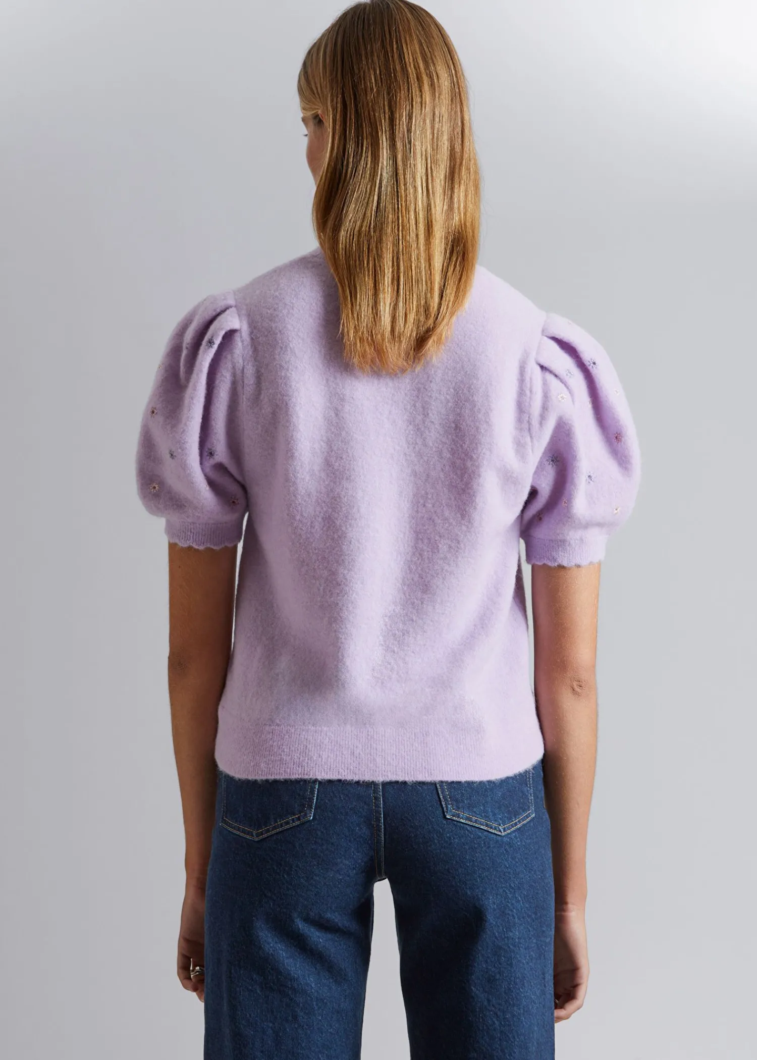 Puffærmet Top Strikket Af Alpaca- Og Uldblanding. Detaljeret Med Glitrende Lurex-Blomster. Scalloped Halsudskæring Og Manchetter Ribkantet Halsudskæring, Manchetter Og Kant Certificeret I Henhold Til Responsible Alpaca Standard (Cu815571) Certificeret I Henhold Til Responsible Wool Standard (Cu815571) Længde På Toppen: 56Cm / 22″ (Størrelse S)