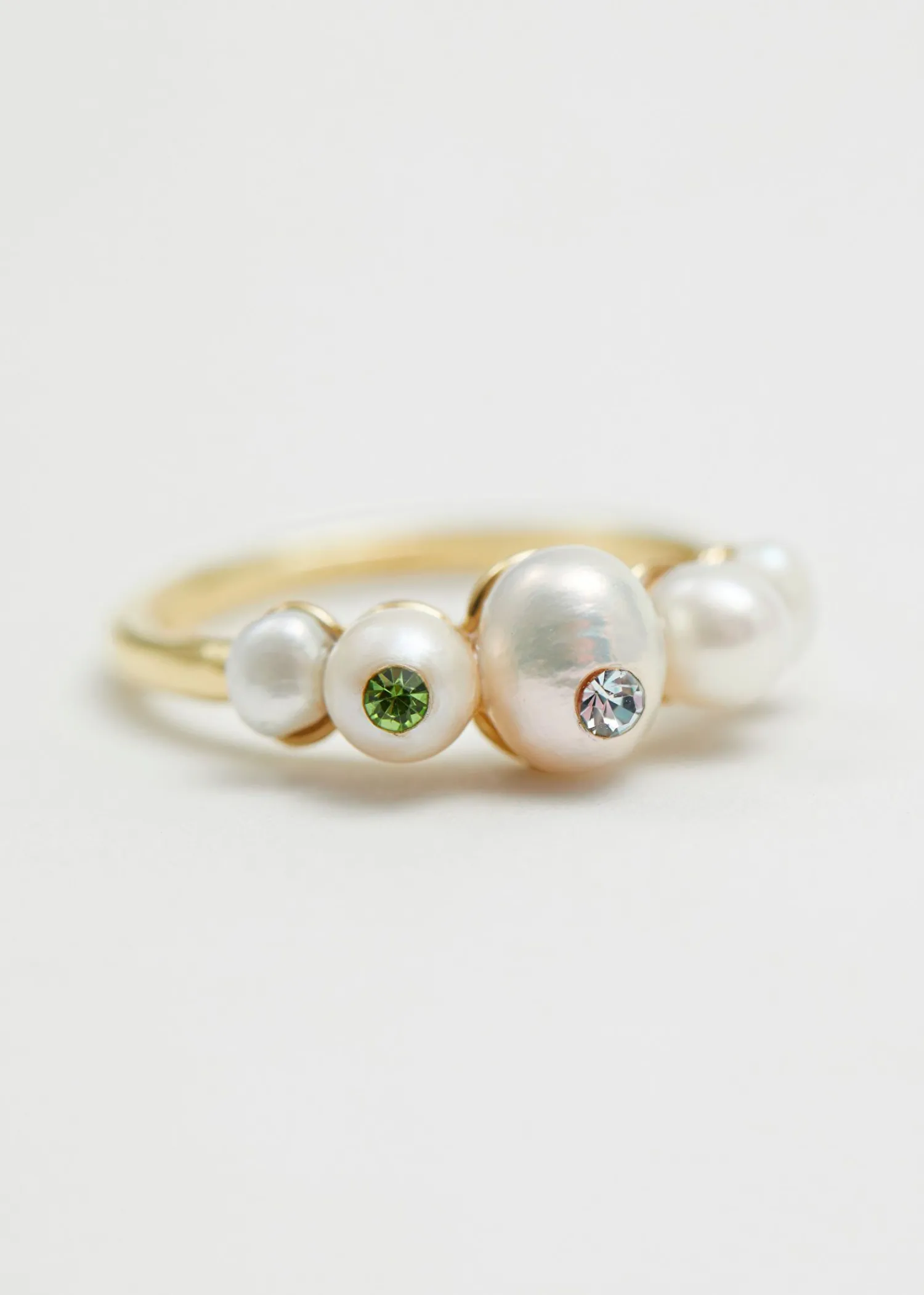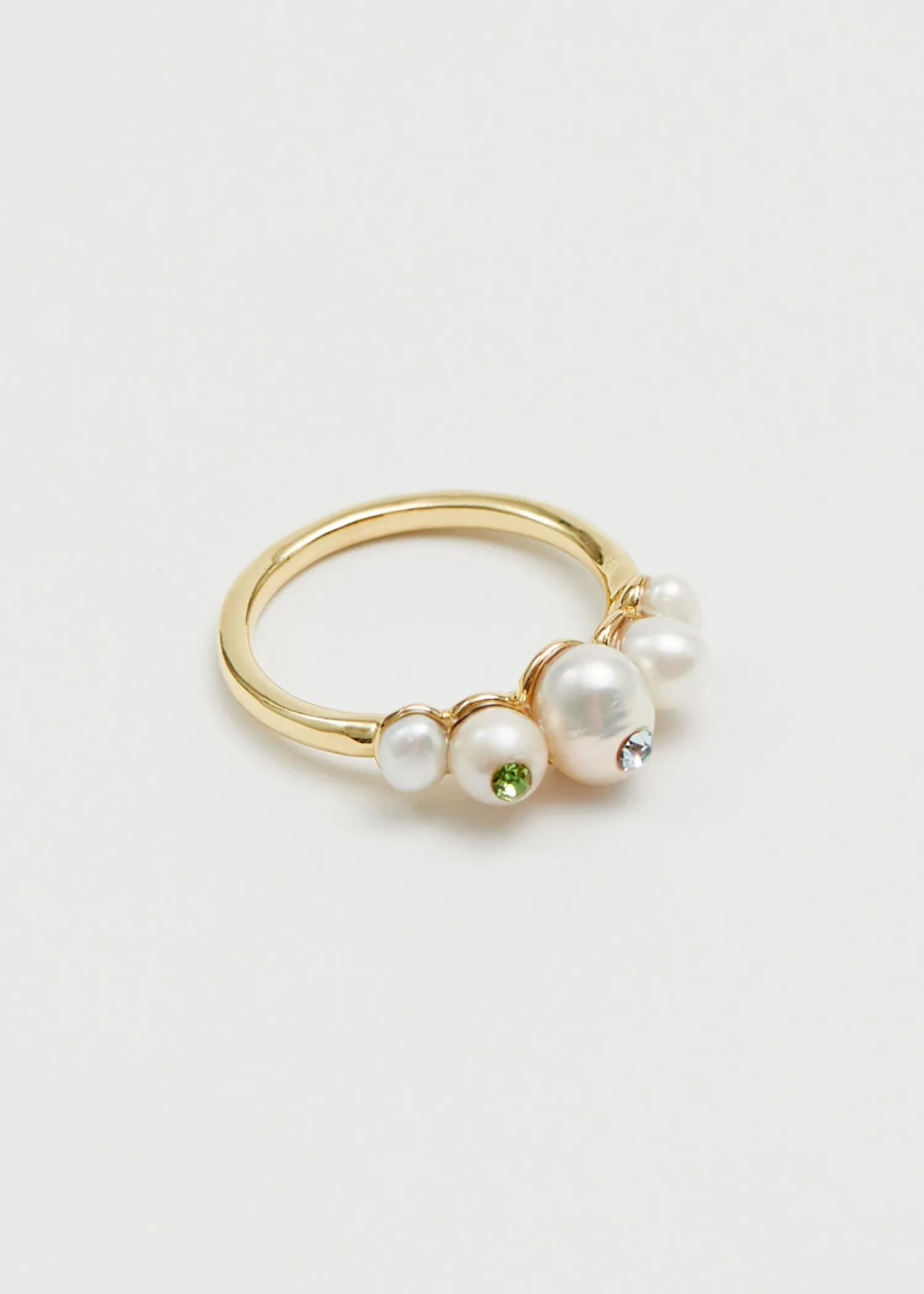 Denne Delikate Ring Er Fremstillet Af Guldtonet Messing Og Har Fem Ferskvandsperler Sat Med To Strålende Rhinsten. Nikkel Testet