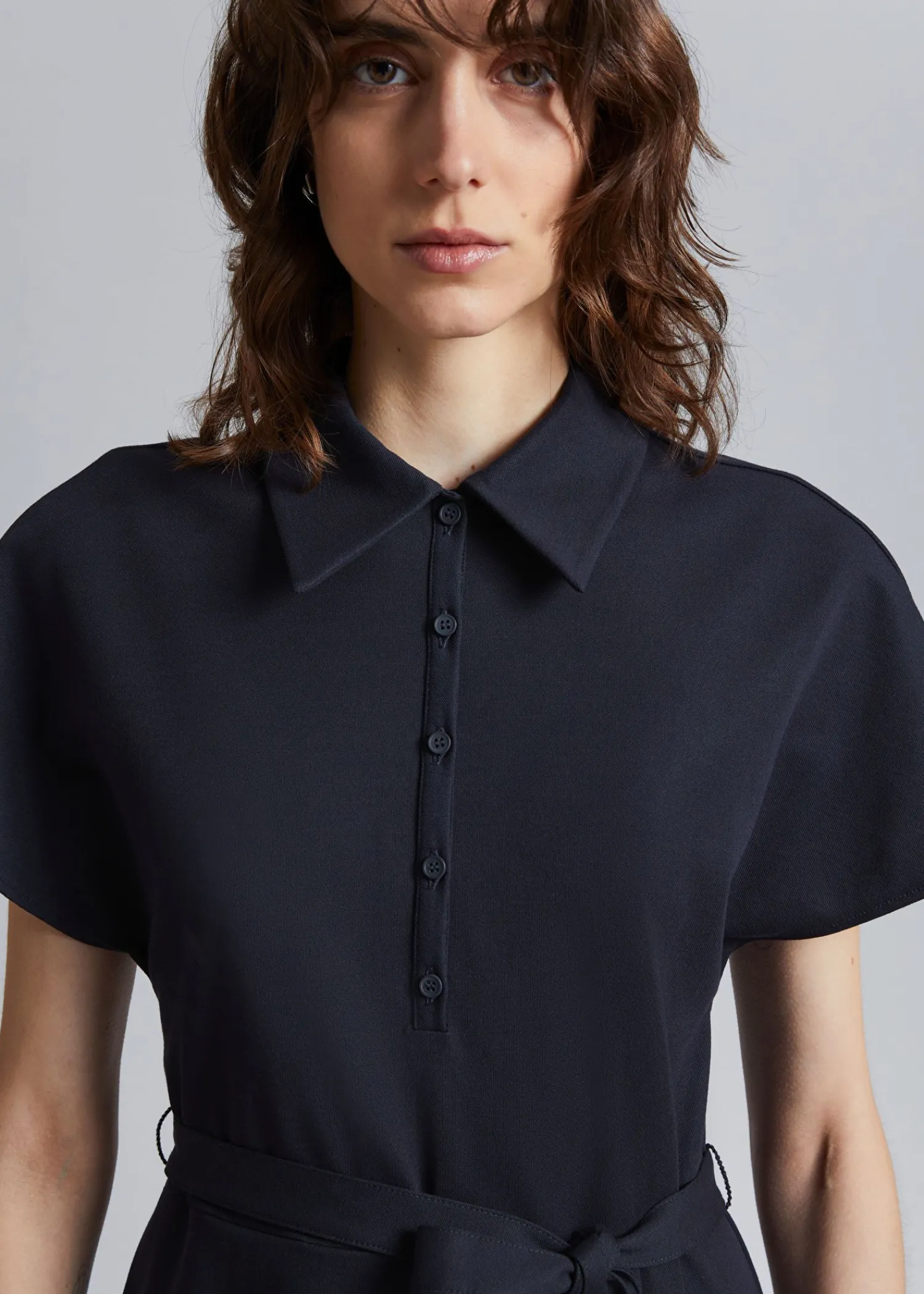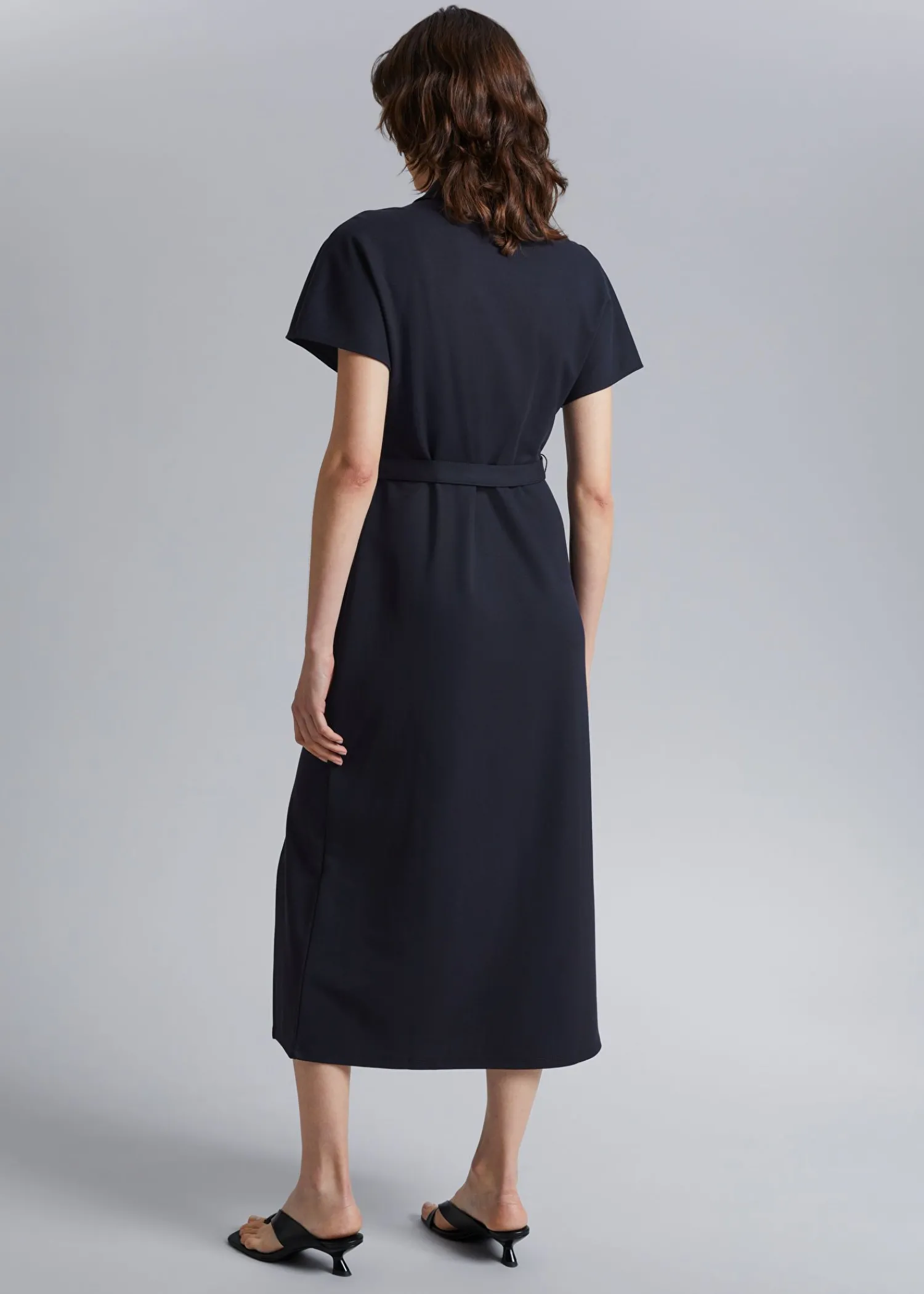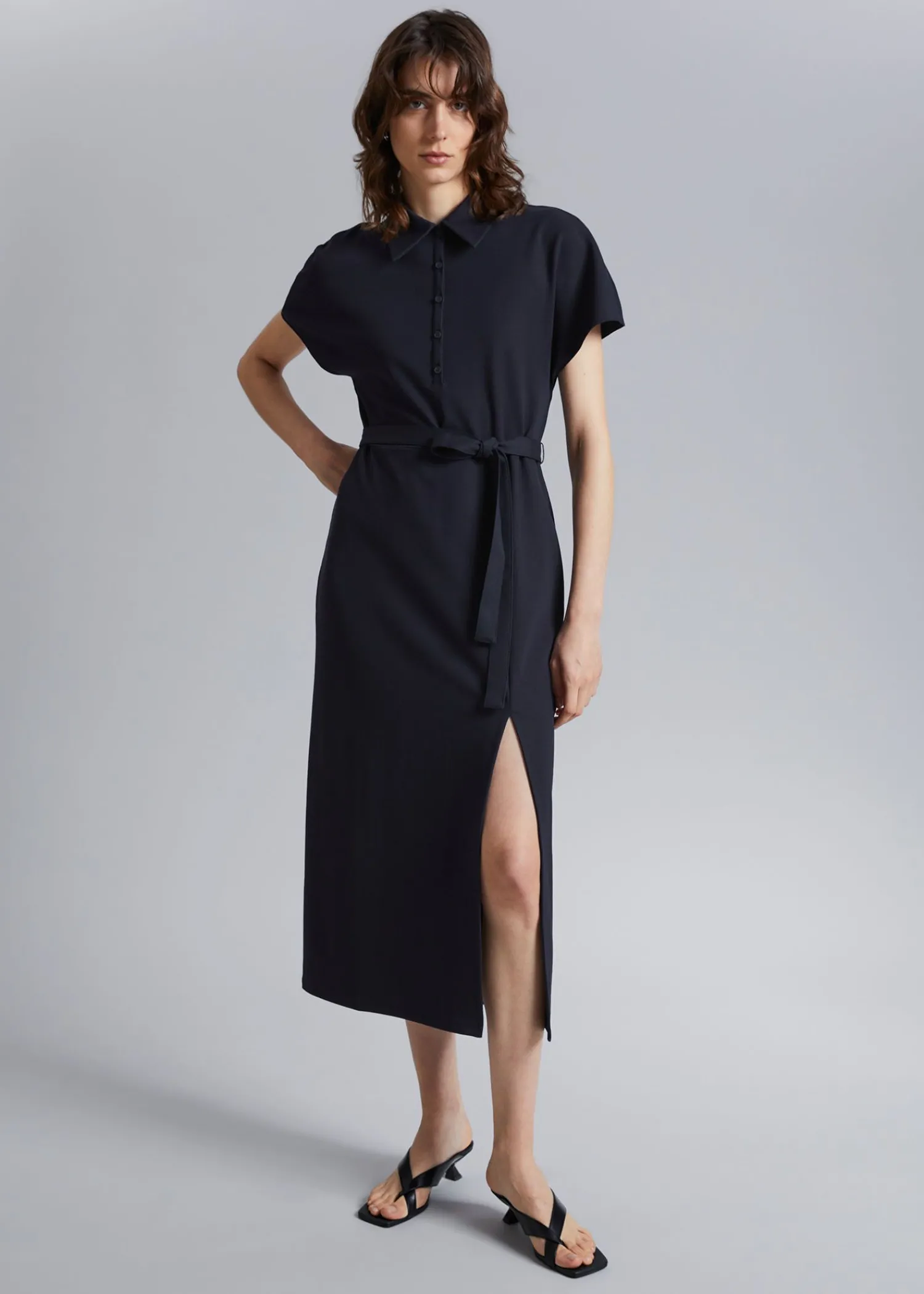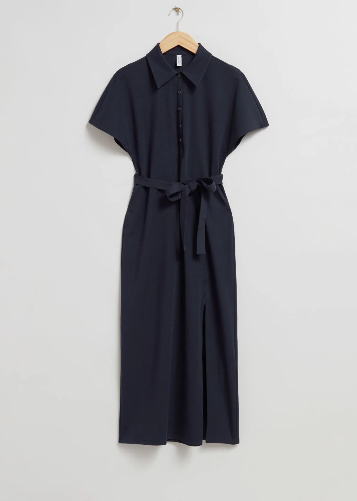 Mellemlang Polokjole Lavet Af Jerseystof. Designet Med En Klassisk Turn-Down Krave, En Knappet Stolpe Foran, Korte Sommerfugle Ærmer Og Et Bindebælte For At Lukke Taljen Og Sideslidsdetaljen. – Normal Pasform, Lige – Jersey Længde På Kjolen: 127 Cm / 50″ (Størrelse S) Vores Design Fra Paris Er Romantisk, Ubesværet Og Smart.