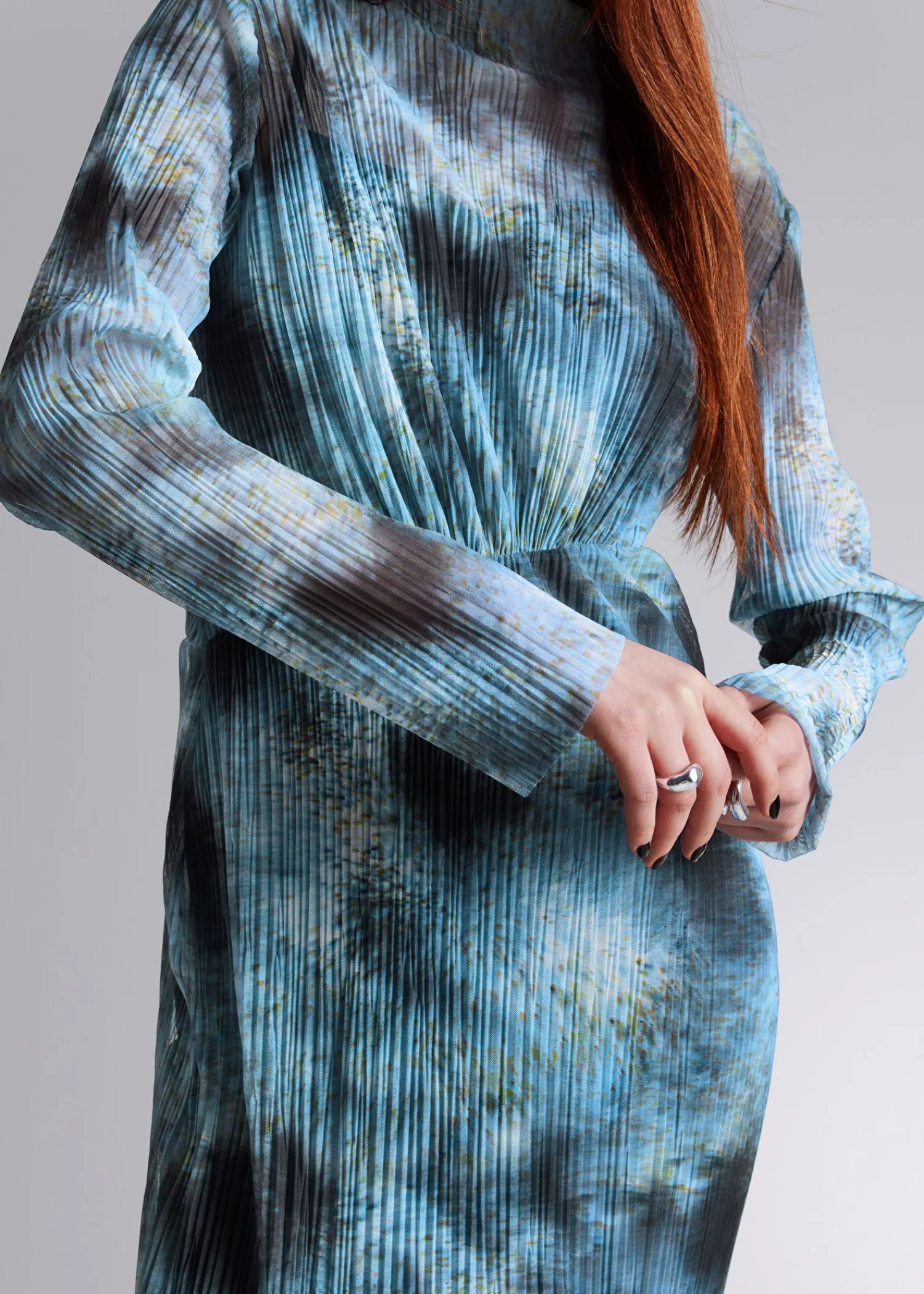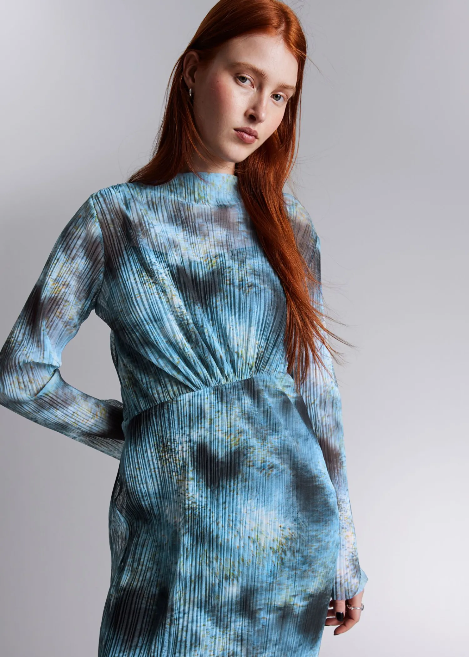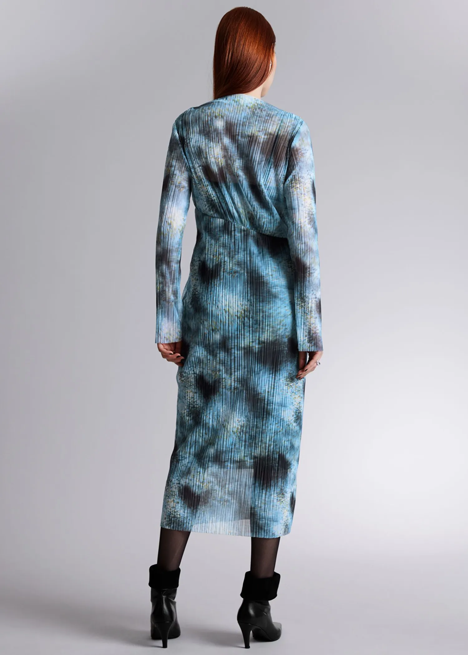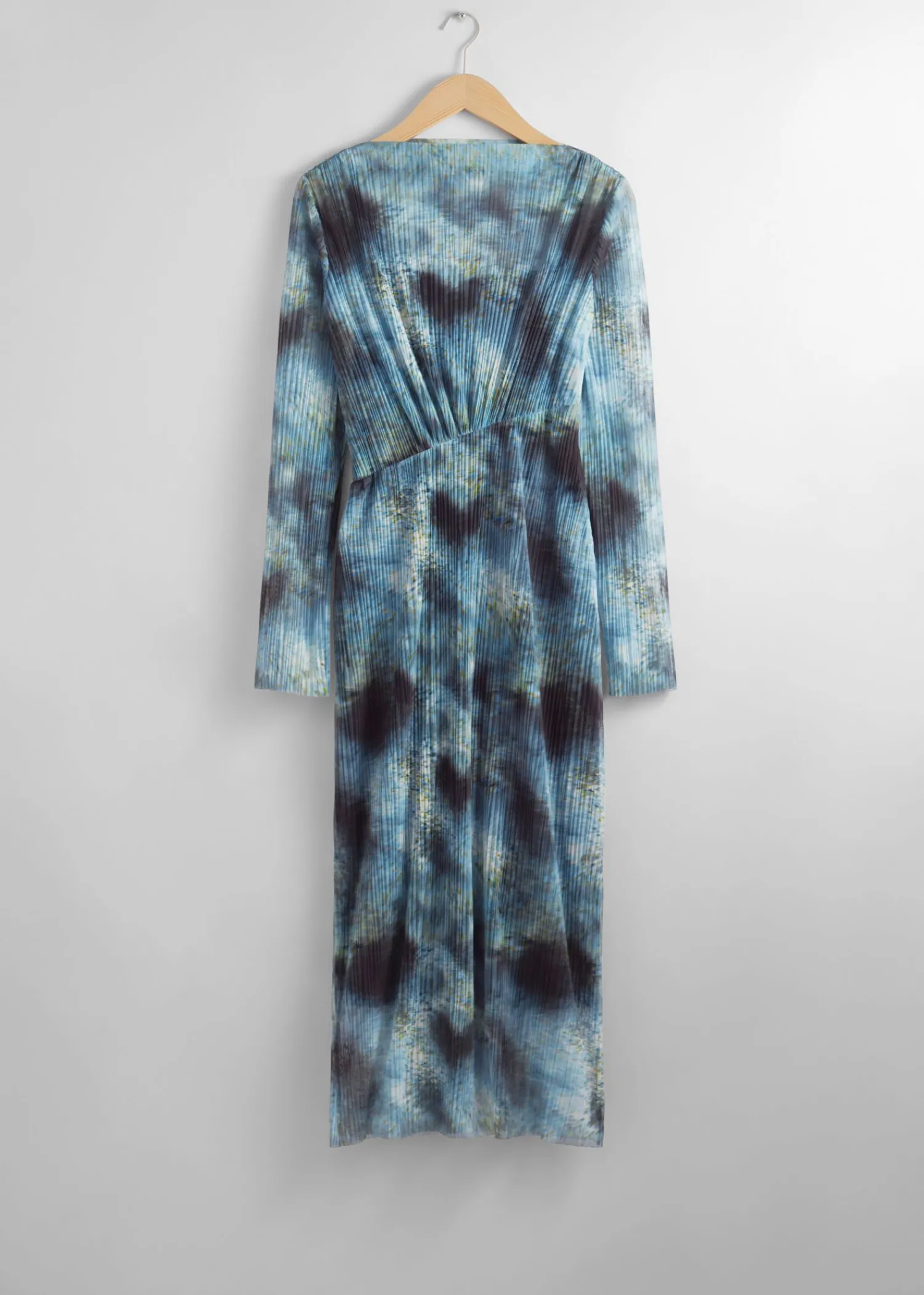 Langærmet Midikjole Med Blidt Plisserede Detaljer Og En Asymmetrisk Skæring Foran. Slim Fit Bådudskæring Råkantede Detaljer Ved Manchetterne Og Forneden Længde På Kjolen: 124 Cm / 48,8″ (Str. S)