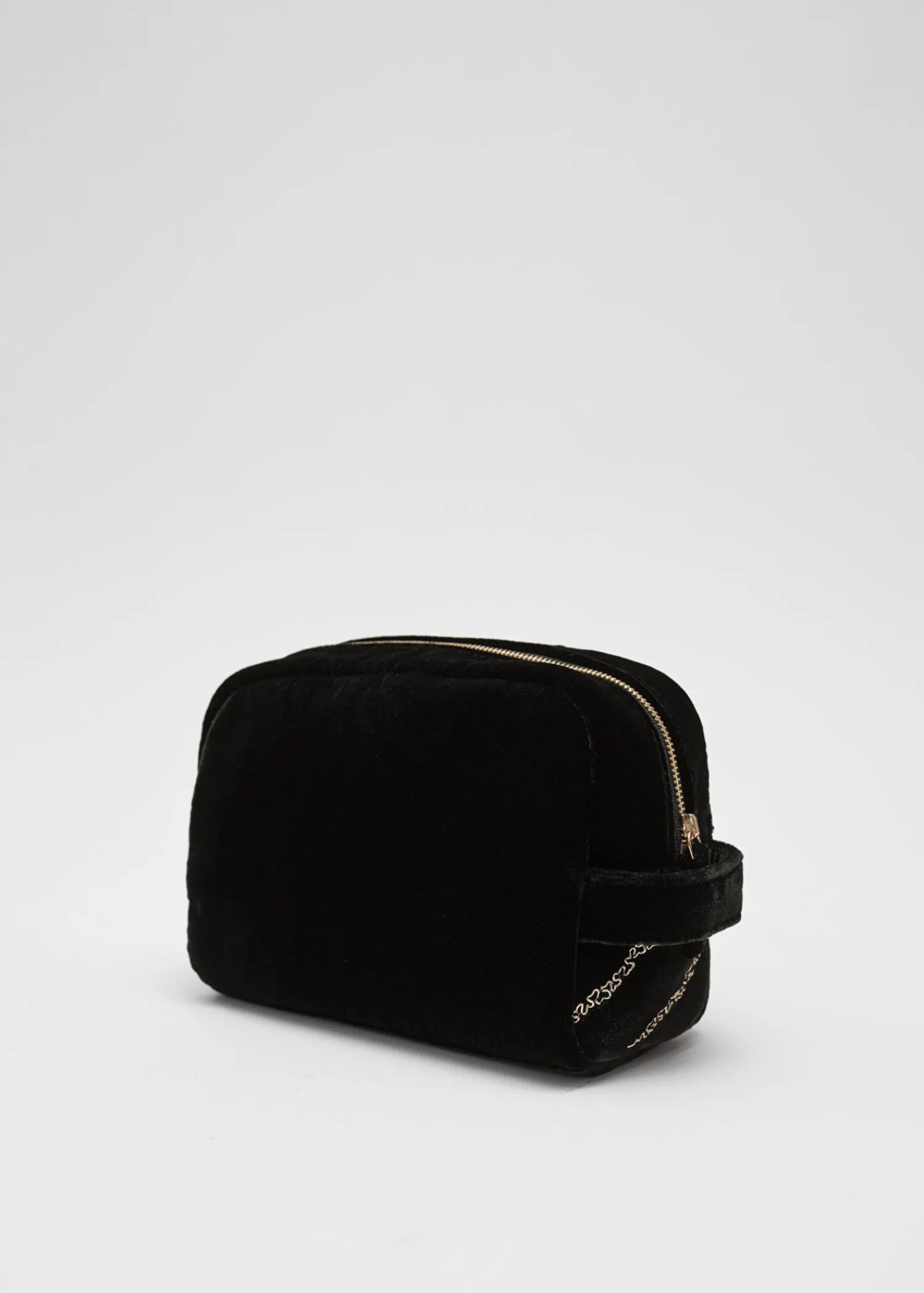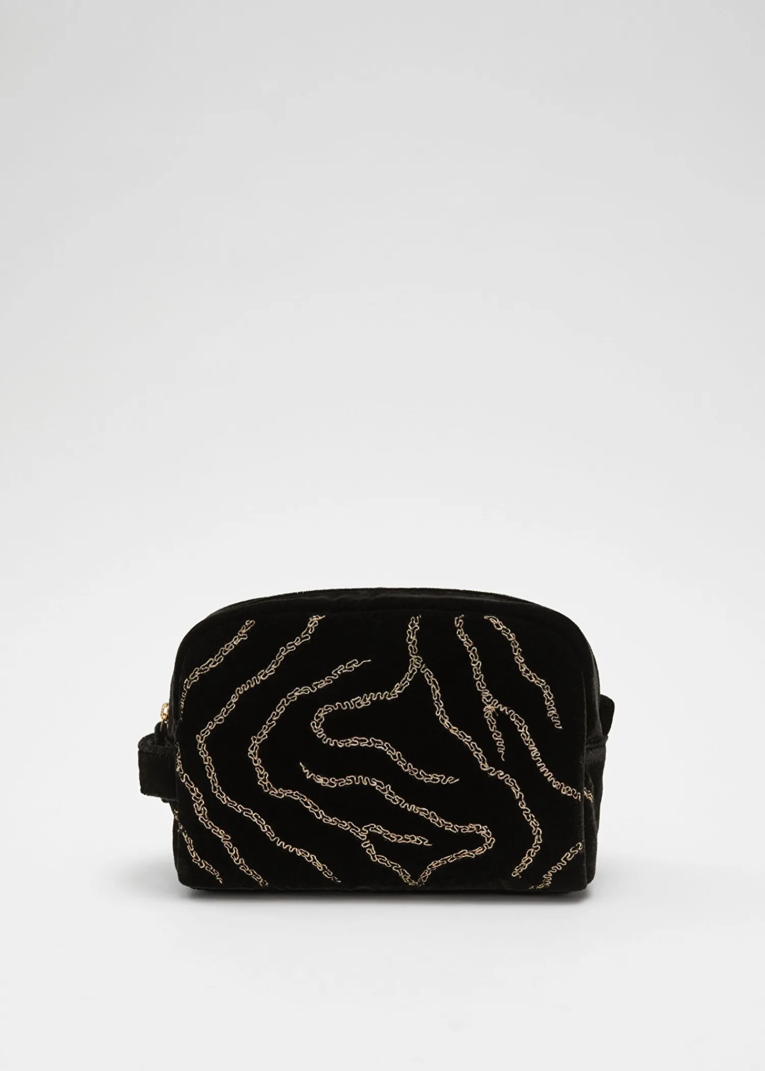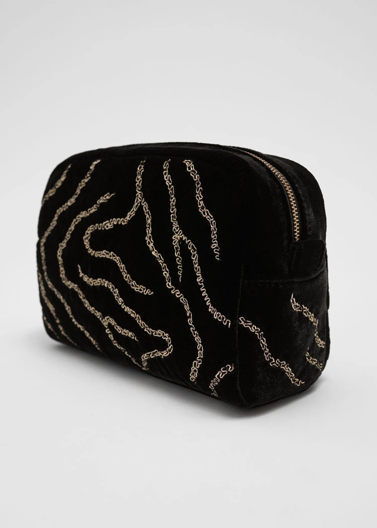 Toilettaske Lavet I Sort Fløjl, Detaljeret Med Gyldent Zebrabroderi Og Guldfarvet Lynlås. Afsluttet Med Bomuldsfor. Bredde: 21Cm / 8.3 Højde: 16Cm / 6.3 Dybde: 11Cm / 4.3