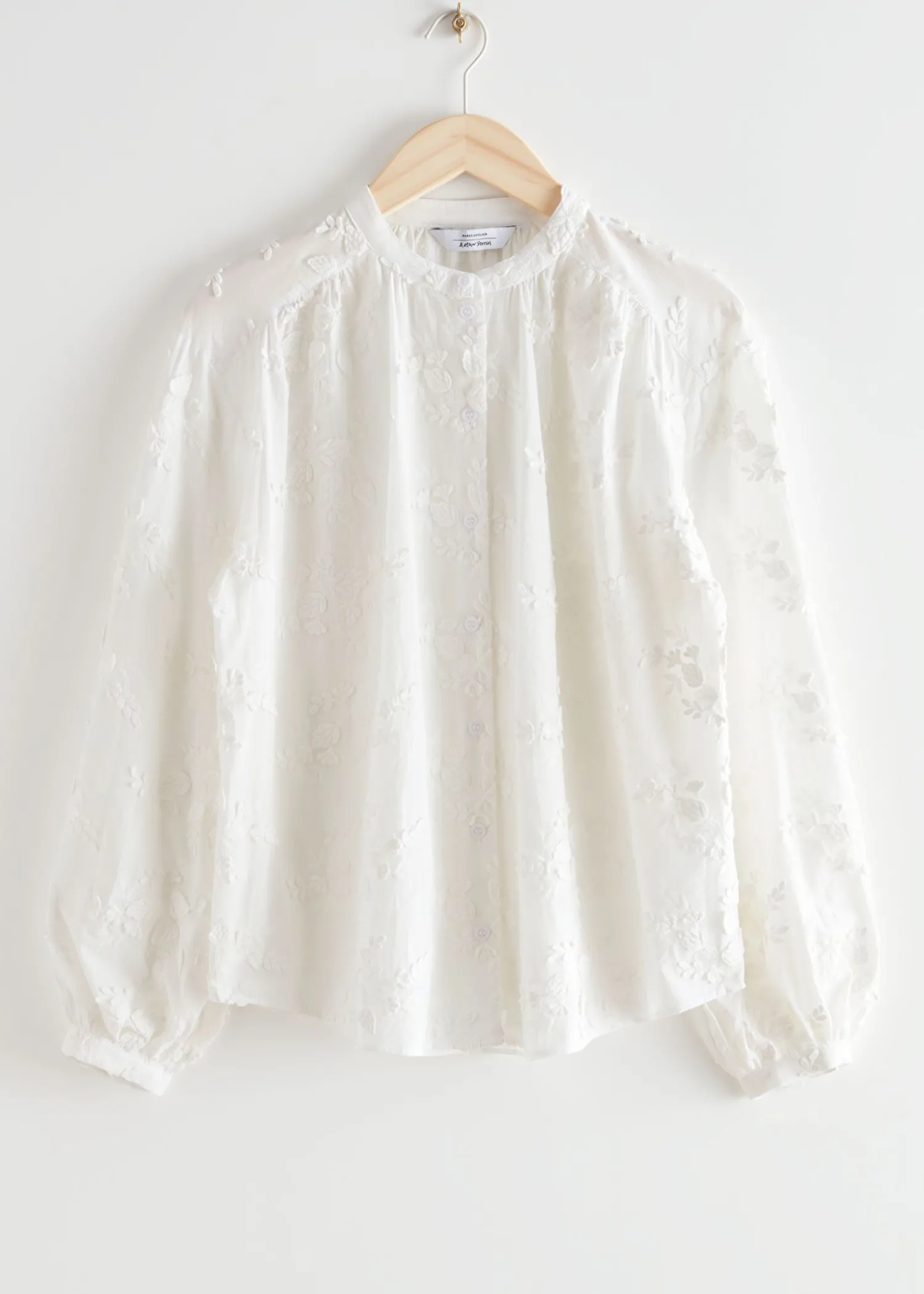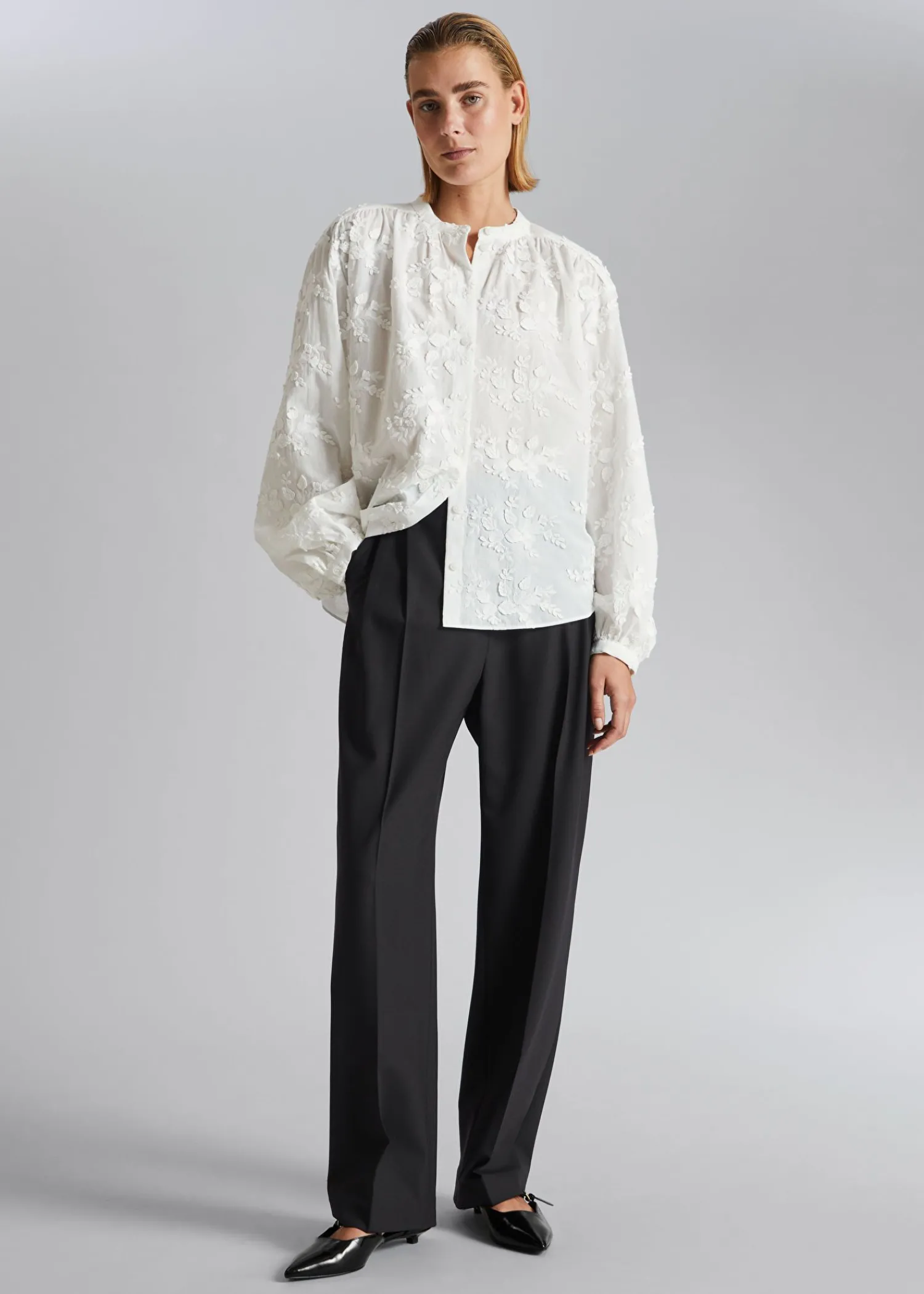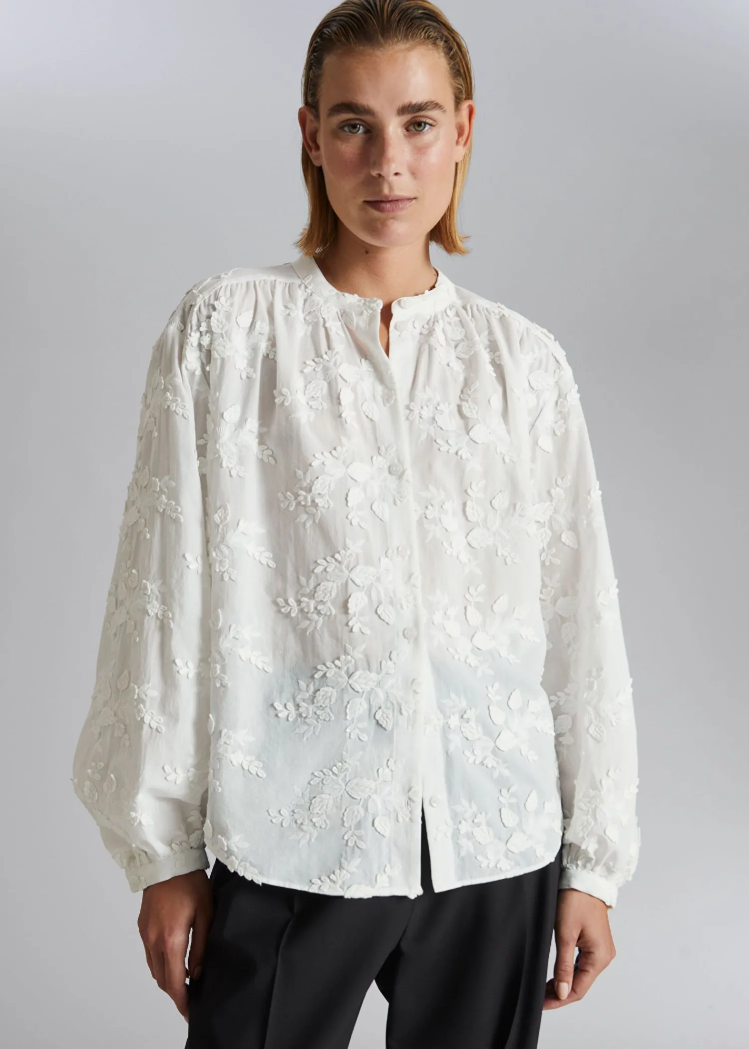 Voluminøs Bluse Med Opretstående Krave Og Lange Ærmer Med Rynkede Manchetter. Løs Silhuet Buet Søm Længde På Blusen: 64,6″ / 25,4″ (Eu 36 / Uk 10 / Us 4)