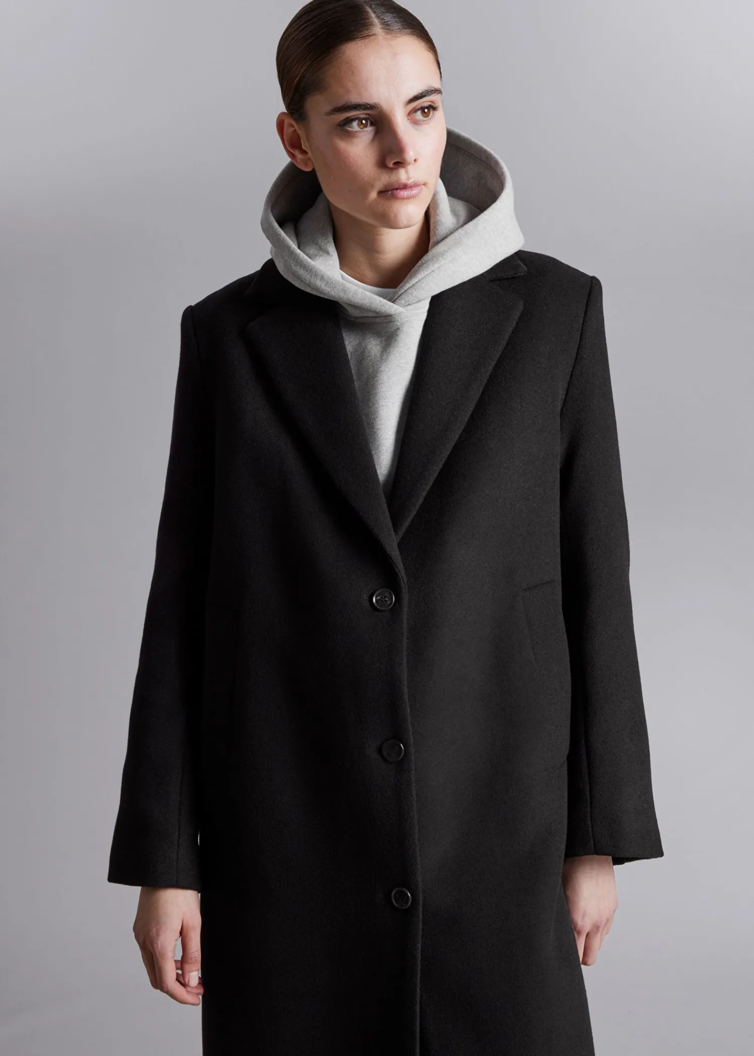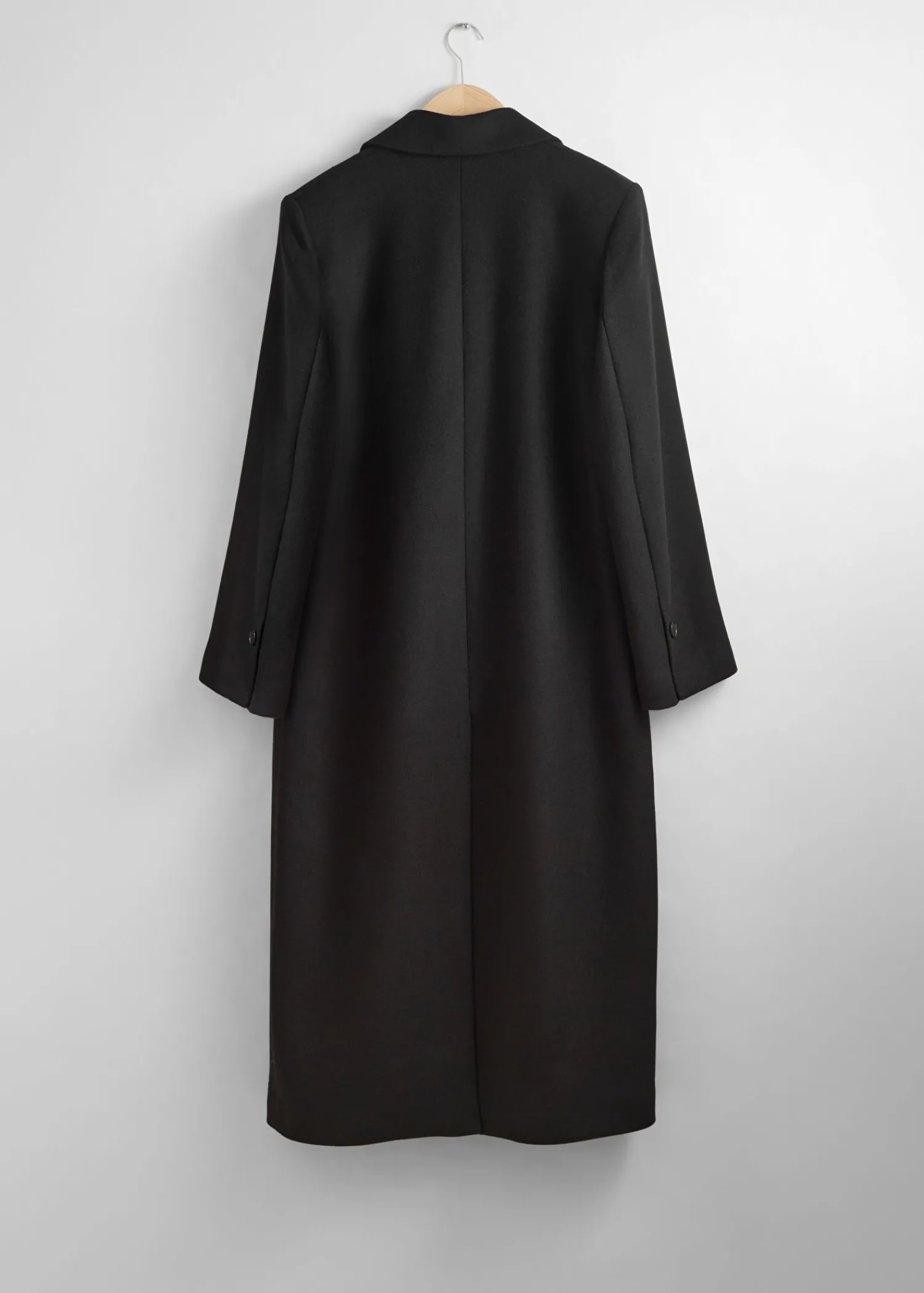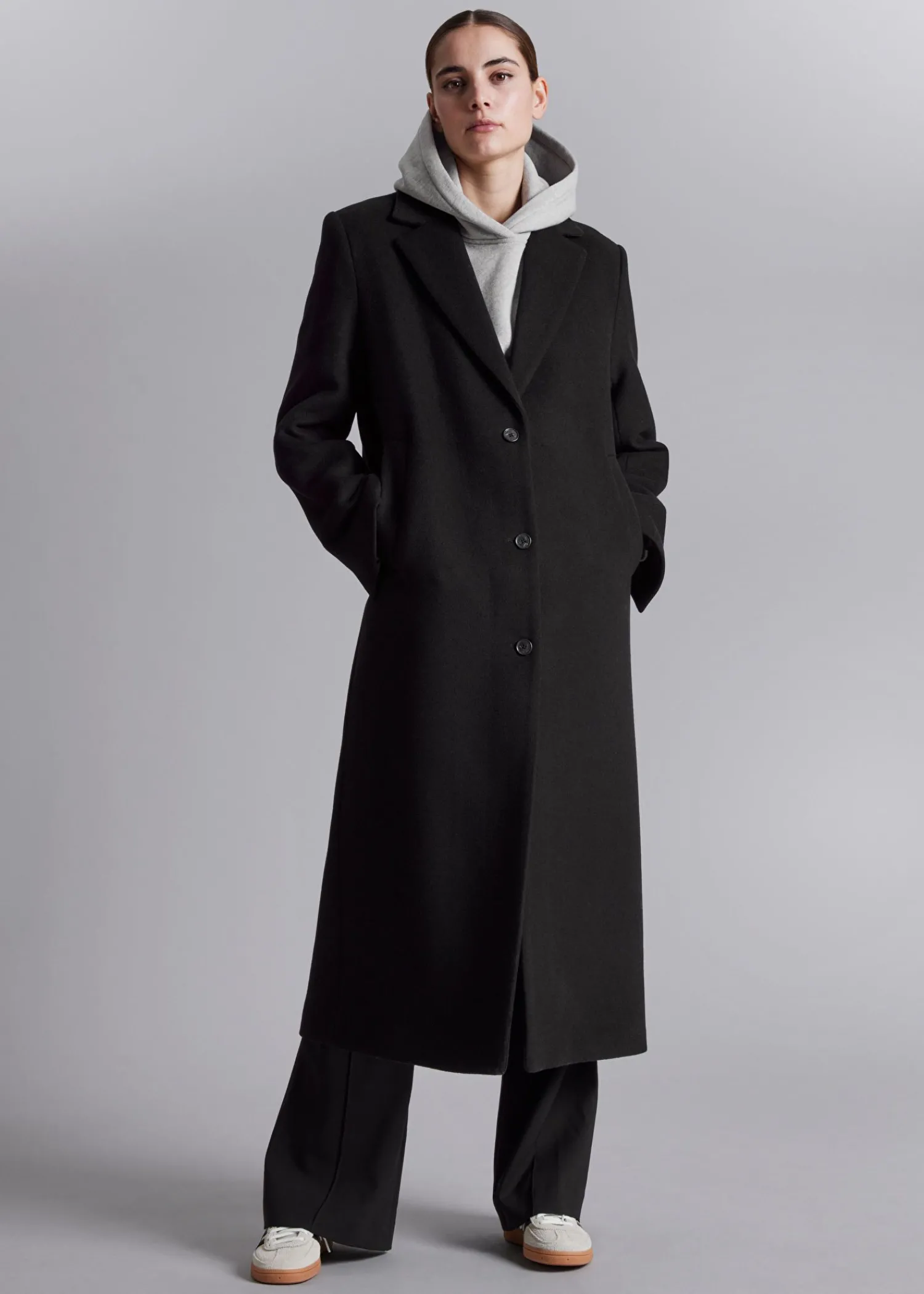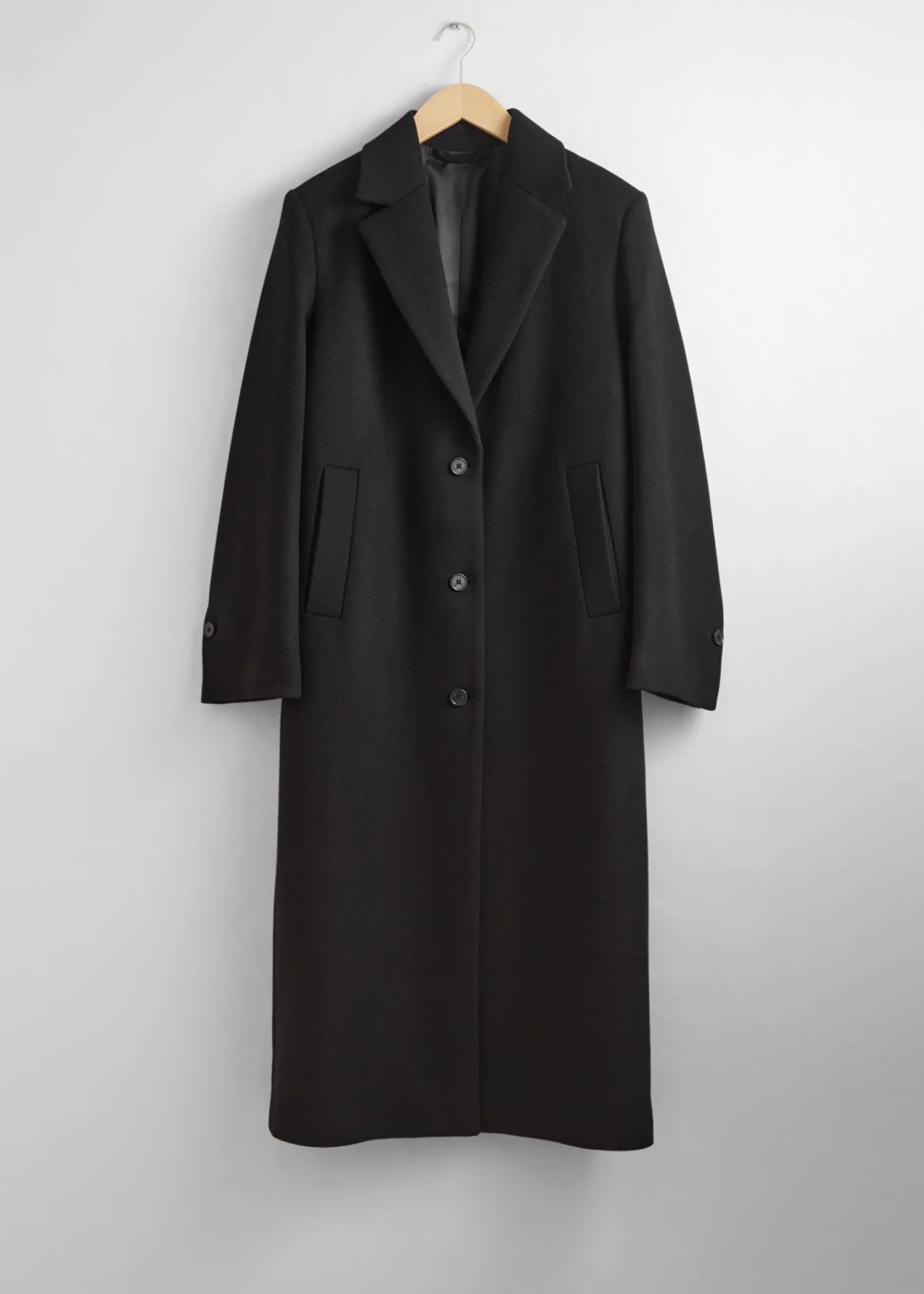 Lang Enkeltradet Uldfrakke Sporet Med Tre Knaplukninger. Bøjleløkke Duo Paspolerede Lommer Længde På Frakken: 125,5 Cm / 49,4″ (Størrelse S)
