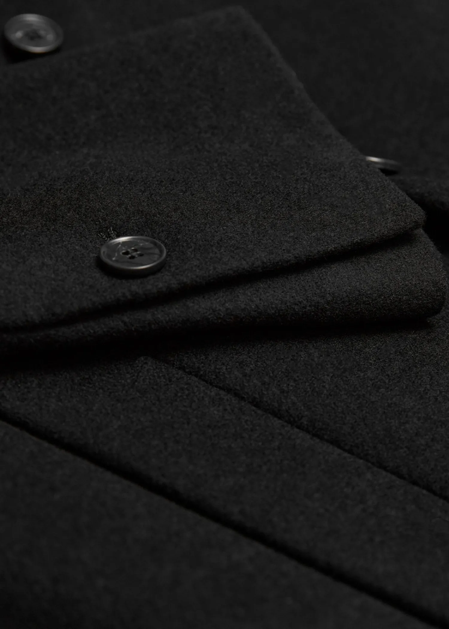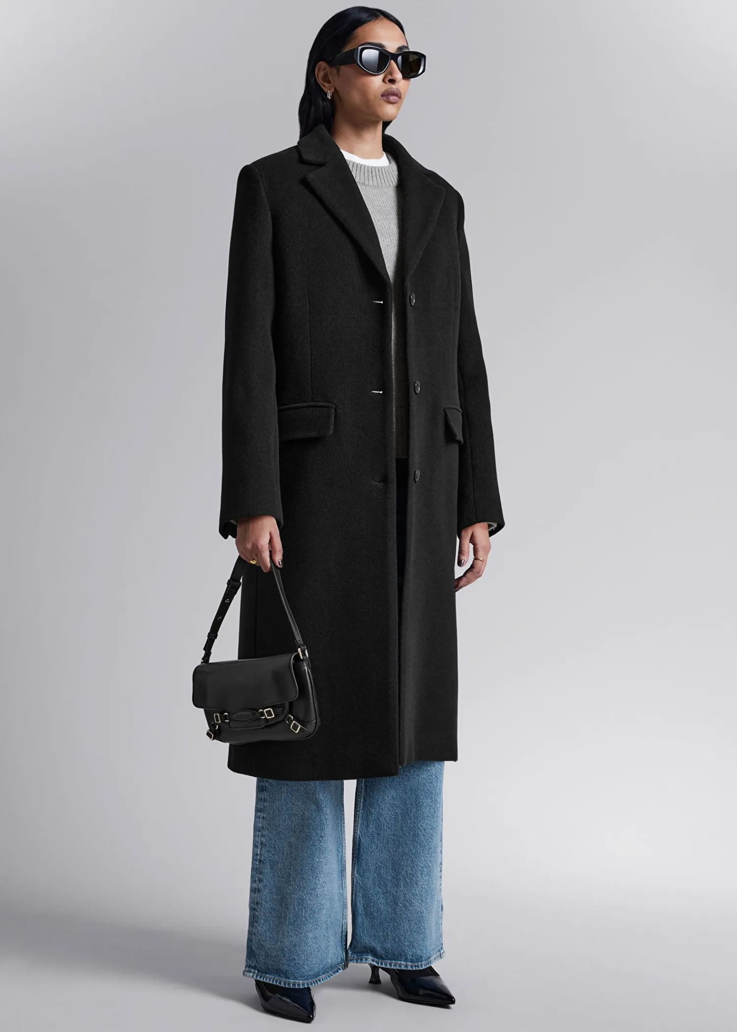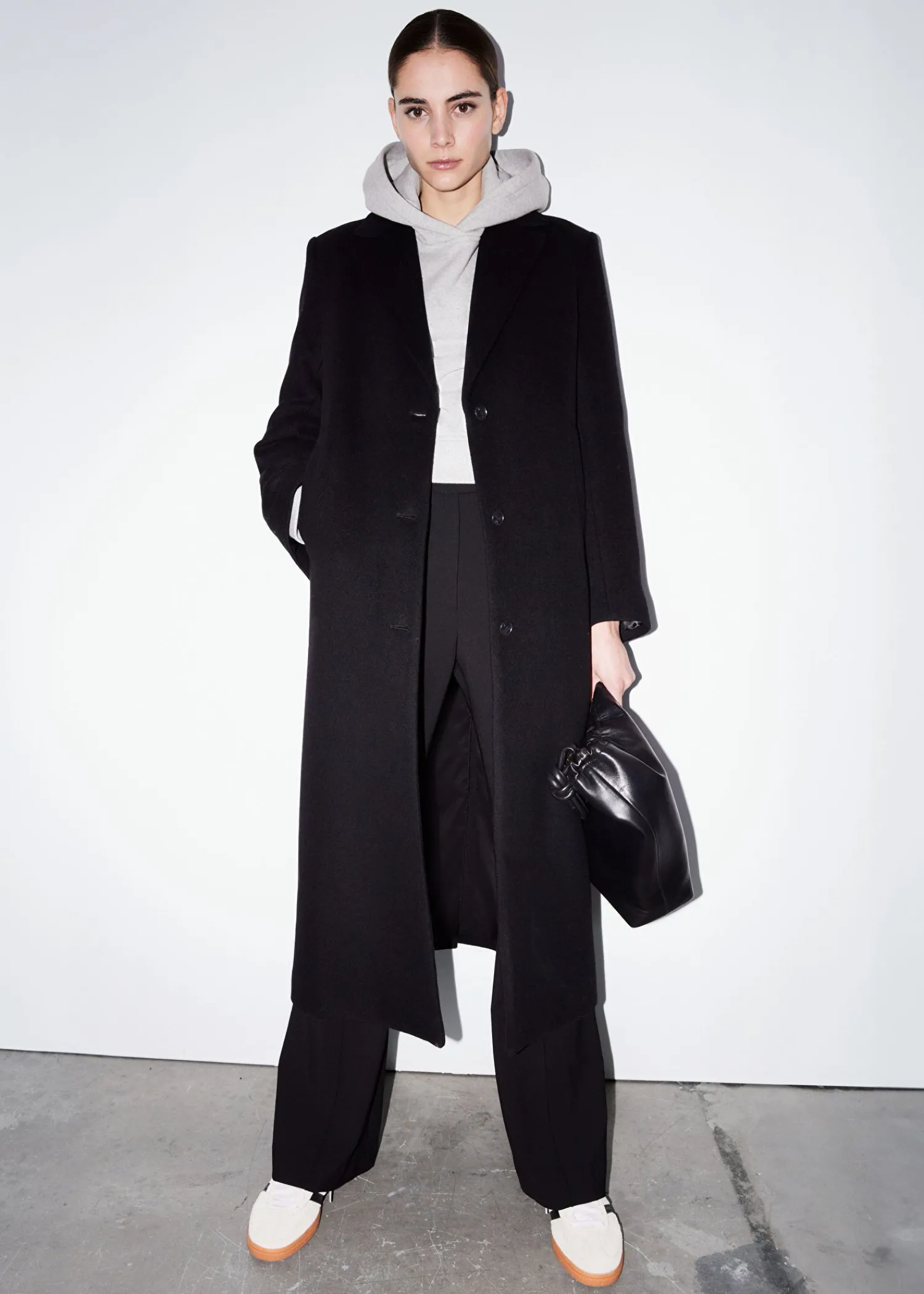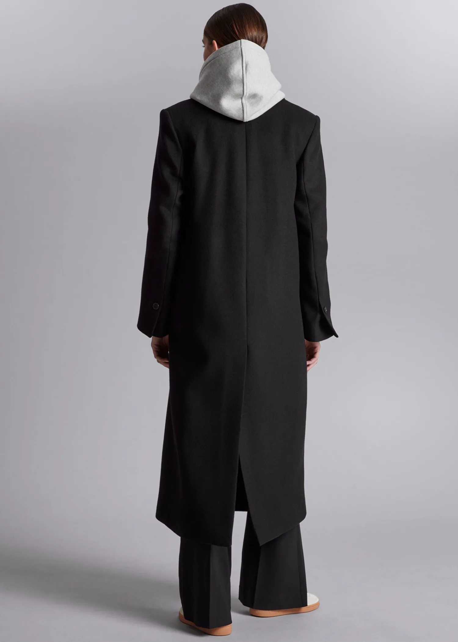 Lang Enkeltradet Uldfrakke Sporet Med Tre Knaplukninger. Bøjleløkke Duo Paspolerede Lommer Længde På Frakken: 125,5 Cm / 49,4″ (Størrelse S)