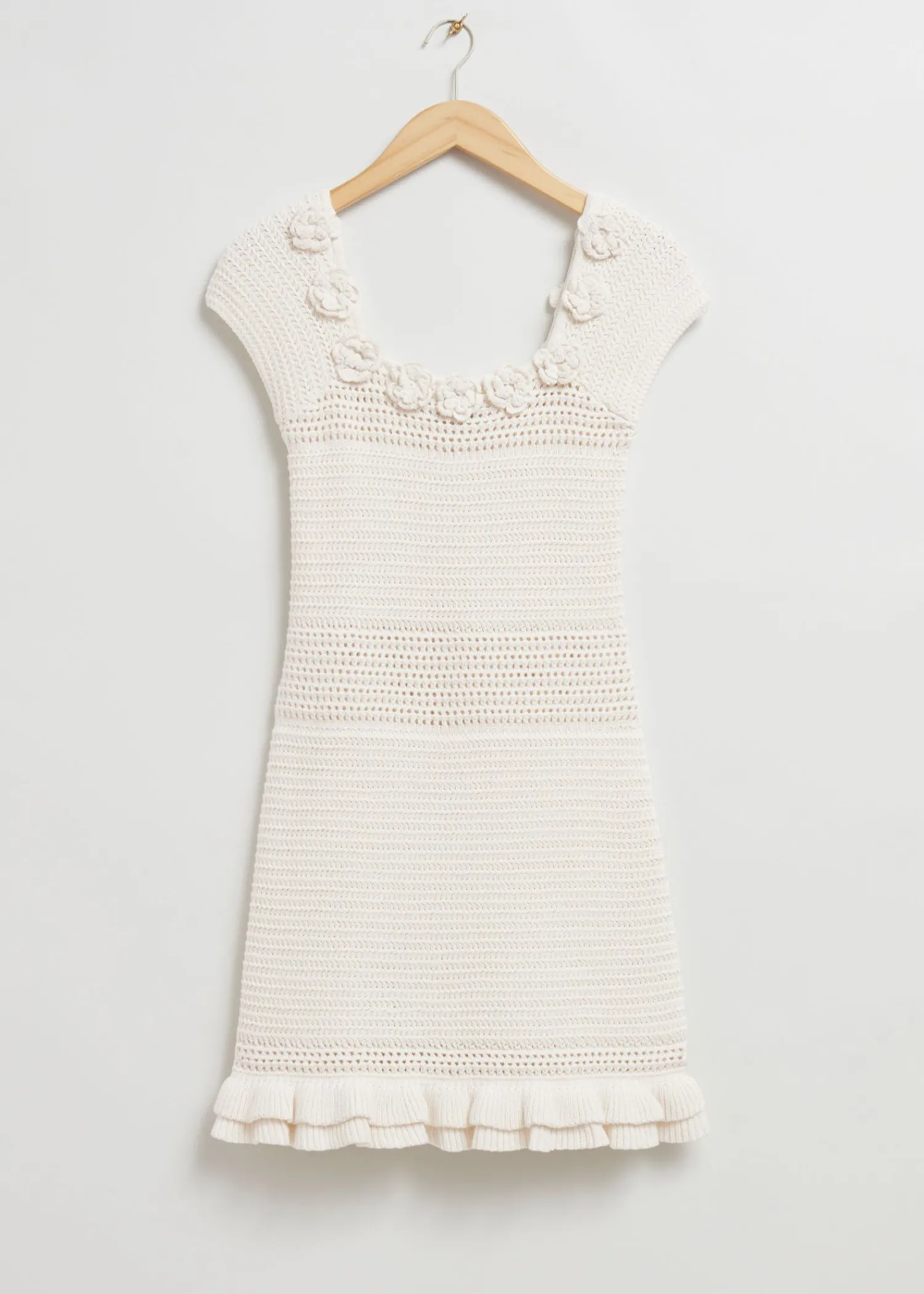 Hæklet Minikjole Designet Med En Rund Halsudskæring Prydet Med Skulpturelle Hæklede Blomster, Kasketærmer Og En Flæsekant I En Kort Silhuet. Kjolens Længde: 82 Cm / 32,3″ (Størrelse S)