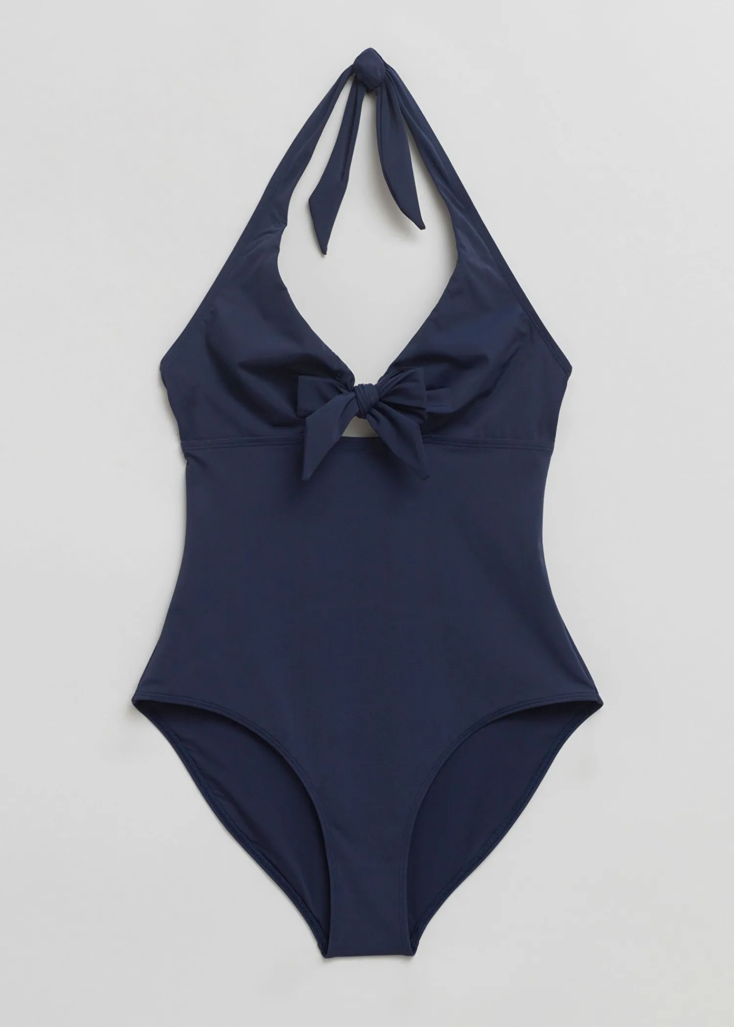 Halterneck-Badedragt Med Udskårne Detaljer, Sløjfer Og Åben Ryg. Afsluttet Med Almindelig Stigning, Middækning Og Bindelukning I Nakken.
