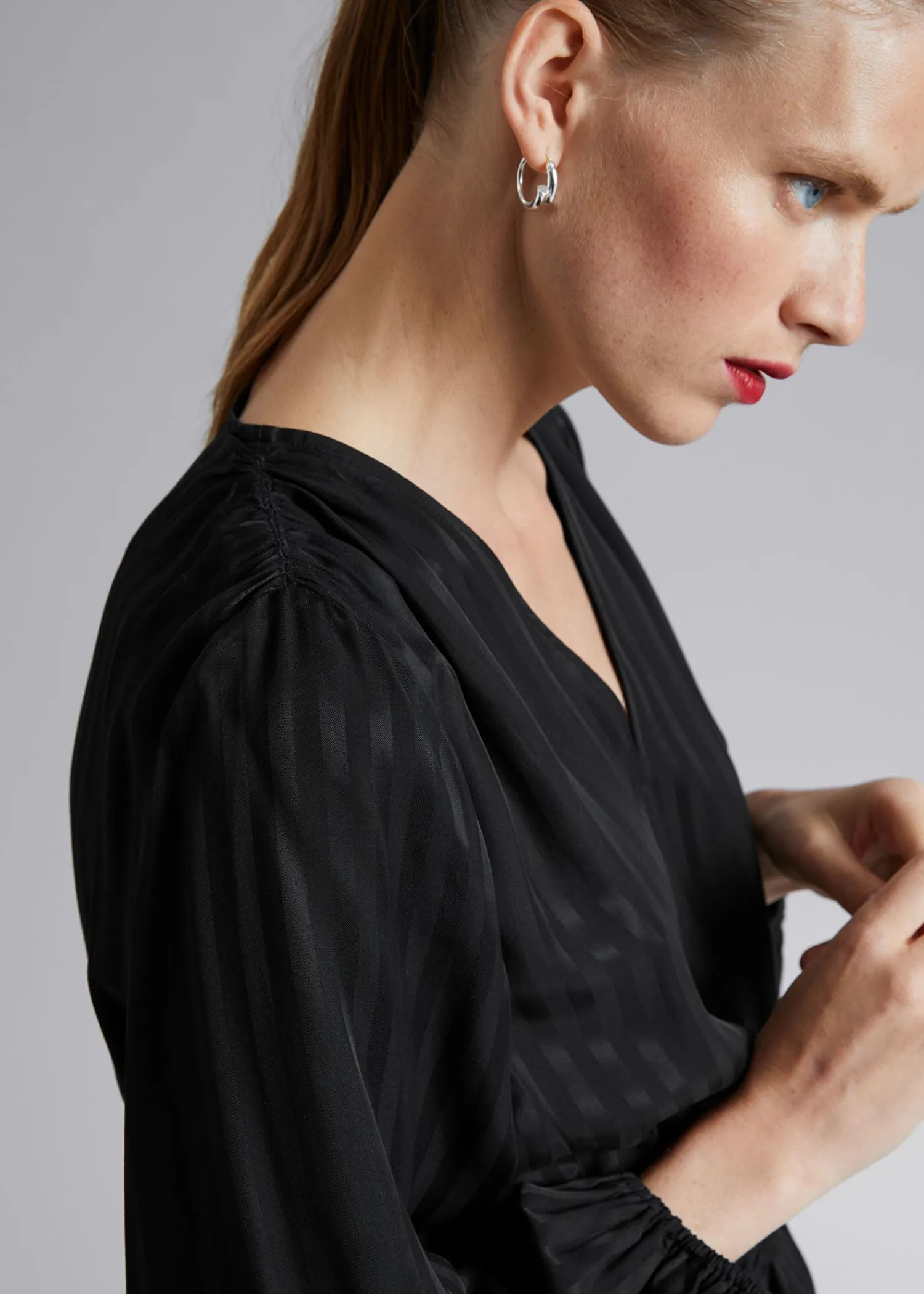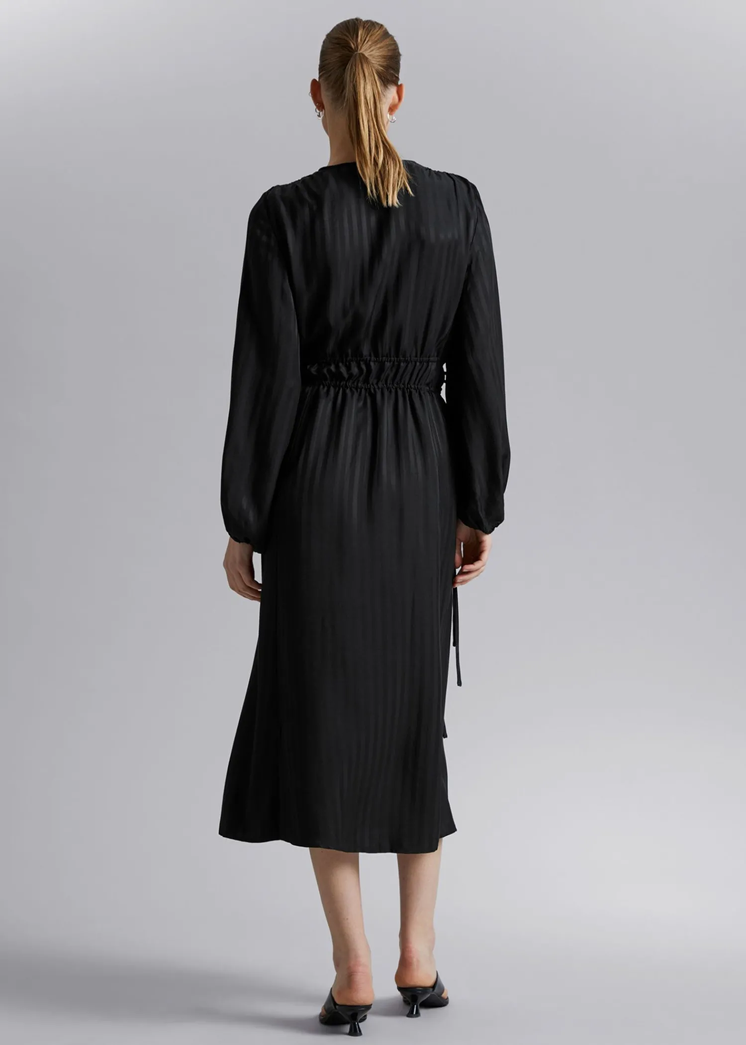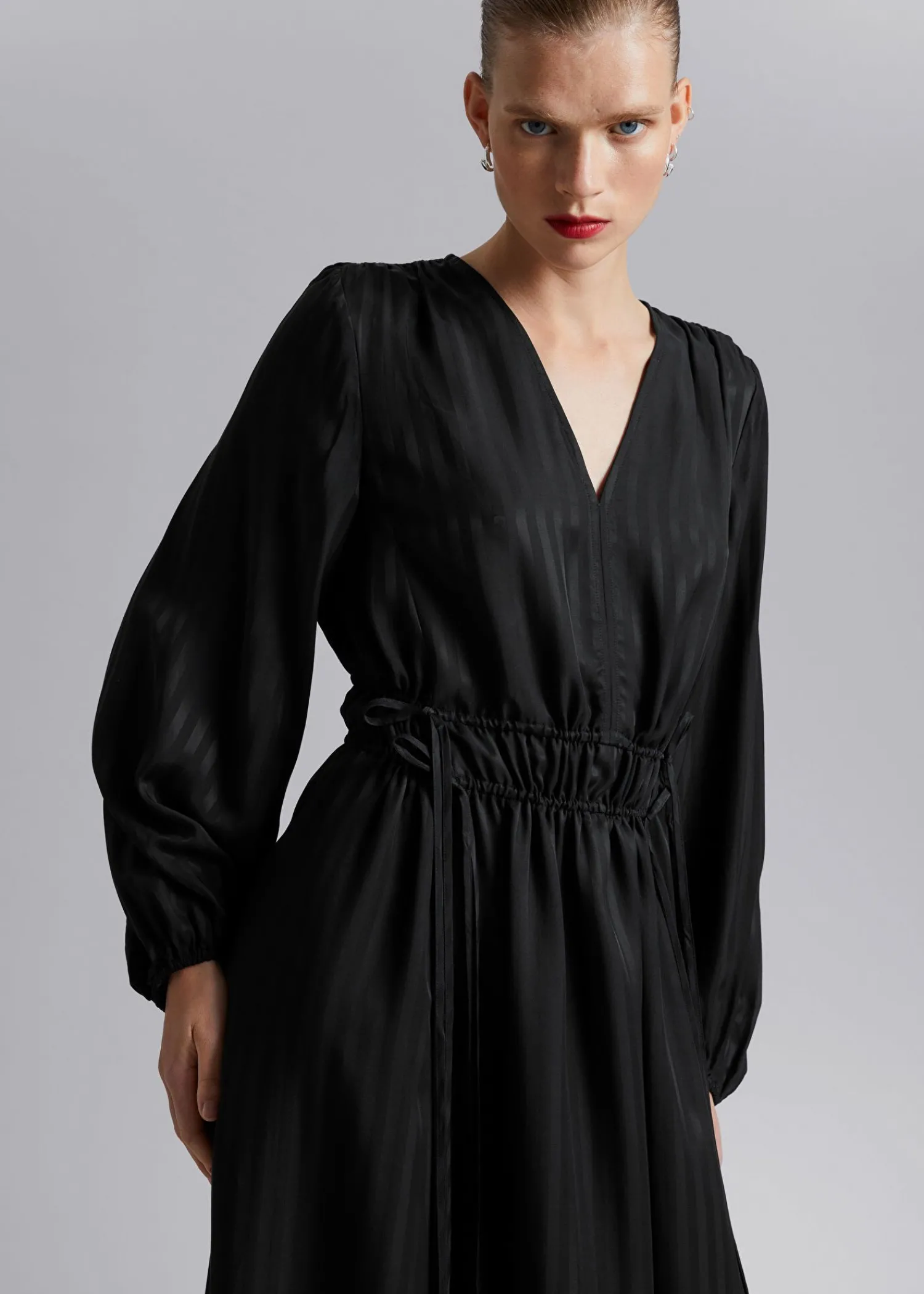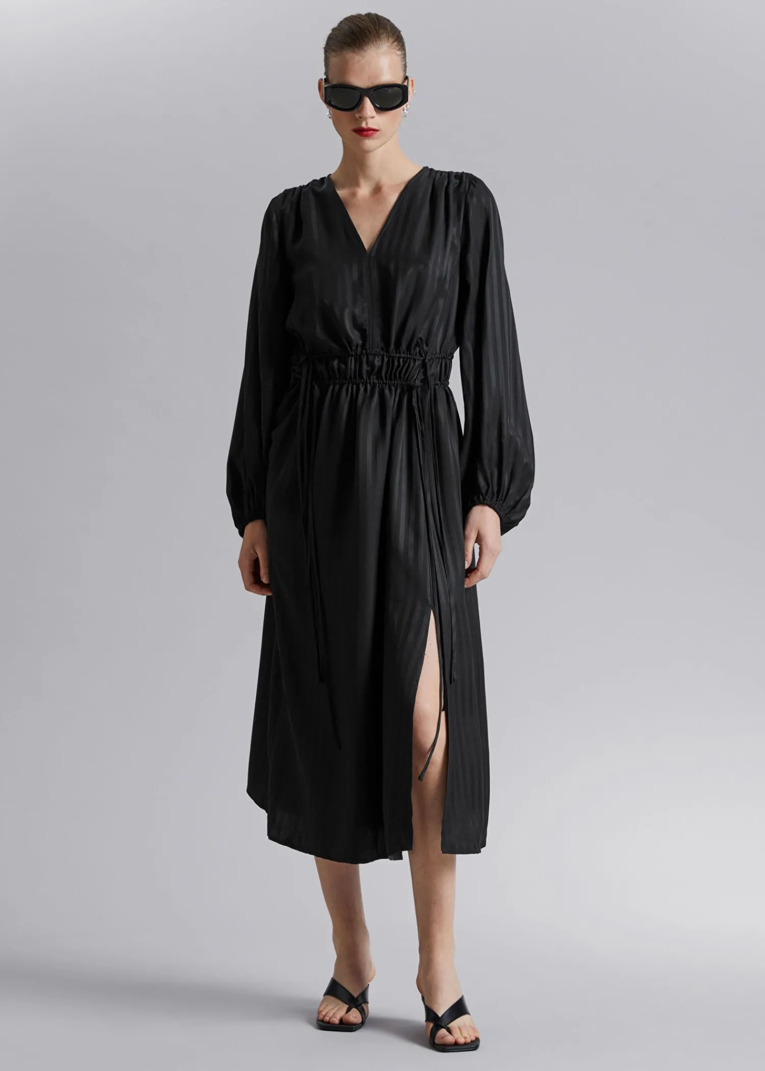 Løst Pasform Kjole Lavet Af Glat Vævet Stof. Designet Med V-Udskæring Og Rynket Talje Med Snøredetaljer. – Løs Pasform, Midi Længde – Elastiske Manchetter – Front Slids Længde På Kjolen: 127 Cm / 50″ (Eu 36 / Uk 8 / Us 4) Stockholm Er Hjemsted For Vores Mest Minimalistiske Stilarter.