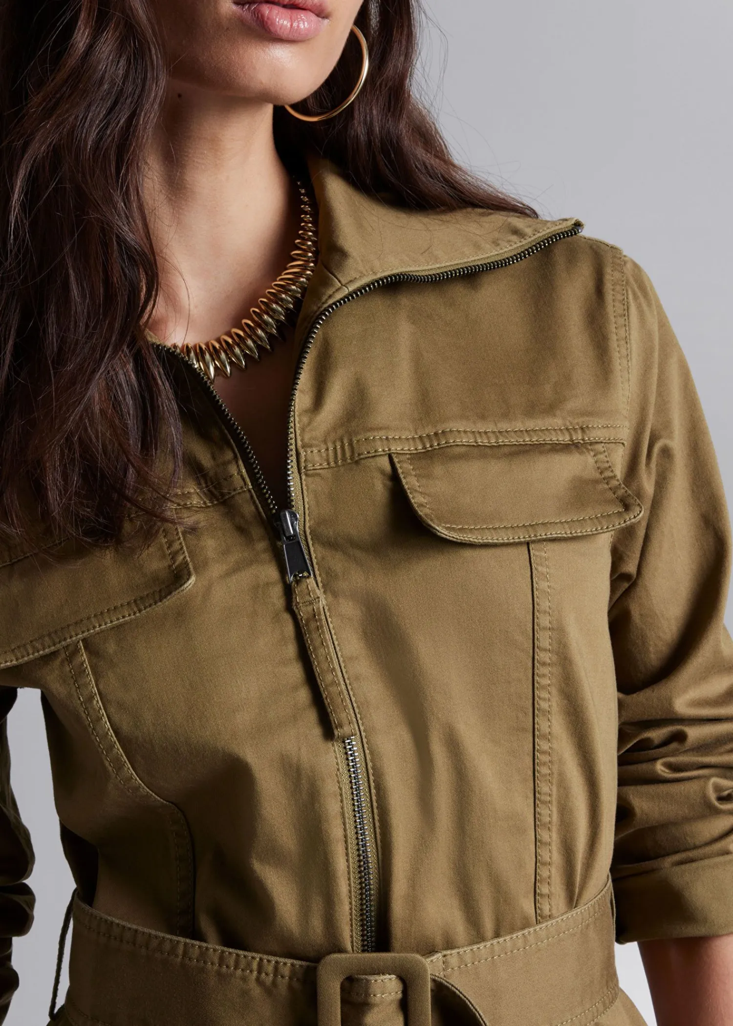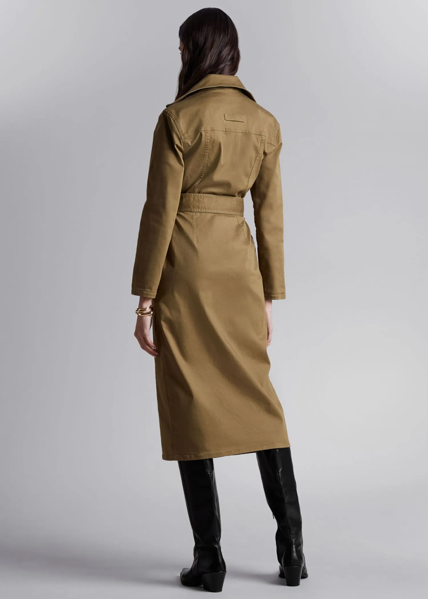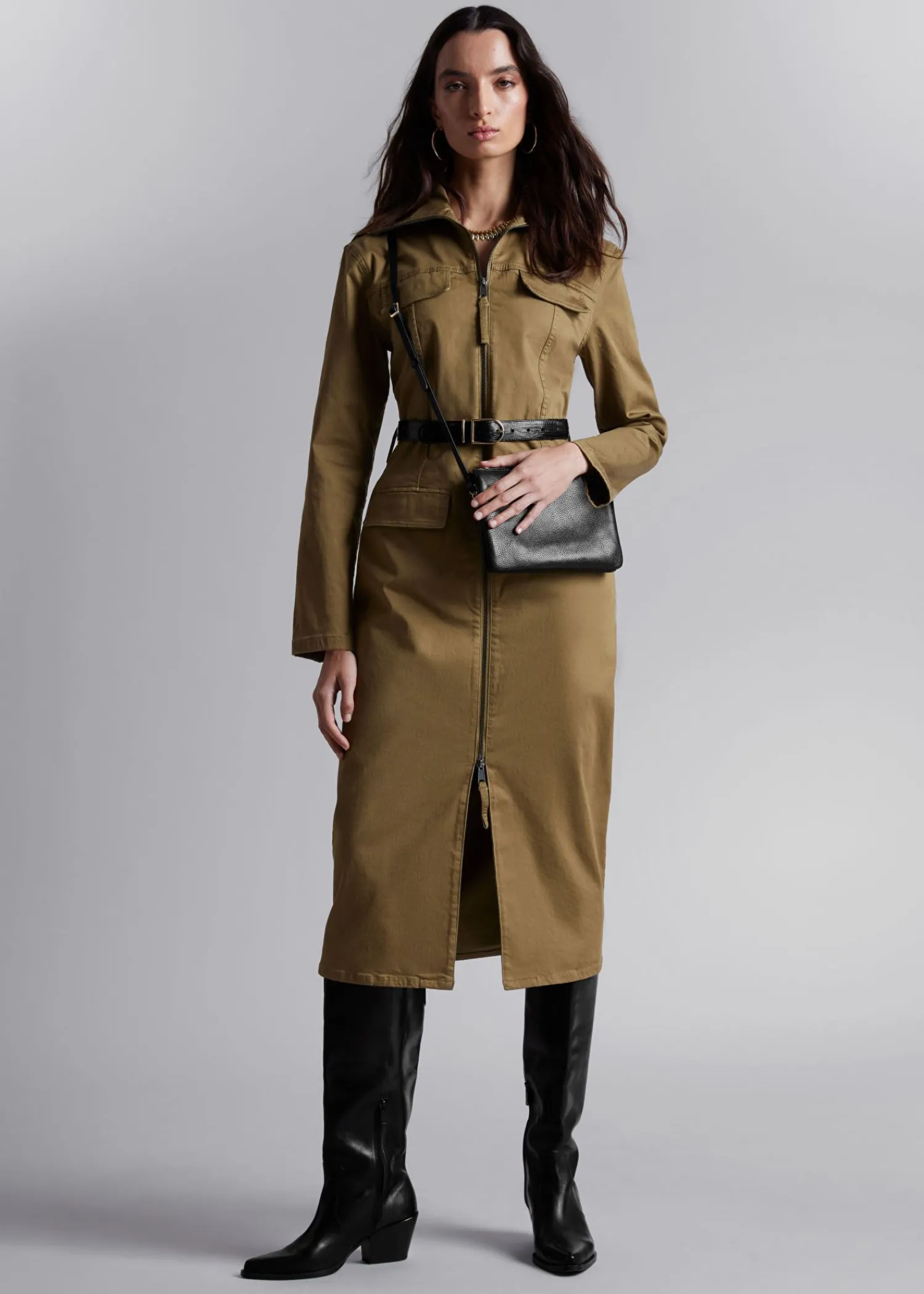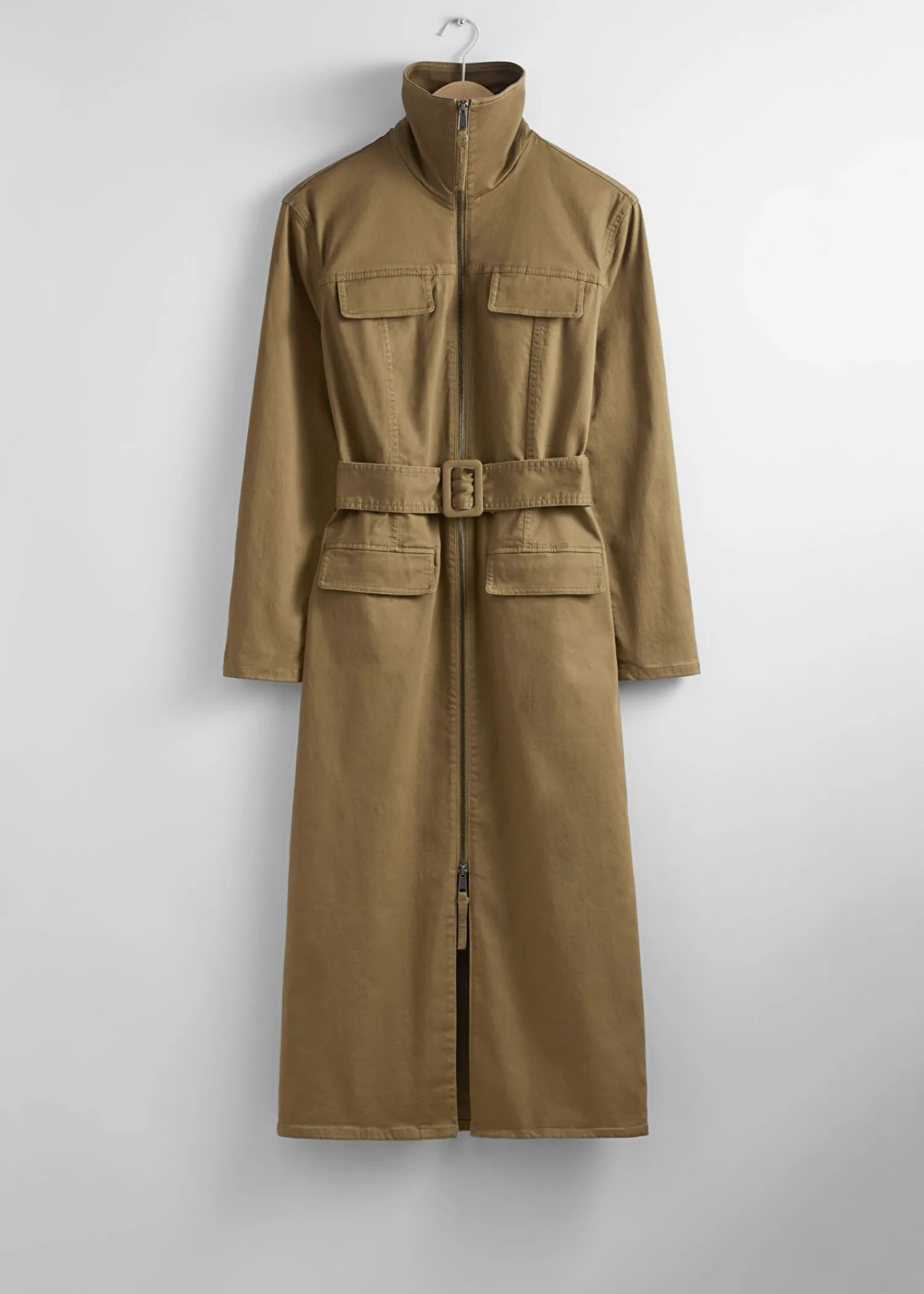 Langærmet Midikjole Med En Arbejdsbeklædningsfinish. Lukkes Med To-Vejs Lynlås Og D-Ring Bælte. Slim Fit Høj Krave To Påsyede Lommer På Brystet Og To På Hofterne Længde På Kjolen: 121,5 Cm / 47,8″ (Eu 36 / Uk 8 / Us 4)