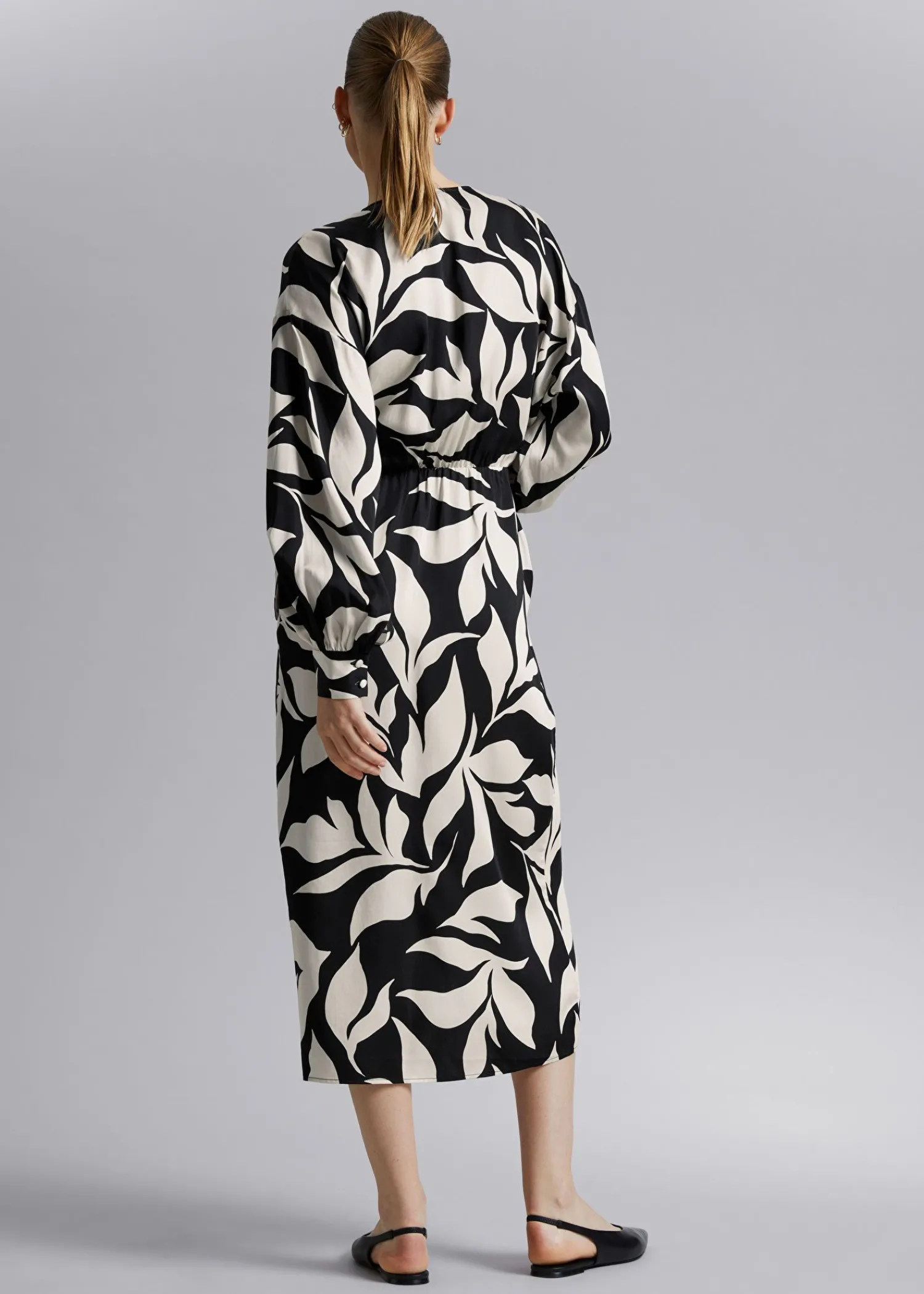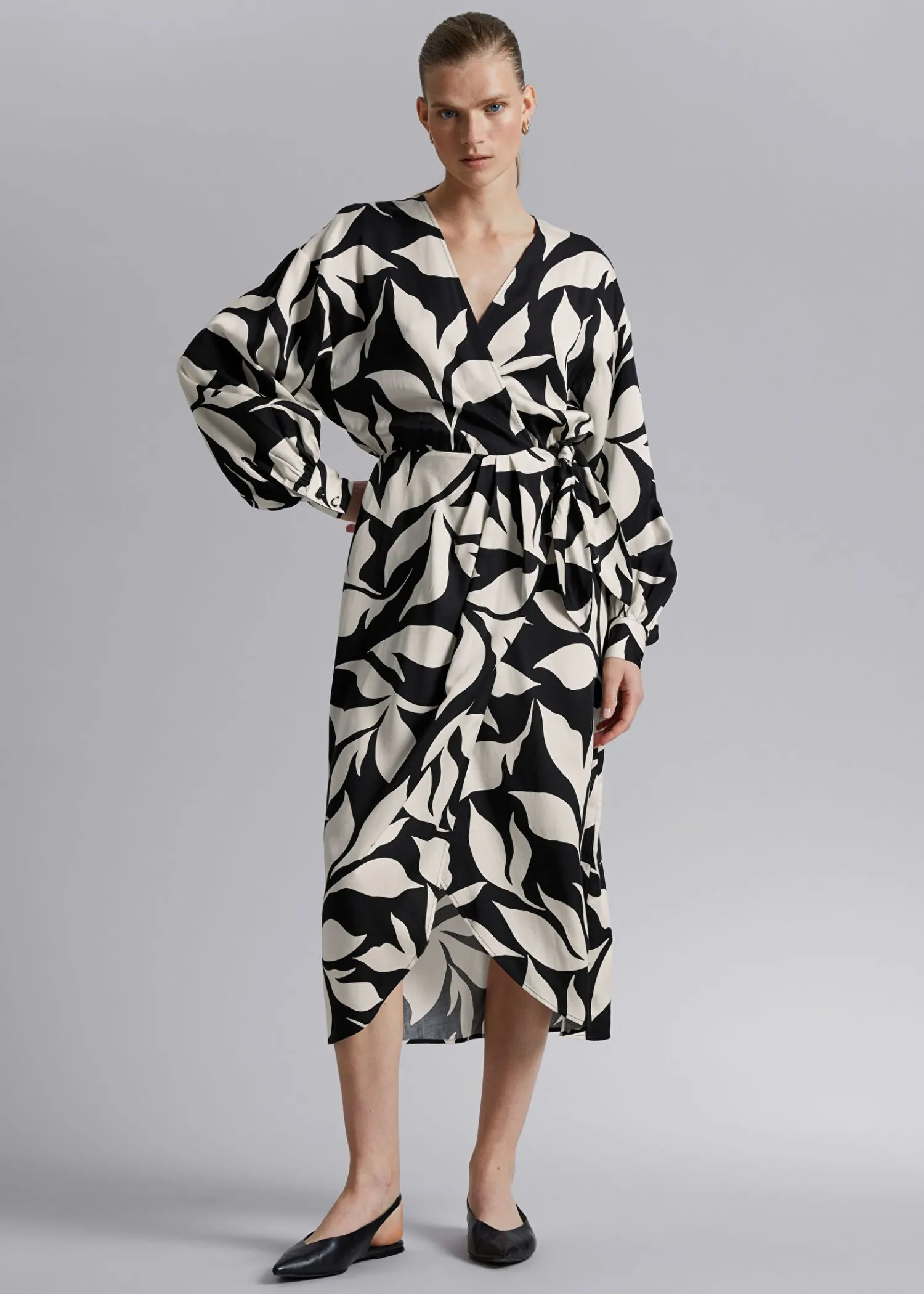 Omslagskjole Med V-Udskæring Lavet Af Blødt, Silkeagtigt Tekstureret Stof. Designet Med Lange Voluminøse Blousonærmer Og En Justerbar Slå-Om-Talje Med En Draperet Nederdel Med En Afrundet Tulipankant I Midi-Længde. – Normal Pasform – Elastik I Taljen – Manchetter Med Knapper Længde På Kjolen: 132 Cm / 52″ (Eu 36 / Uk 8 / Us 4) Luksuriøst Og Tilbagelænet Opsummerer Vores Looks Fra Los Angeles.