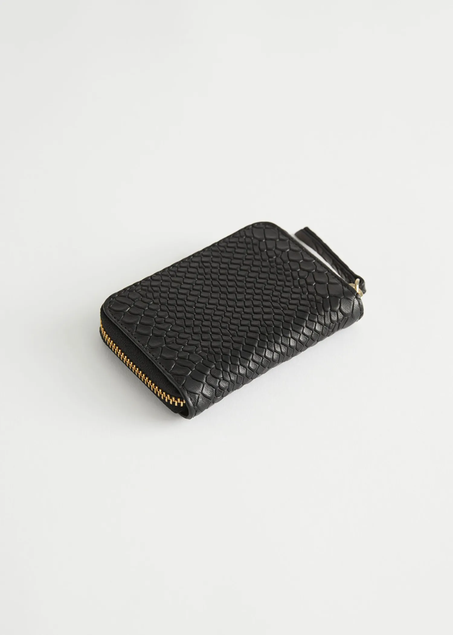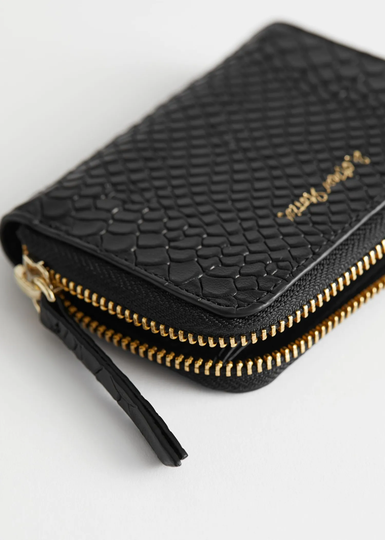 Slangepræget Læderpung Med To Rum Til Kort Og Mønter. Med En Guldfarvet Lynlåslukning Og Et ‘Andre Historier’-Logo. Mål På Tegnebogen: 11,5 Cm X 8 Cm 4,5″ X 3″