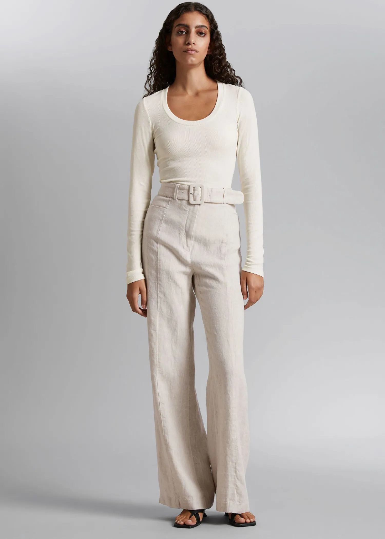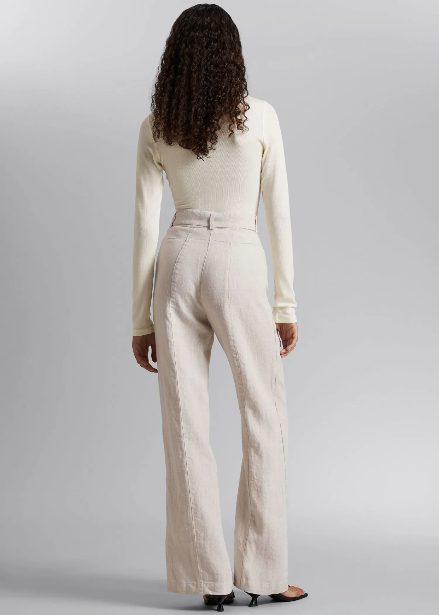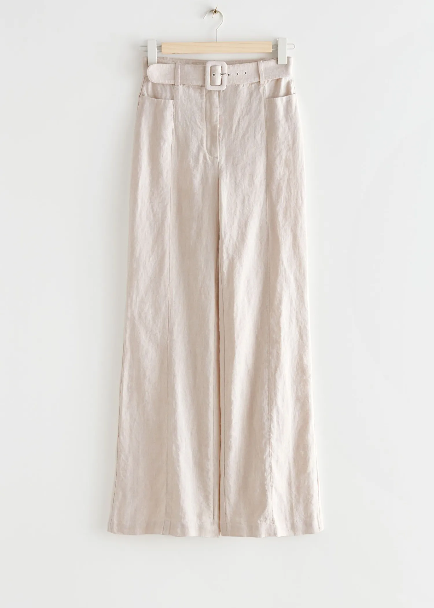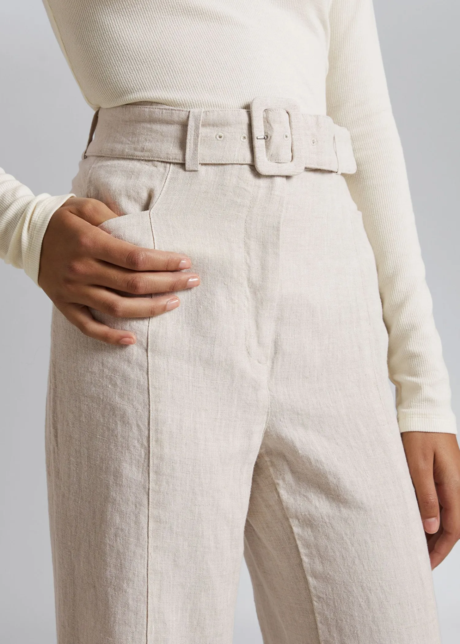 Udvidede Højtaljede Hørbukser Fastgjort Med Et Tonalt Bælte Med Spænde. Lynlåsgylp Med Krog- Og Stanglukning Duo Sidelommer Bæltestropper Længde På Indersøm: 82 Cm / 32,3″ (Eu 36 / Uk 10 / Us 4)