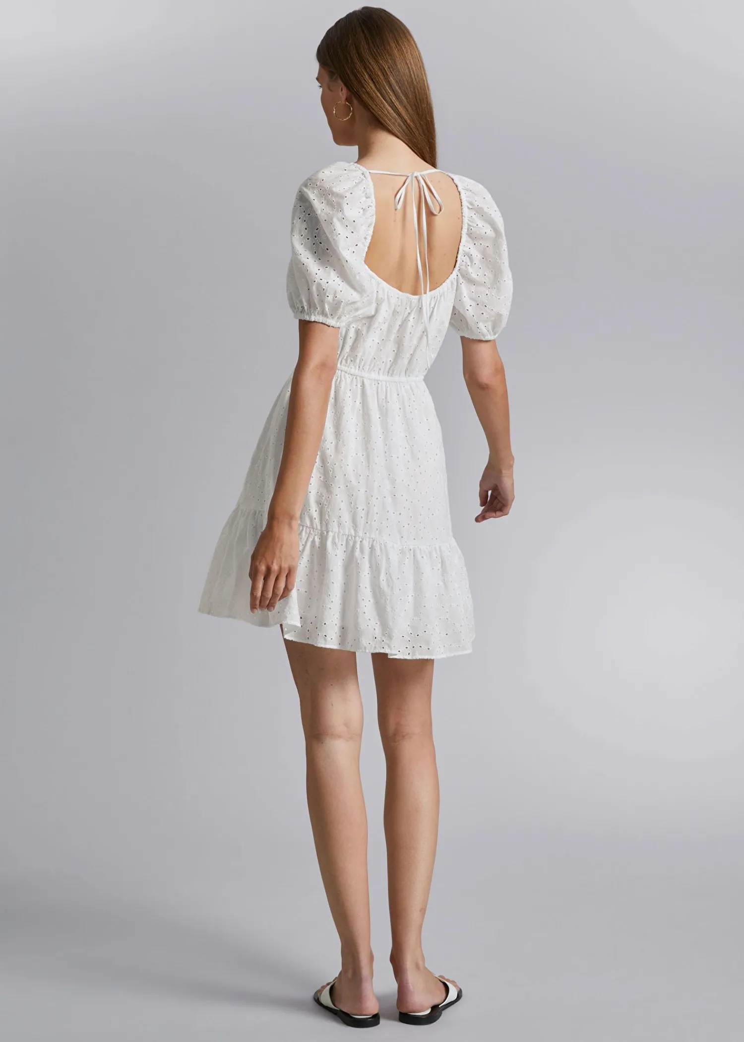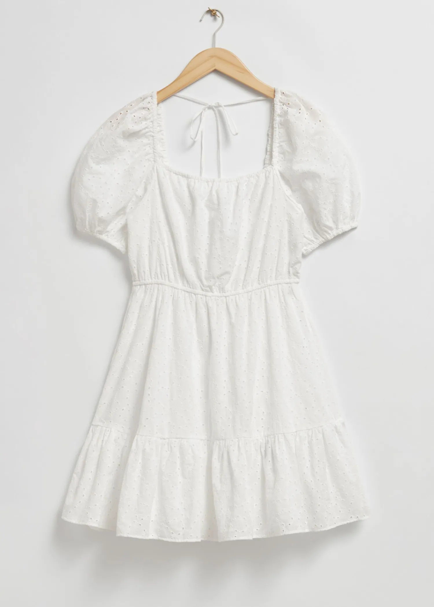 Voluminøs Broderie Aglaise Minikjole Lavet Af Bomuld. Designet Med Korte Pufærmer, En Firkantet Halsudskæring Dekoreret Med Et Allover Broderimønster, Der Er Fastgjort I Halsen Med Tynde Spaghettibånd, Med Et Flået Nederdel. Ryggen Er Lavt Skåret Med En Tynd Elastisk Kanal Langs Sømmen Og Rundt Om Taljen. Kjolens Længde: 64 Cm / 25,2″ (Eu 36 / Uk 8 / Us 4)