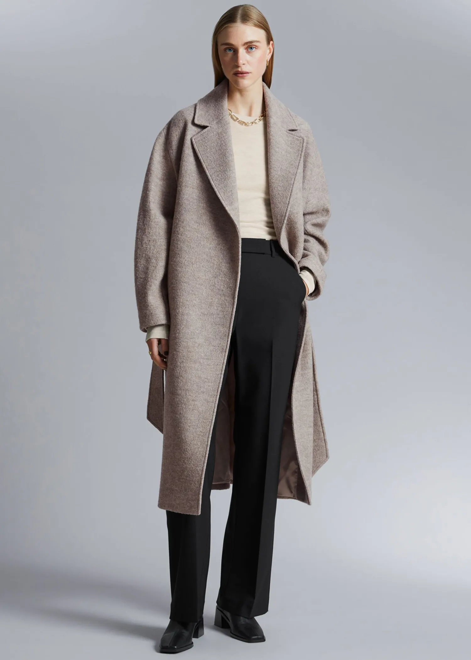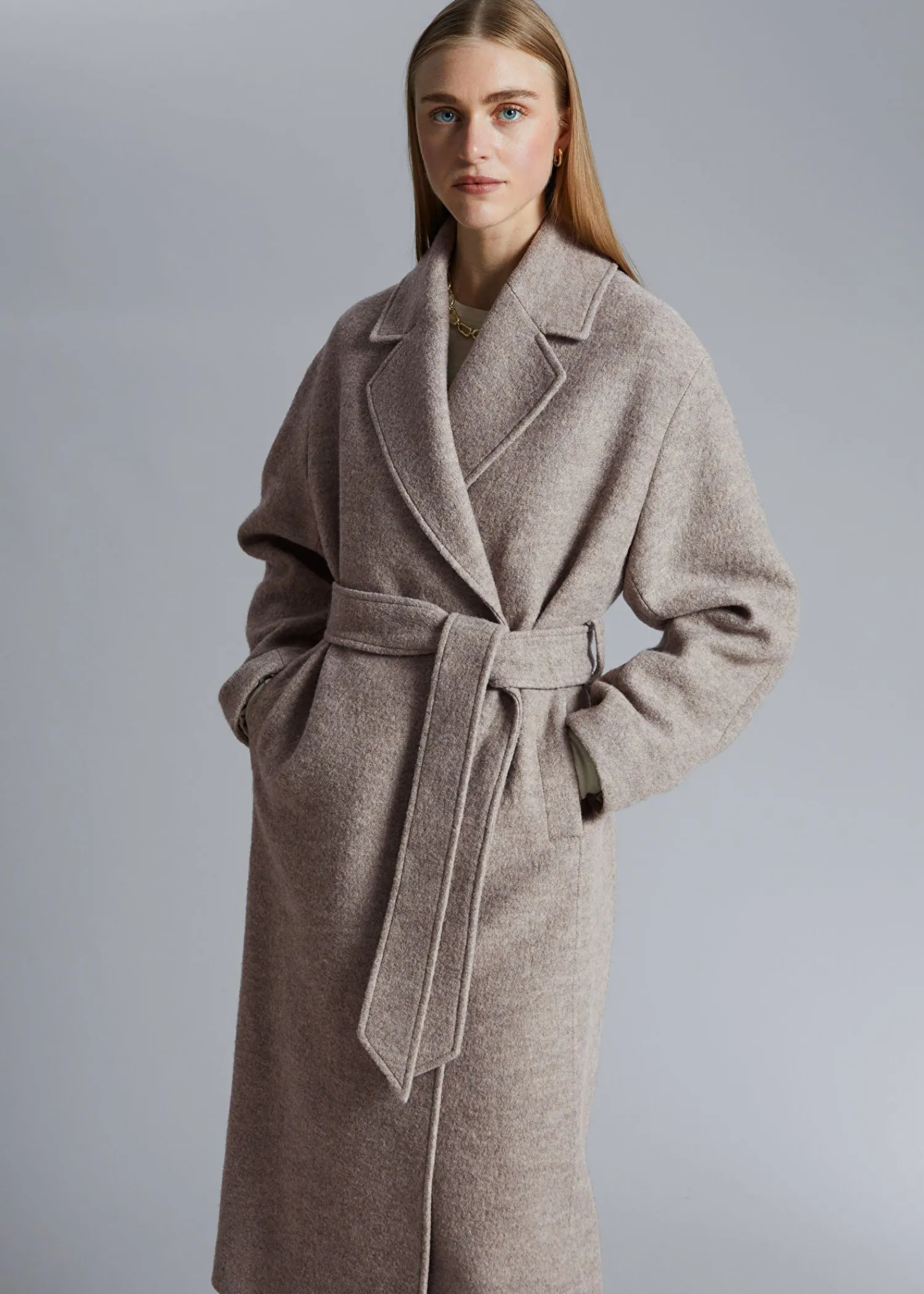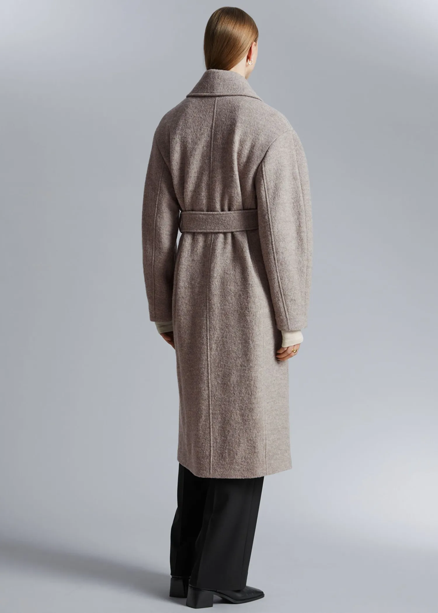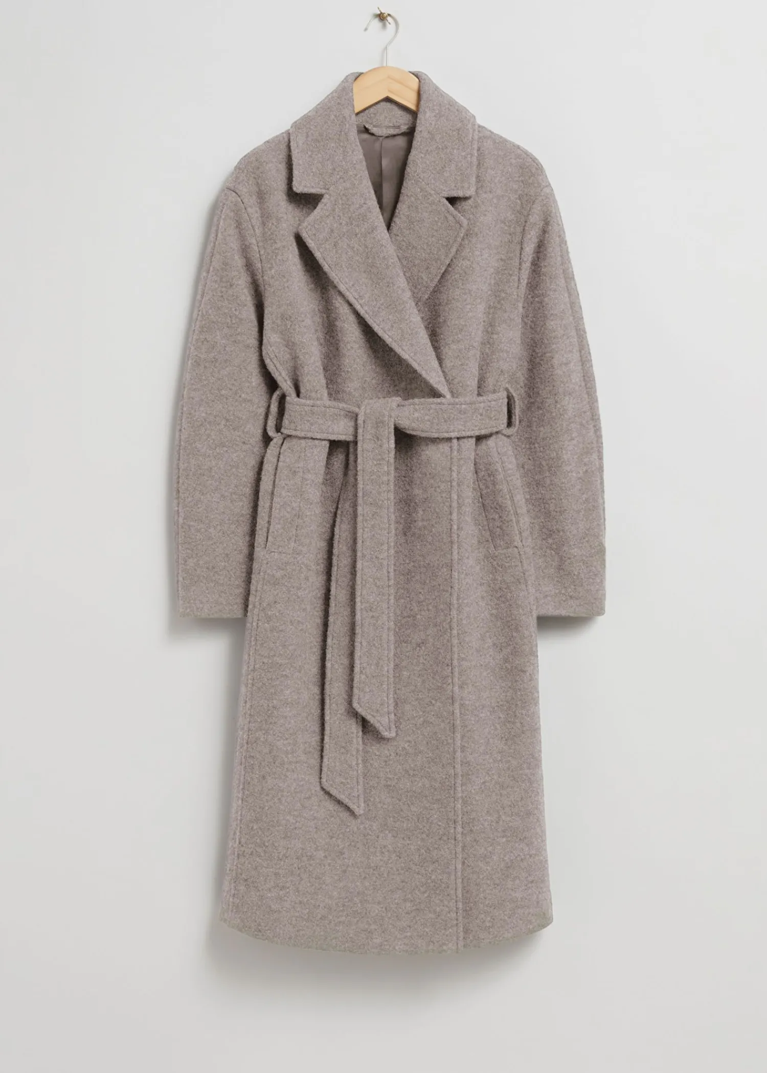 Voluminøs Uldfrakke Med Et Overlappende Revers. Afsluttet Med Et Tonalt Selvbindebælte. Duo Lommer Tre Skjulte Knaplukninger Certificeret I Henhold Til Responsible Wool Standard (Rw0063) Længde På Frakken: 116 Cm / 47,6″ (Størrelse S)