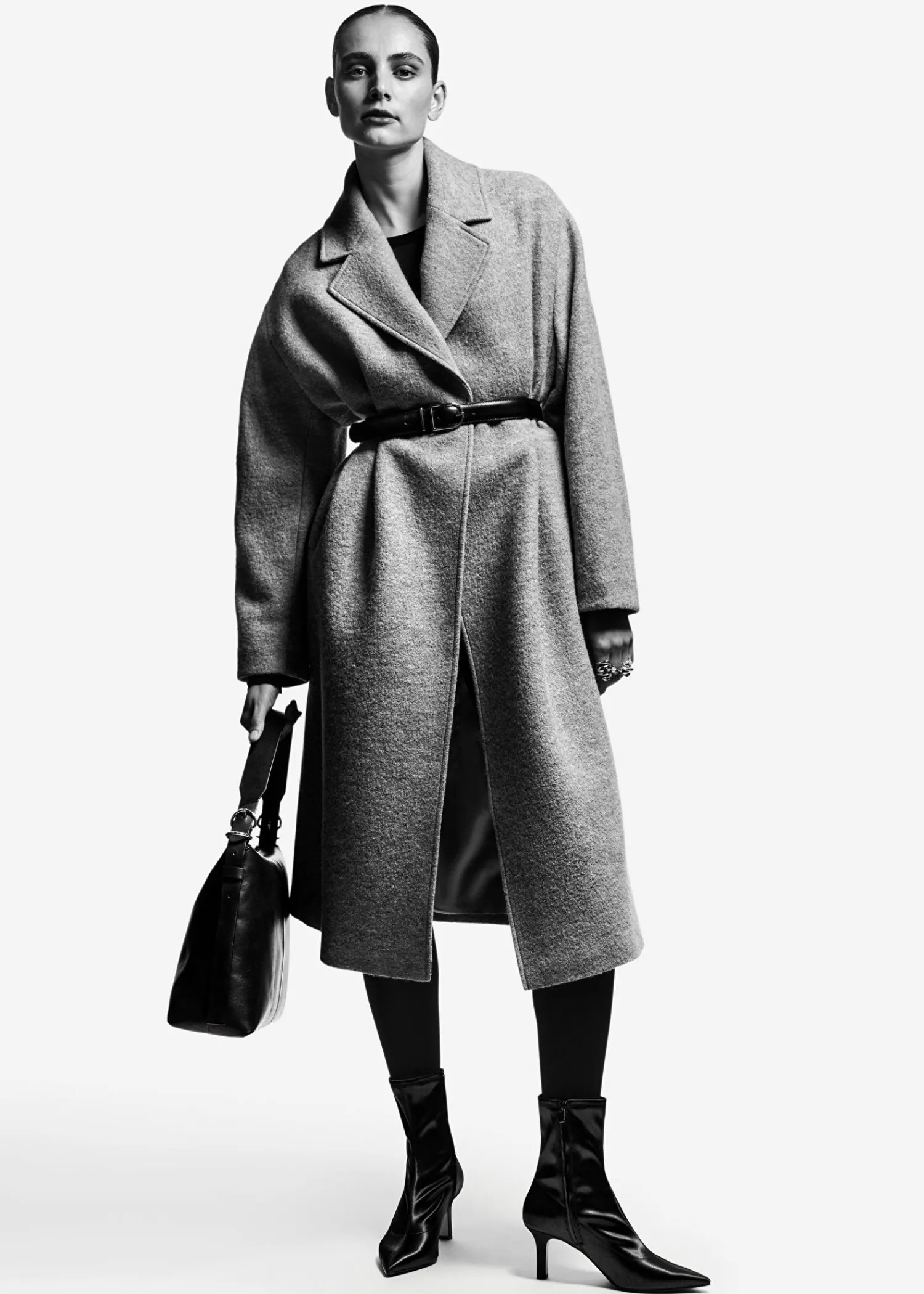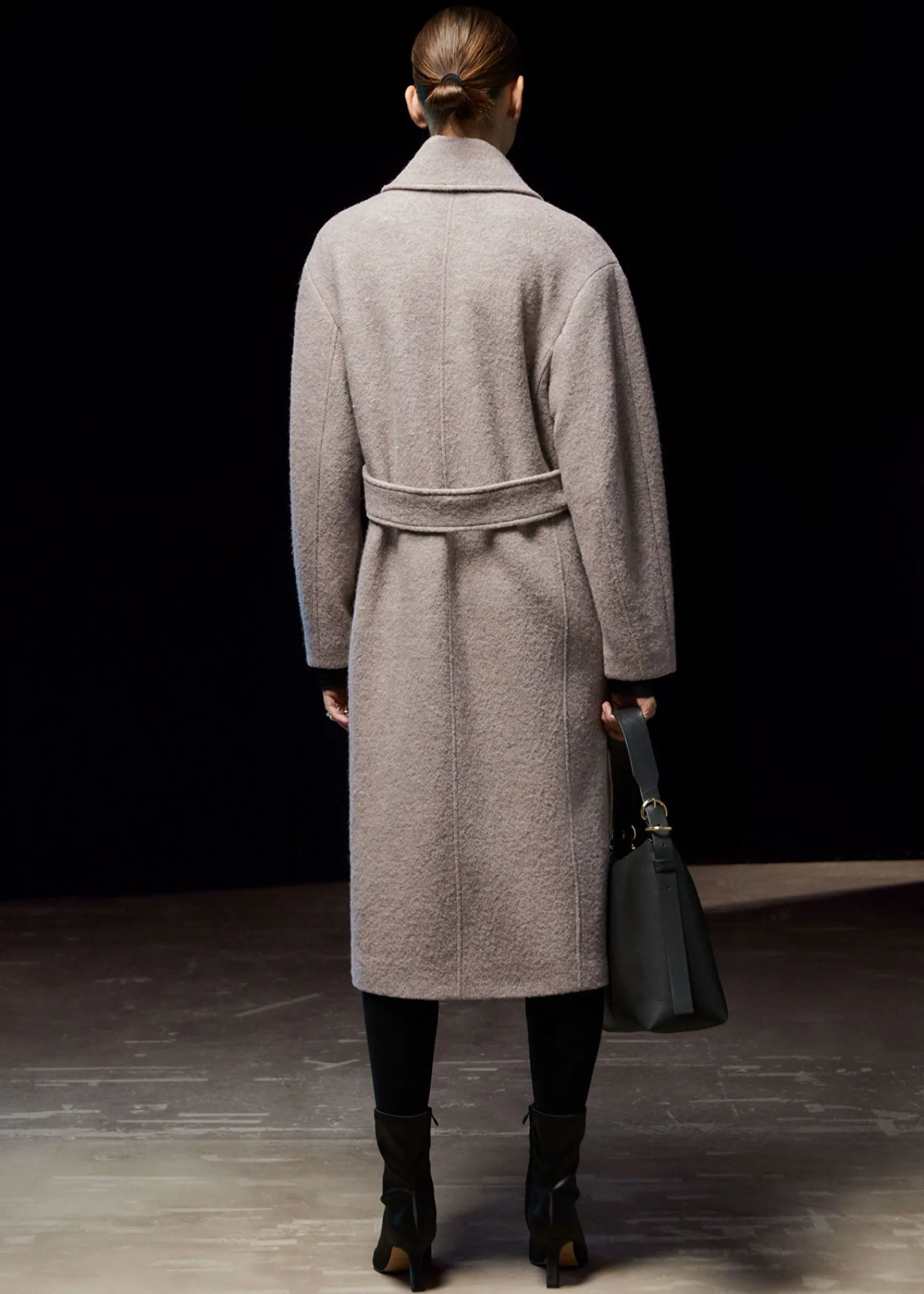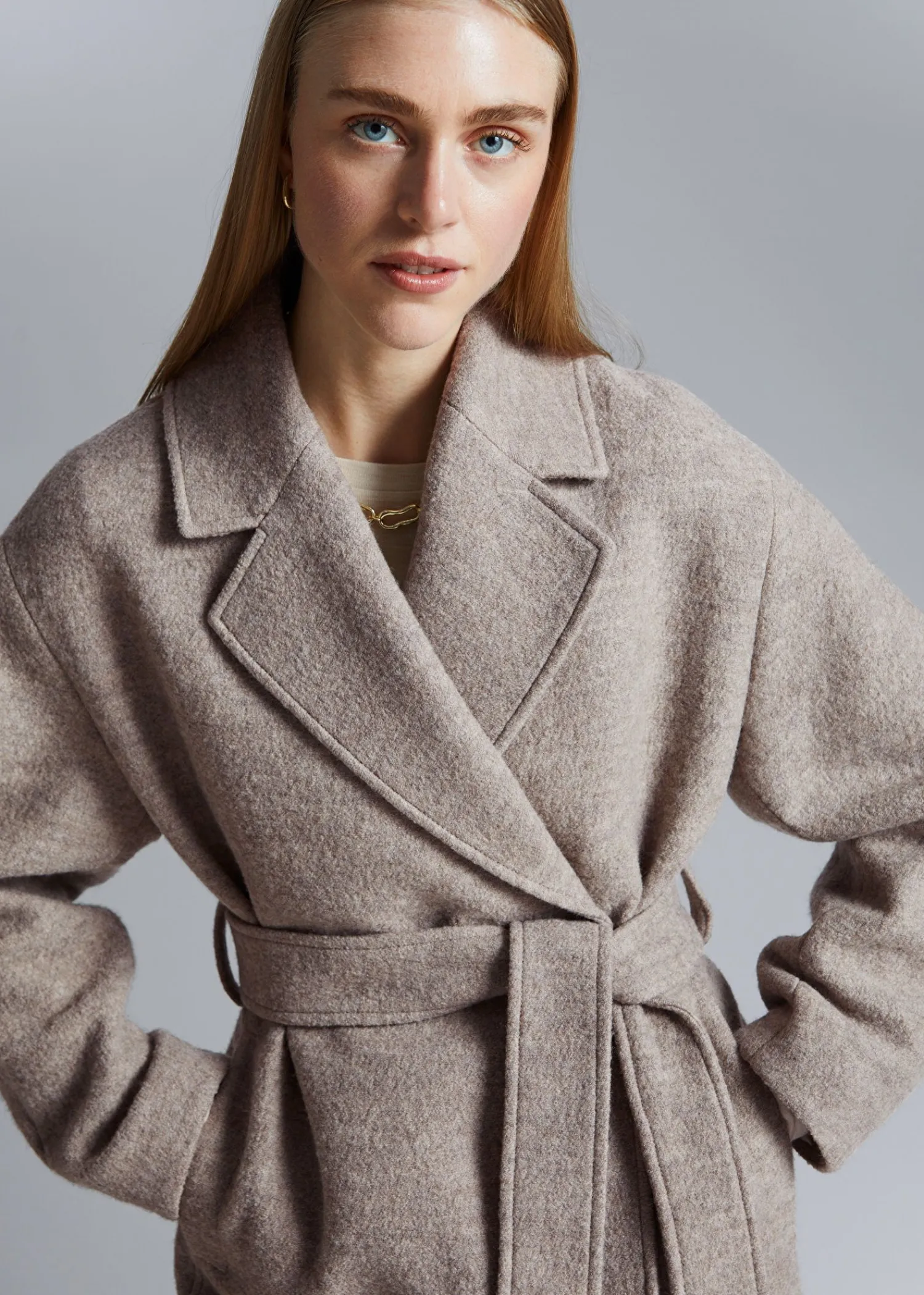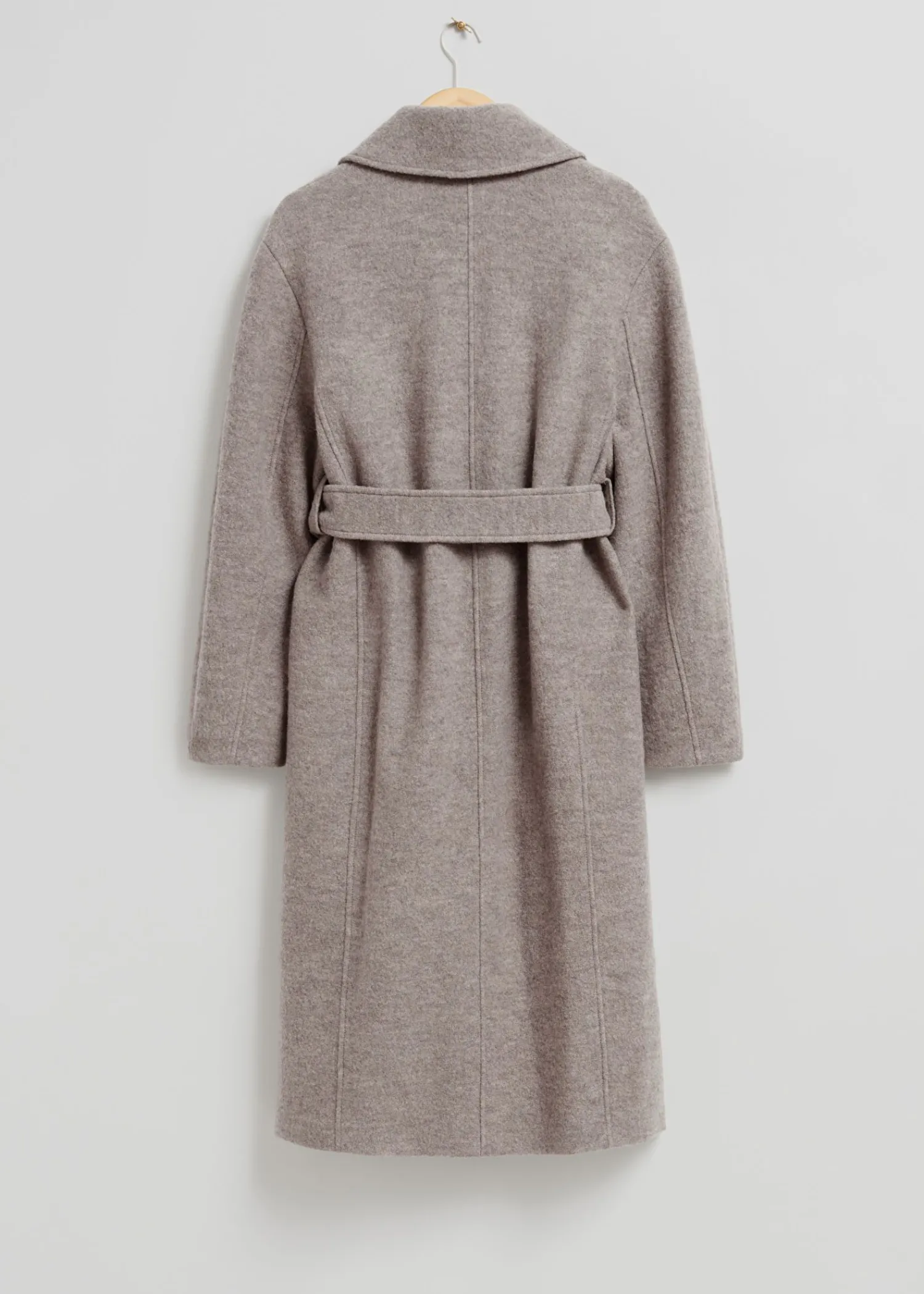Voluminøs Uldfrakke Med Et Overlappende Revers. Afsluttet Med Et Tonalt Selvbindebælte. Duo Lommer Tre Skjulte Knaplukninger Certificeret I Henhold Til Responsible Wool Standard (Rw0063) Længde På Frakken: 116 Cm / 47,6″ (Størrelse S)