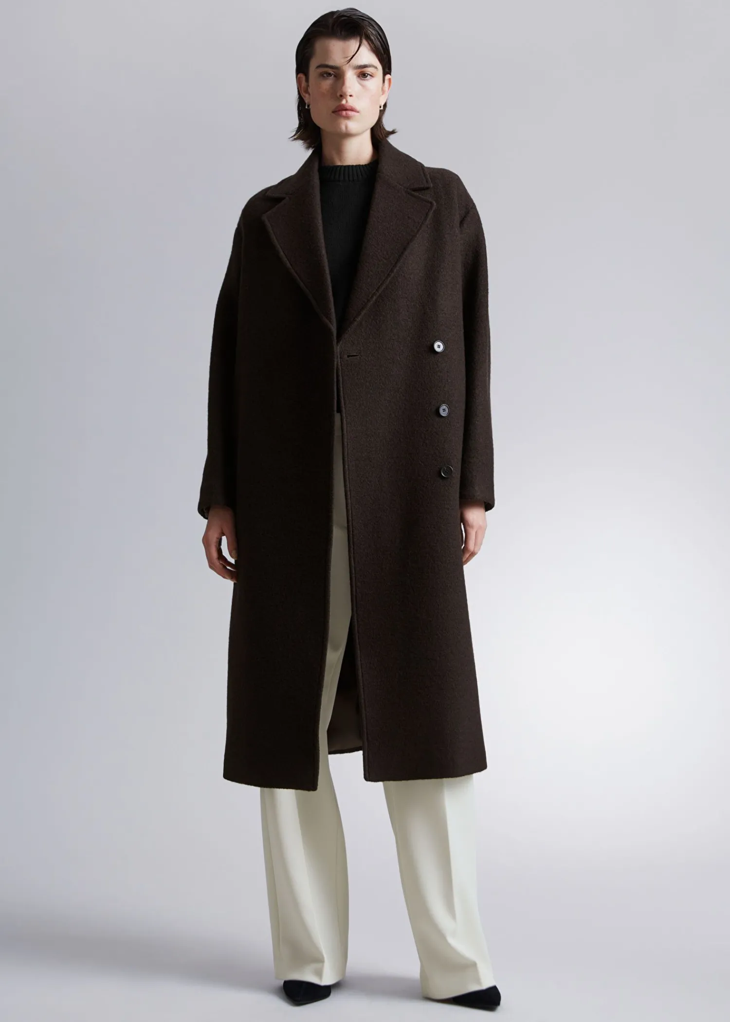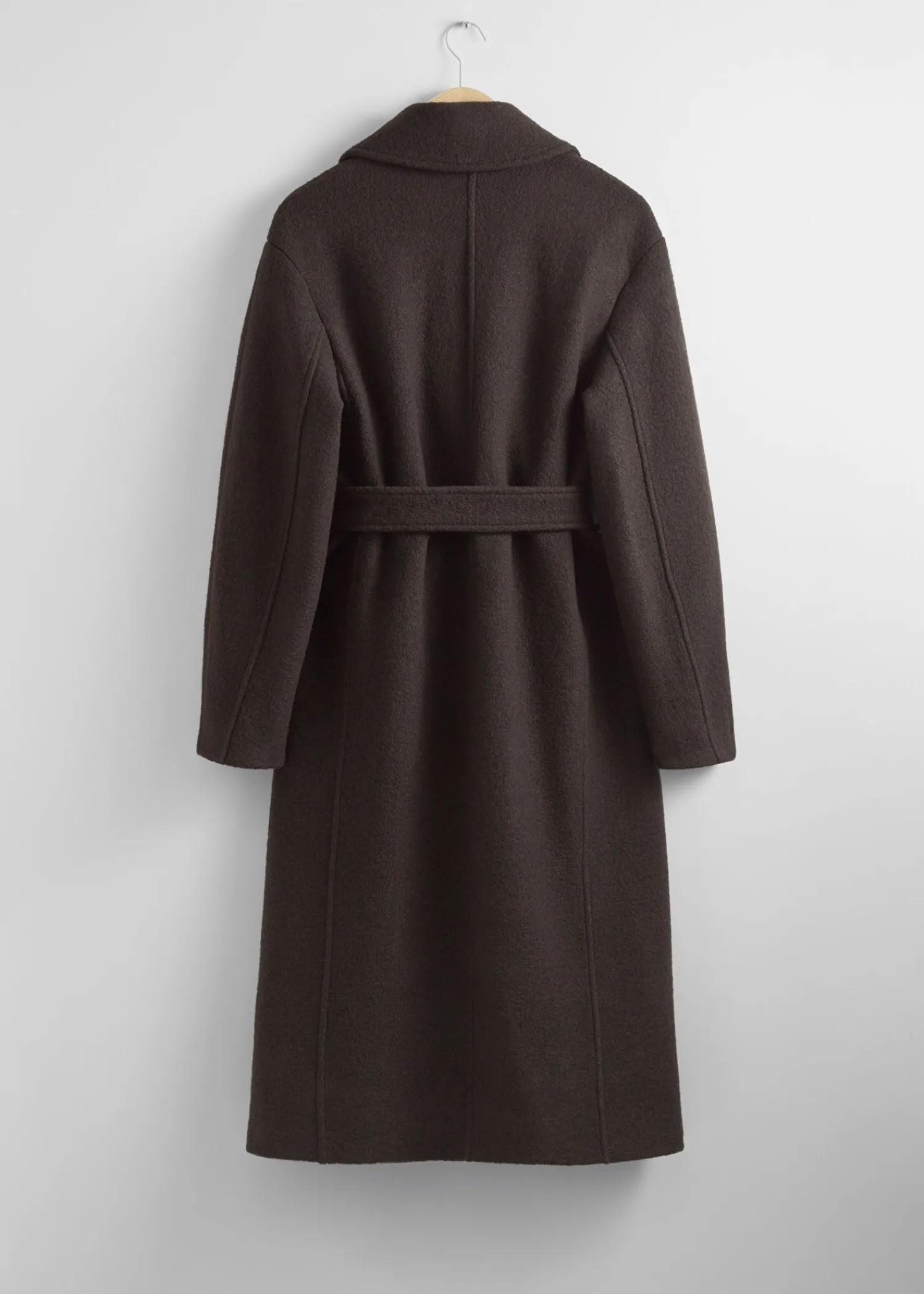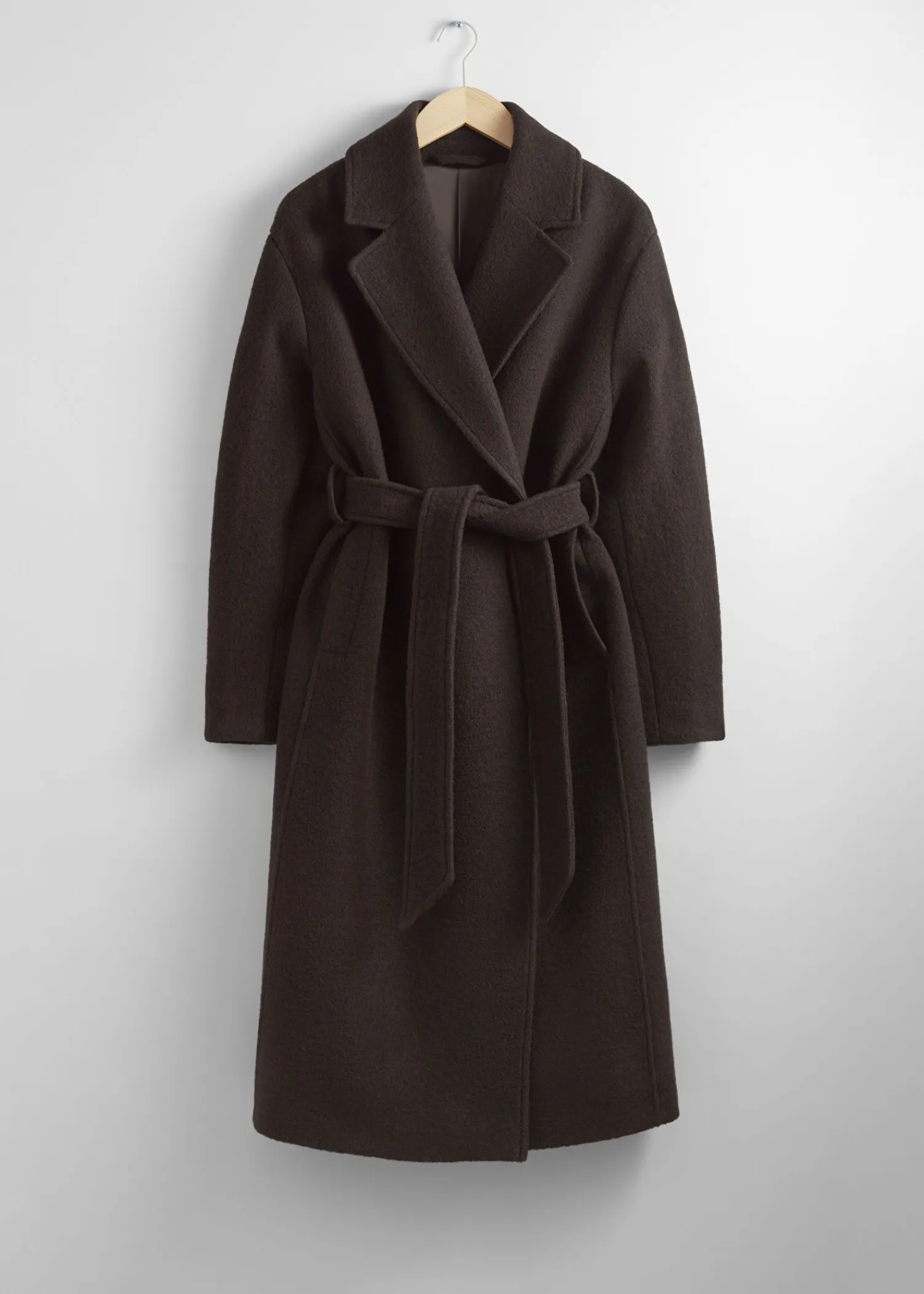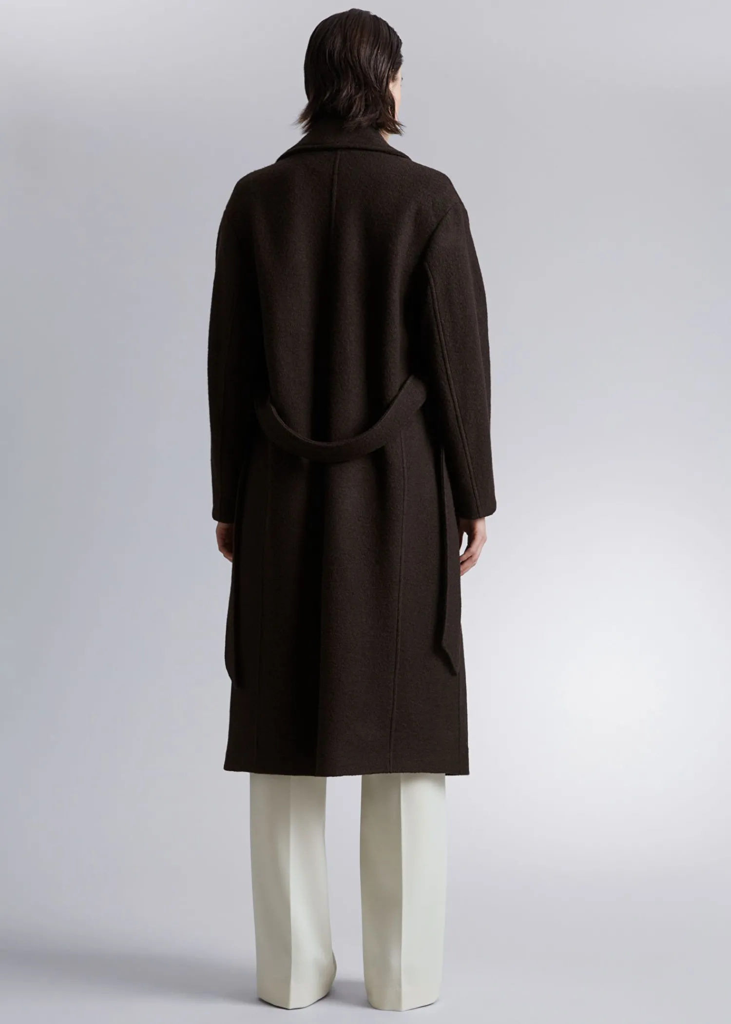 Voluminøs Uldfrakke Med Et Overlappende Revers. Afsluttet Med Et Tonalt Selvbindebælte. Duo Lommer Tre Skjulte Knaplukninger Certificeret I Henhold Til Responsible Wool Standard (Rw0063) Længde På Frakken: 116 Cm / 47,6″ (Størrelse S)