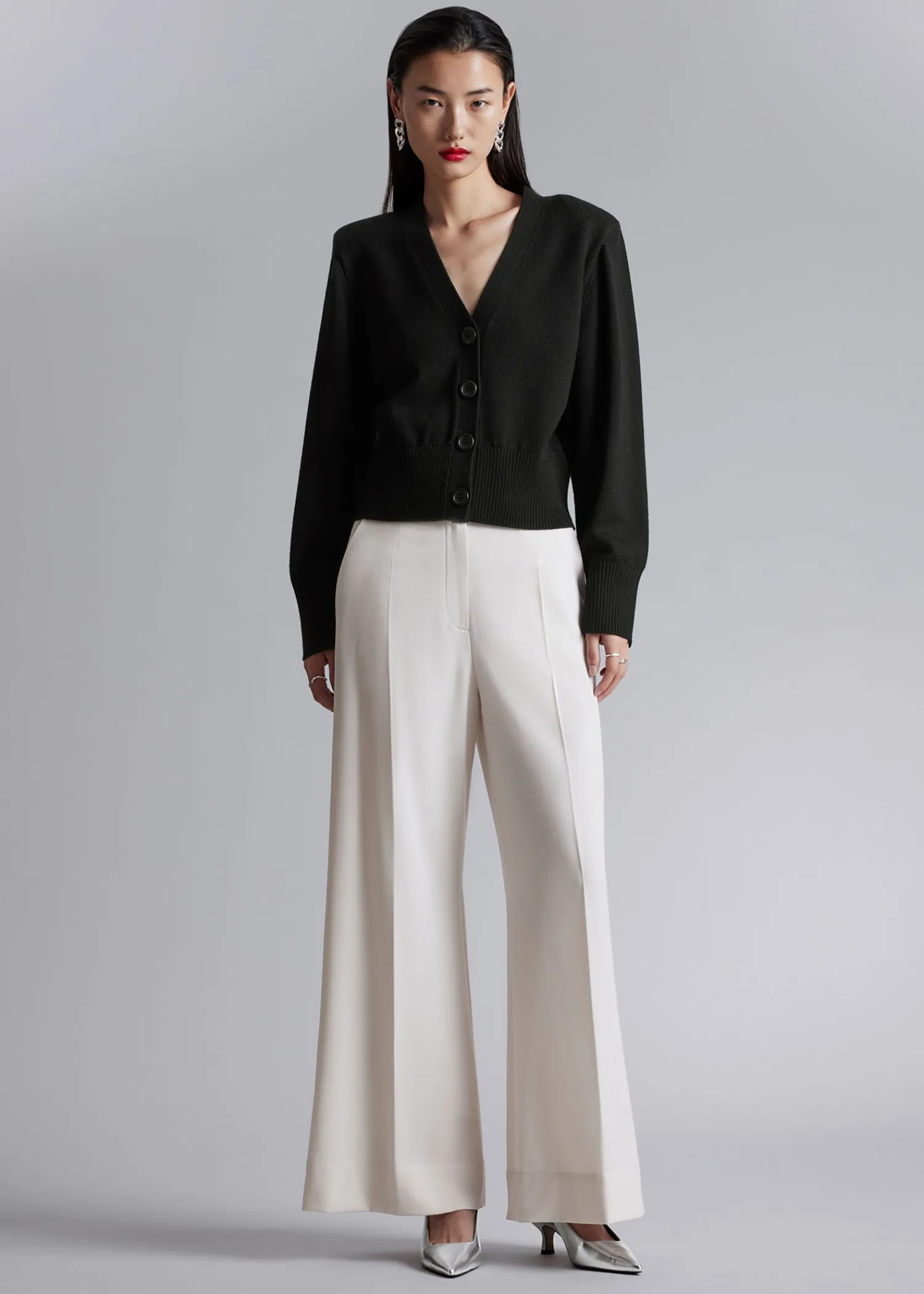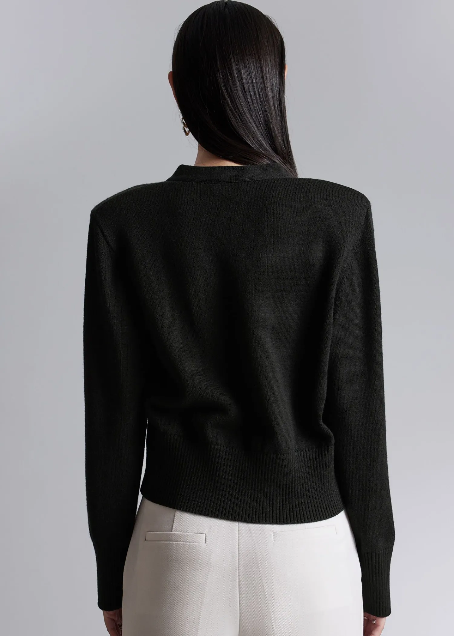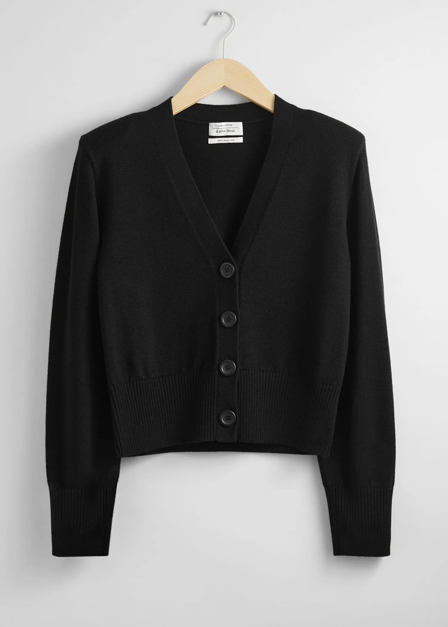 V-Udskåret Cardigan I Merinould Afsluttet Med Polstrede Skuldre. Fire Knaplukninger Ribbede Manchetter Og Kant Certificeret I Henhold Til Responsible Wool Standard (Cu893290) Længde På Cardigan: 54 Cm / 21,3″ (Størrelse S)