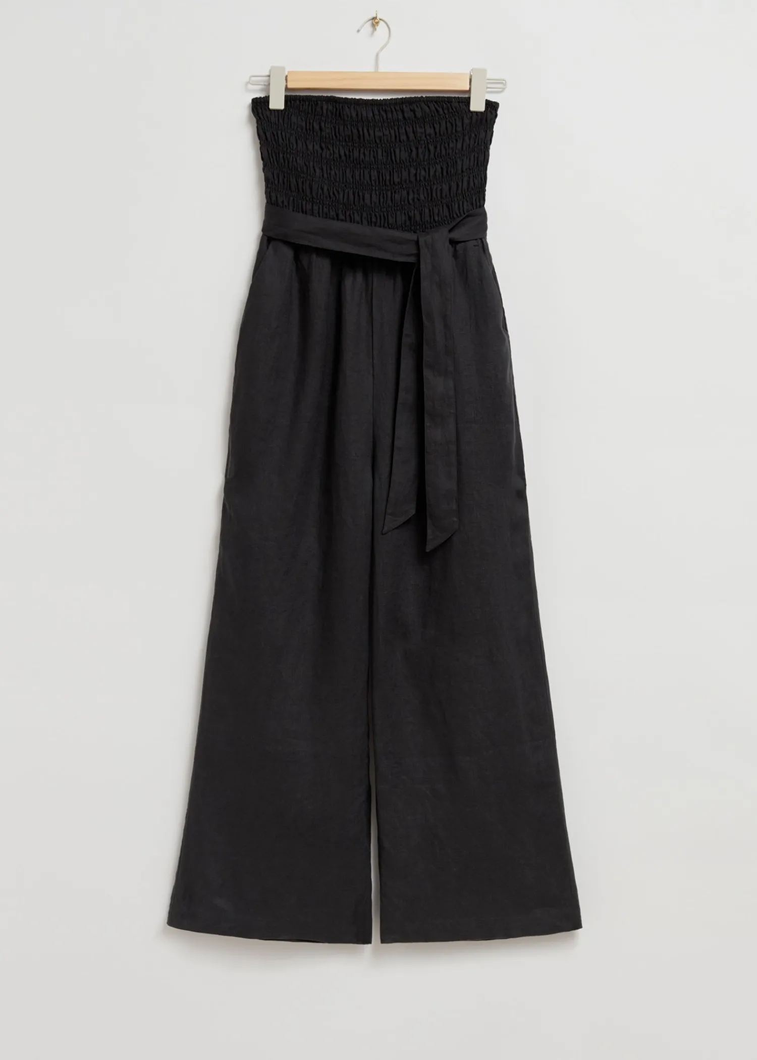 Stropløs Jumpsuit Lavet Af Hør. Designet Med En Tætsiddende Smock-Overdel Med Udbeningsdetalje I Siden Og Bindebånd I Taljen Med Brede Ben, Ankellange Bukser. Afsluttet Med To Stiklommer I Taljen Og To Rygformende Pile. Indersømslængde: 69 Cm / 27,2″ (Eu 36 / Uk 8 / Us 4) Længde På Jumpsuit: 120 Cm / 47,2″