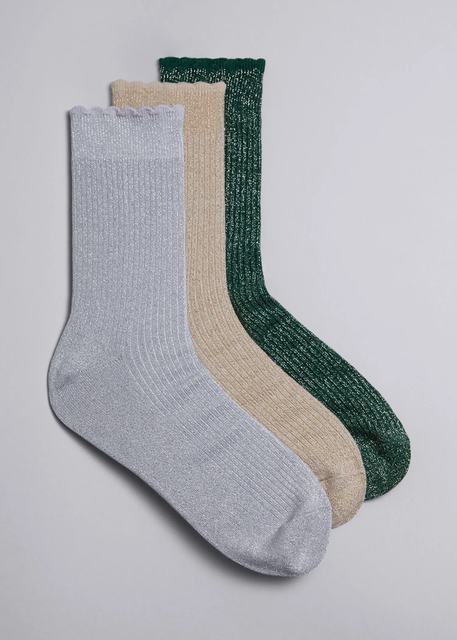 Gaveæske Med Et Sæt Af Tre Glitrende Sokker Med Flæsede Manchetter Og Forstærkede Tæer.