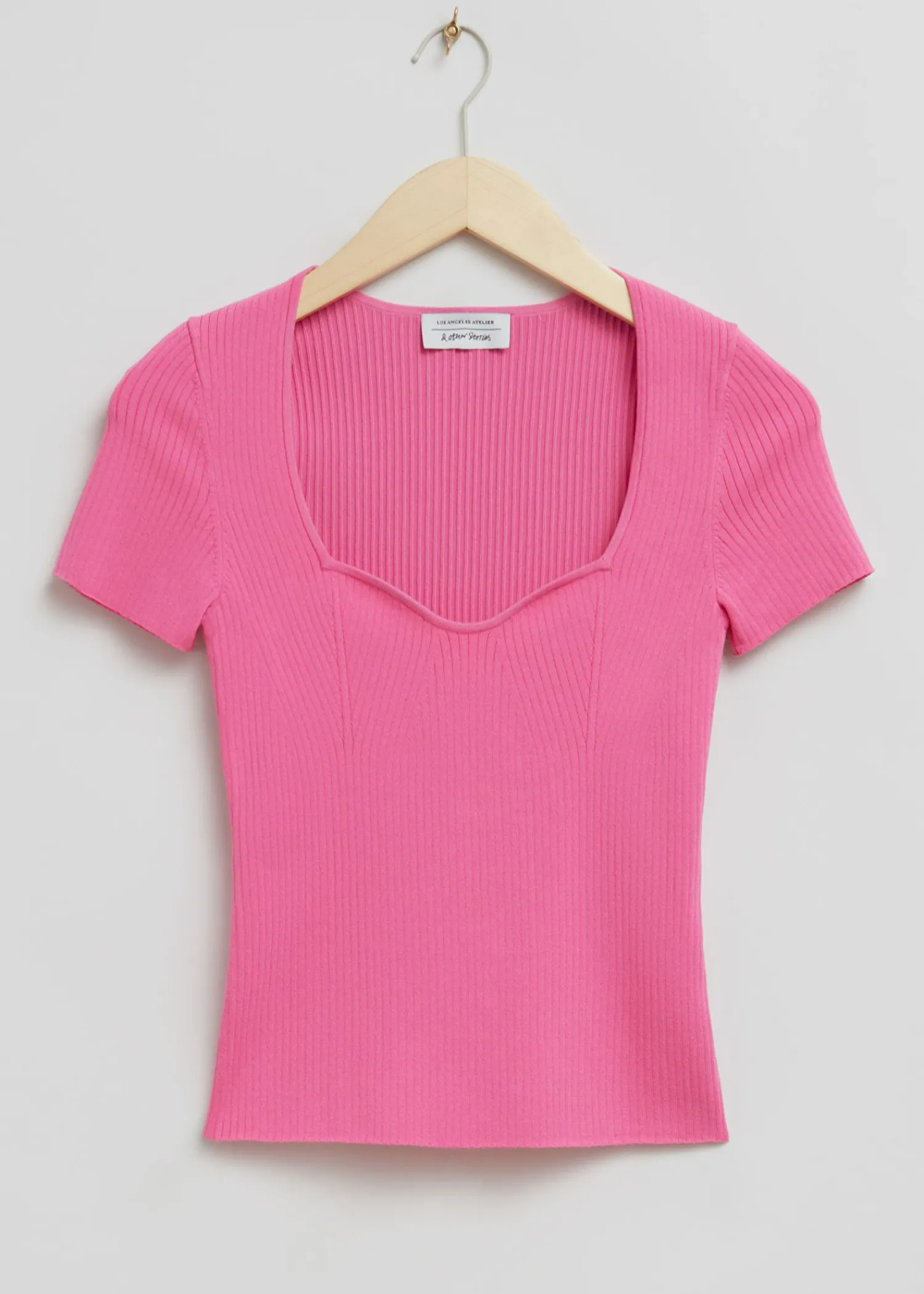 Strikket Sweetheart-Neck Top Lavet Af En Strikket Blanding Af Materialer. Med En Allover Rib Finish, En Sweetheart Halsudskæring Afsluttet Med En Rørformet Kant, Bustier Detalje Og Korte Raglanærmer. Længde På Toppen: 54 Cm / 21,3″ (Eu 36 / Uk 8 / Us 4)