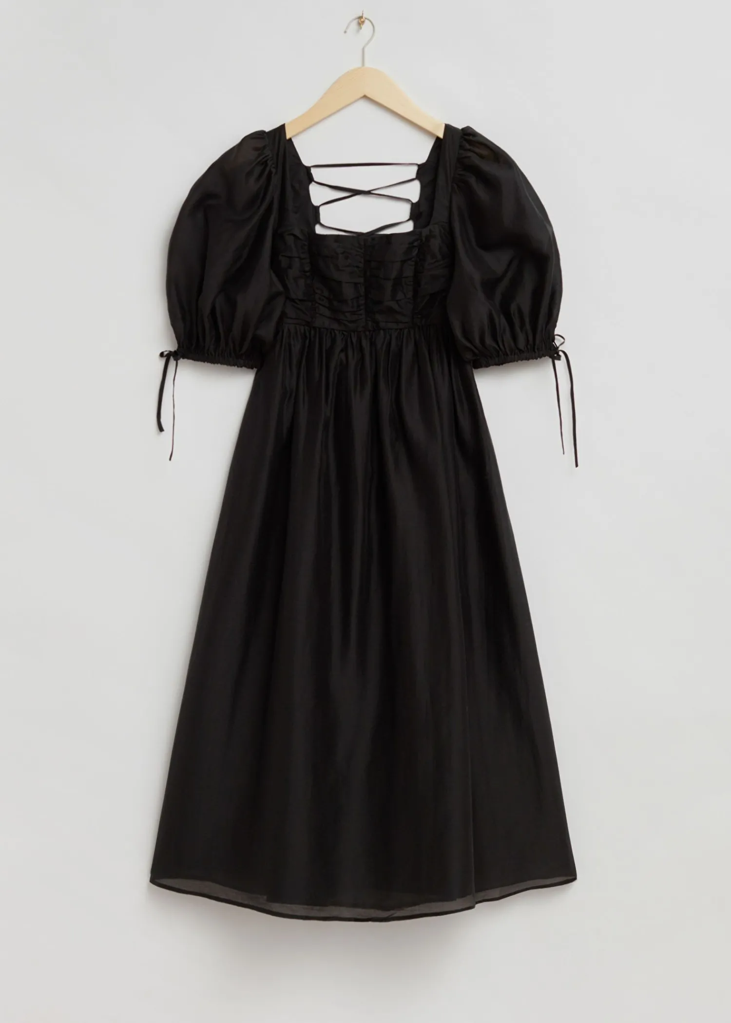 Babydoll Kjole Med Bundet Ærmedetalje Lavet Af En Blanding Af Materialer. Med Korte Puffede Ærmer Med Accent Af Tynde Bindebånd, En Kort Ruchet Overdel Med Firkantet Halsudskæring Og En Åben Gitterbindelukning Bagpå Med En Hel, Løstsiddende Nederdel I En Midi-Cut Silhuet. Kjolens Længde: 121 Cm / 47,6″ (Eu 36 / Uk 8 / Us 4)