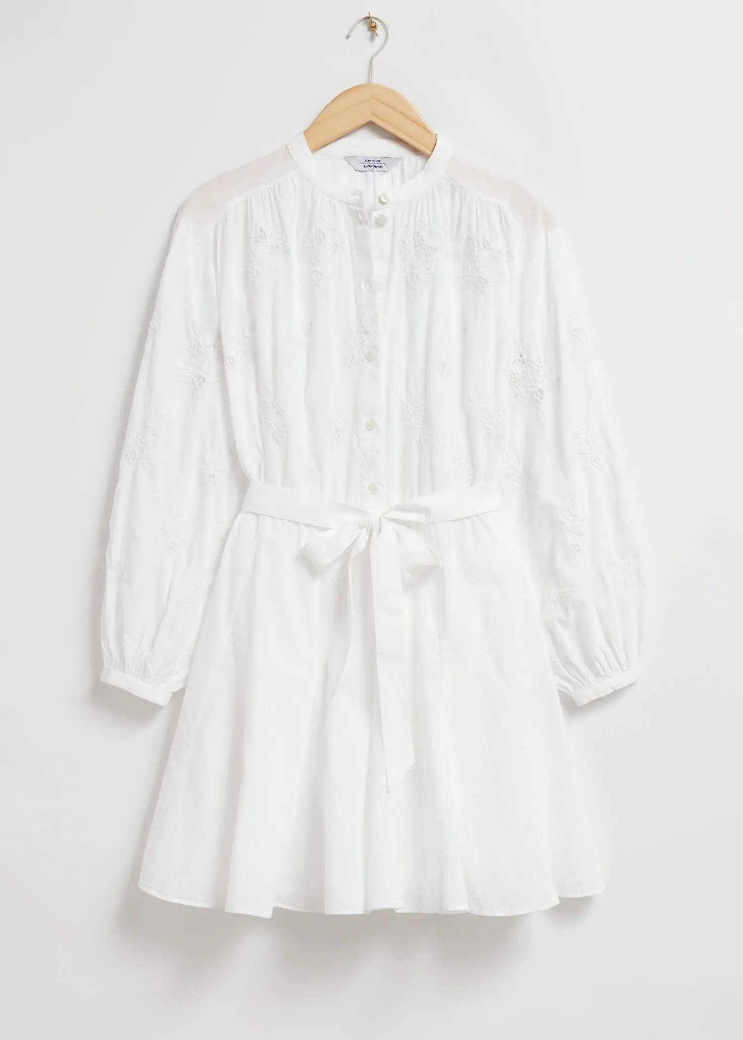 Broderet Bomuldskjole Med Høj Rund Halsudskæring, Lange Voluminøse Ærmer, Sporet Med Knap Foran Og Bælte I Taljen. Kjolen Er Skåret I En Ubesværet Silhuet Med Dekorative Blomsterbroderier Foran Og Ærmer. – Løs Pasform – Elastik I Taljen – Manchetter Med Knap Længde På Kjolen: 89 Cm / 35″ (Eu 36 / Uk 8 / Us 4)