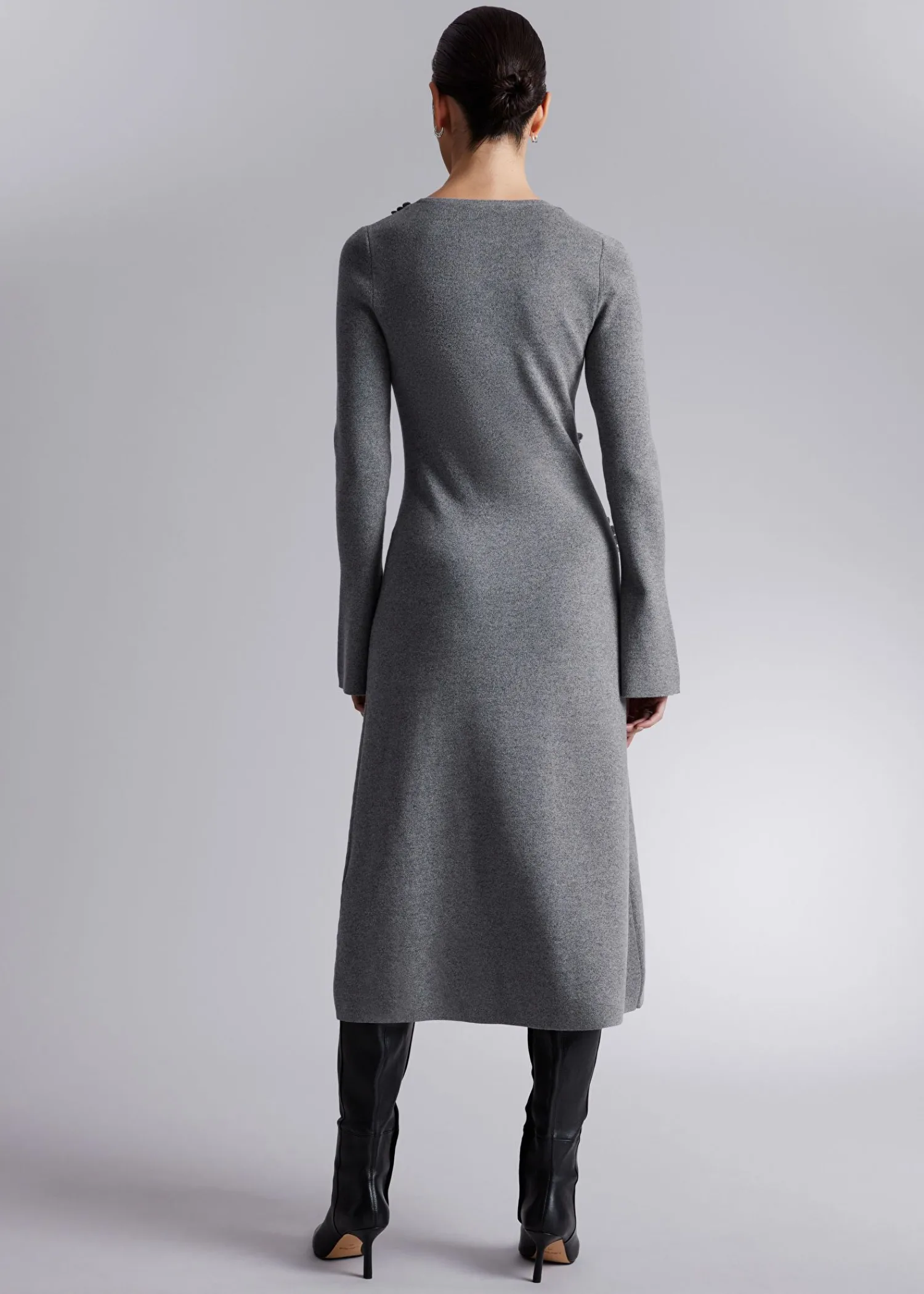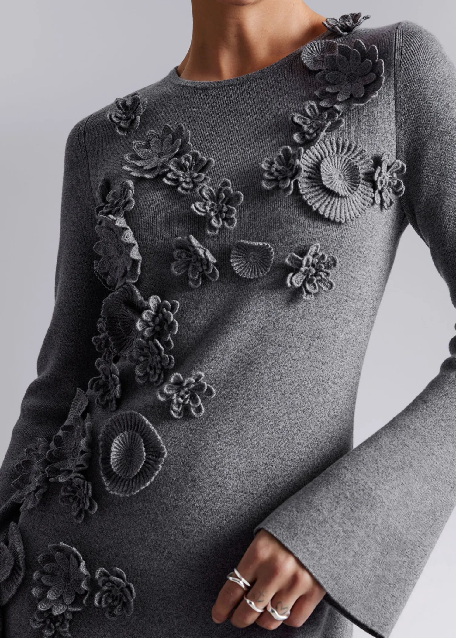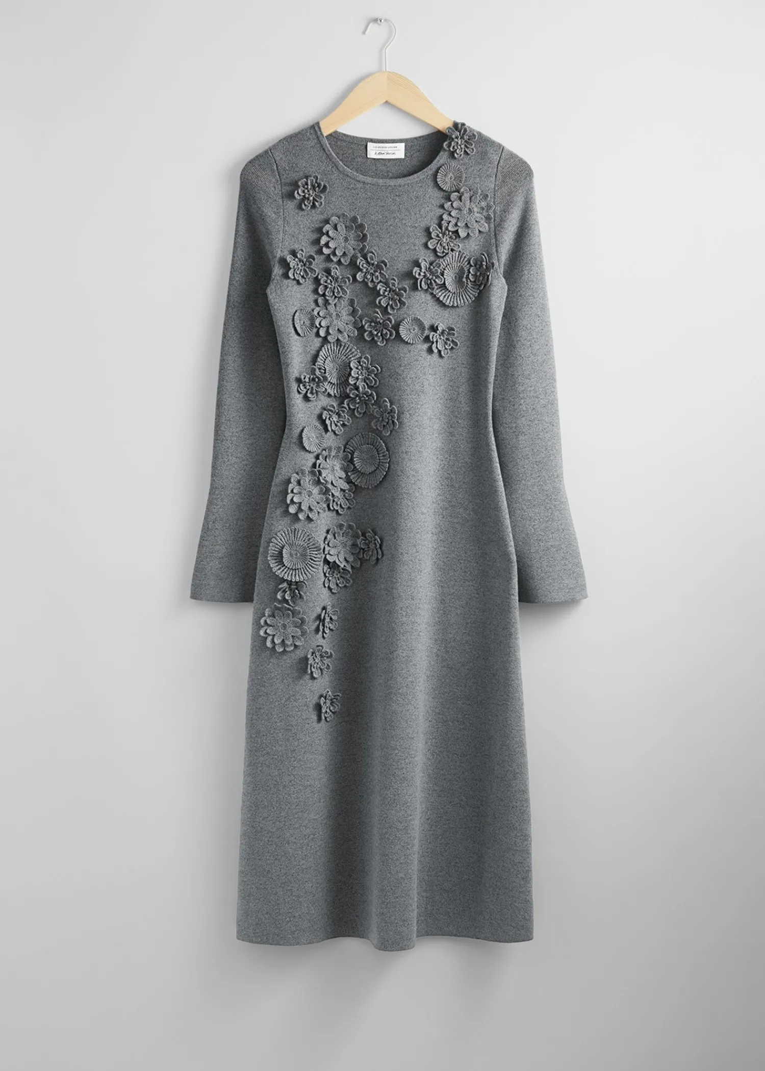 Strikket Midikjole Prydet Med Blomsterapplikationsdetaljer Foran. Rund Hals 55% Rws Uld Certificeret Af Control Union 893290 Kjolens Længde: 120 Cm / 47,2″ (Størrelse S)