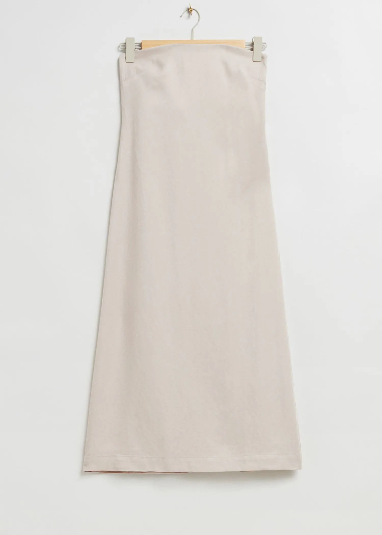 Stropløs Bustier Midikjole Designet I En Ren, Minimal Stil. Skåret Af En Blød Mat Twill Med En Luksuriøs Glans I En Slim Pasform, Understøttet Af Diagonale Pile Langs Overdelen Og En Indvendig Stretchbomuldsbustier Med Udbening I Sidesømmene Og Blød Elastisk Bustier-Kant. Afsluttet Med Lynlås I Siden. Tynde Aftagelige Justerbare Stropper Er Tilvejebragt For Yderligere Støtte, Hvis Det Er Nødvendigt. Kjolens Længde: 104 Cm / 41″ (Eu 36 / Uk 8 / Us 4)