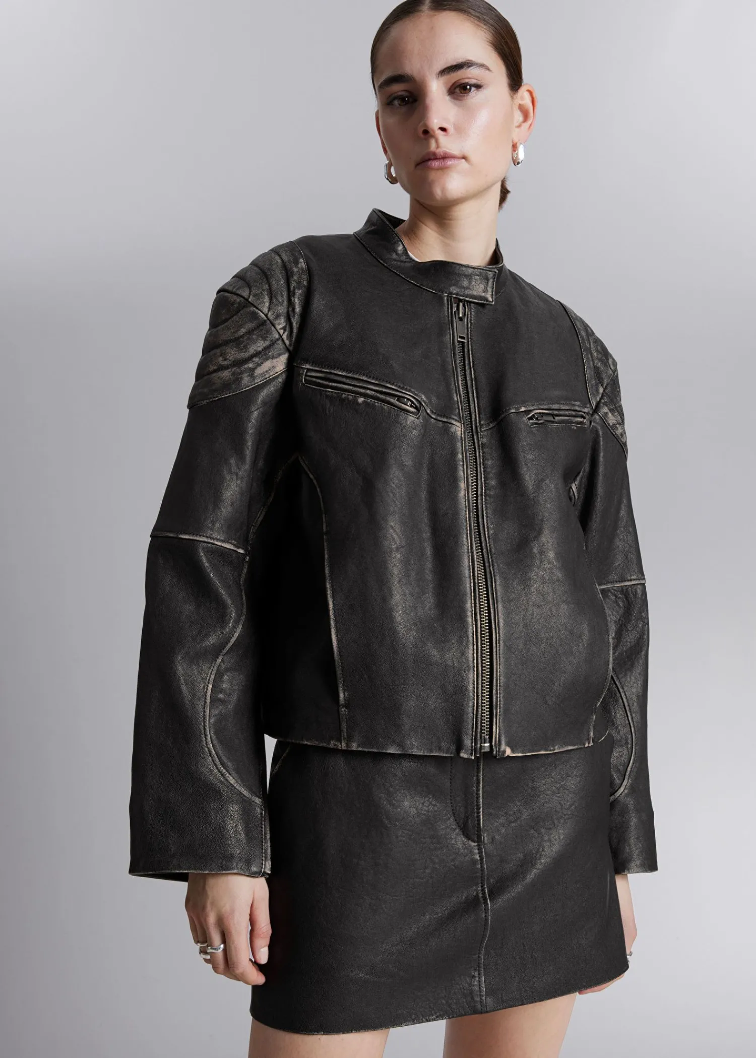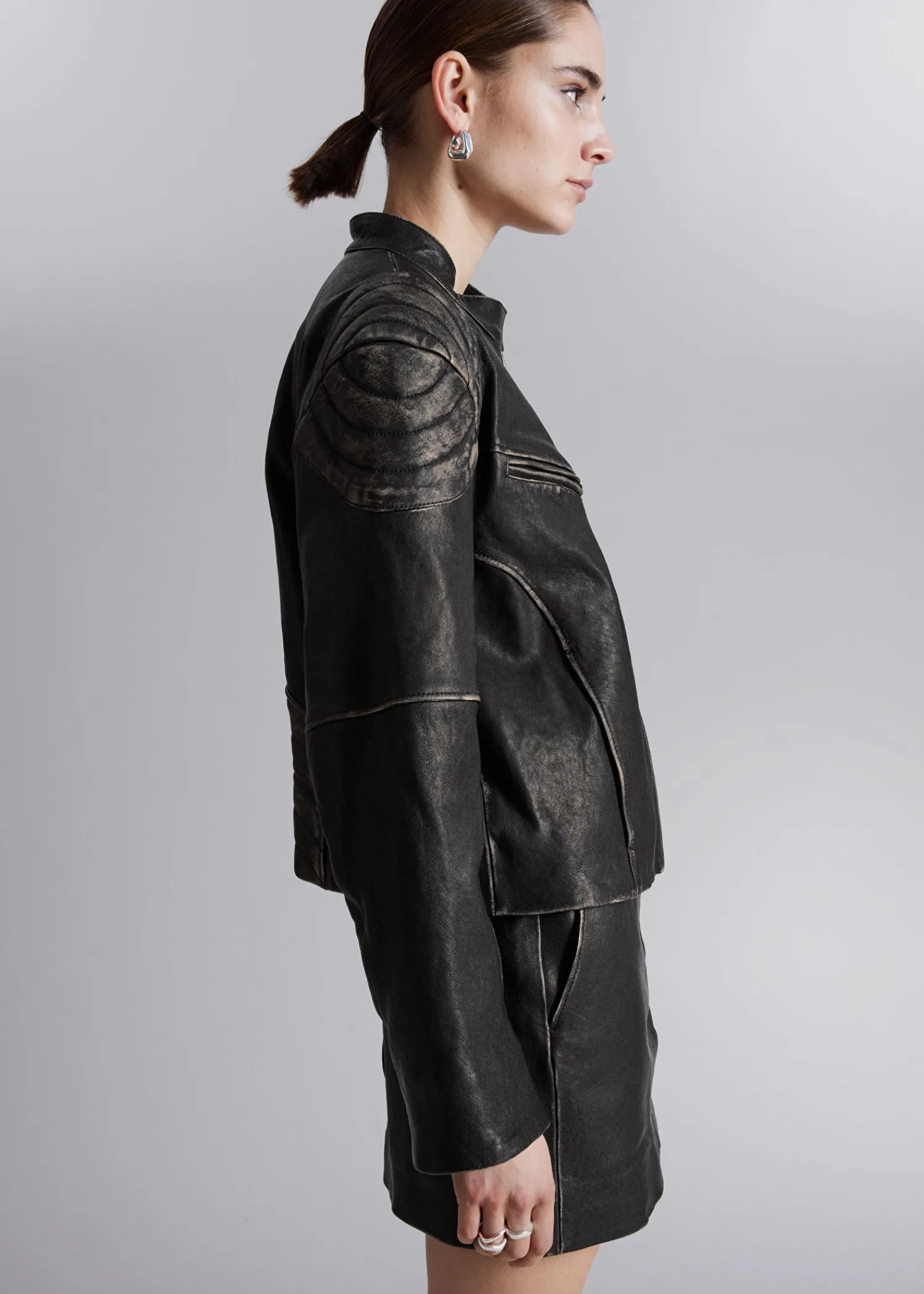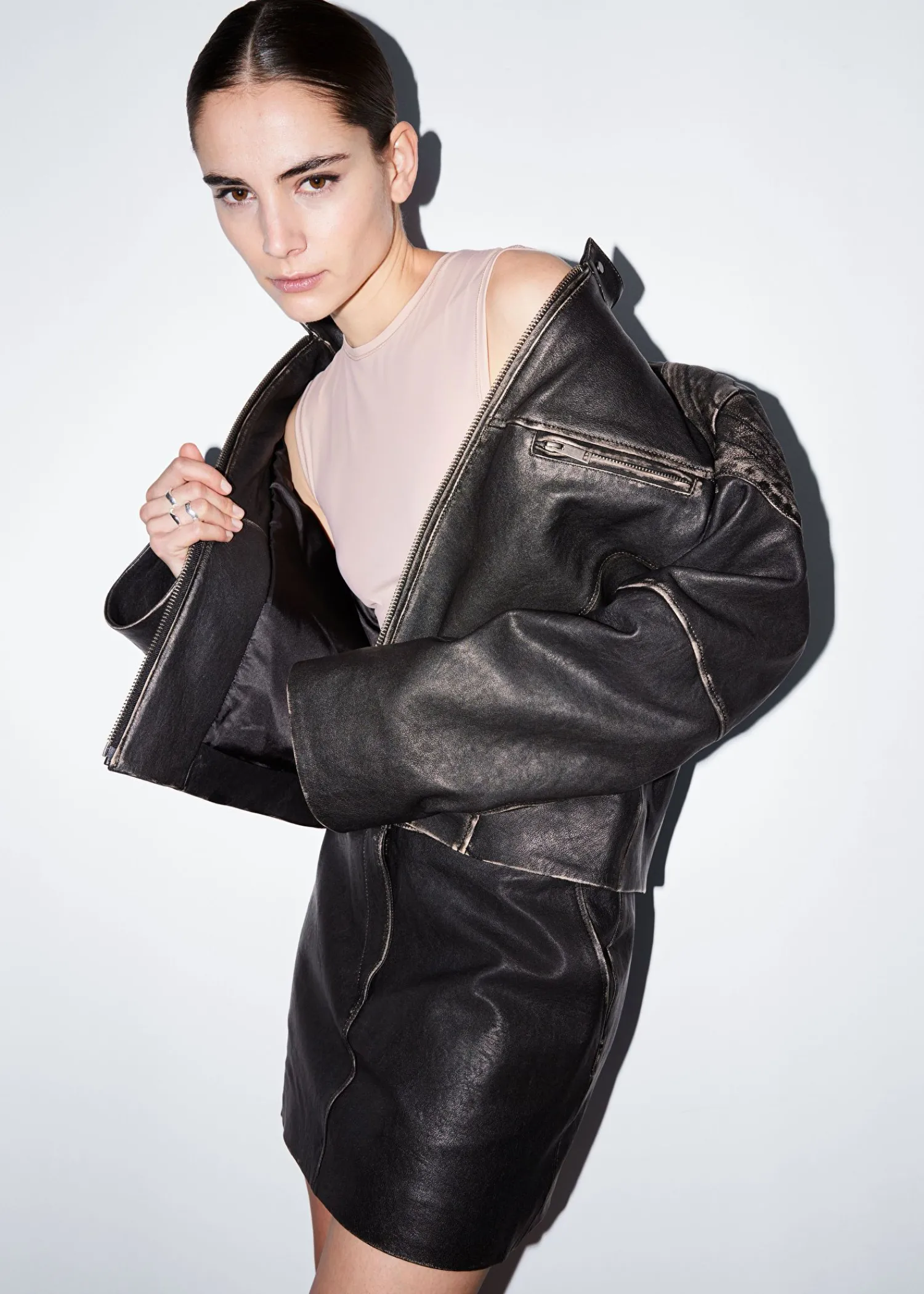 Boksagtig Læderjakke Med Lynlås Med Buede, Topsyede Detaljer Ved Skuldrene, Ryggen Og Ærmerne. Polstret Foring Stand-Up Krave Med Metal Trykknapper Duo Lynlåslommer På Brystet Lynlåsdetaljer På De Indvendige Manchetter Længde På Jakken: 54 Cm / 21,3″ (Str. S)