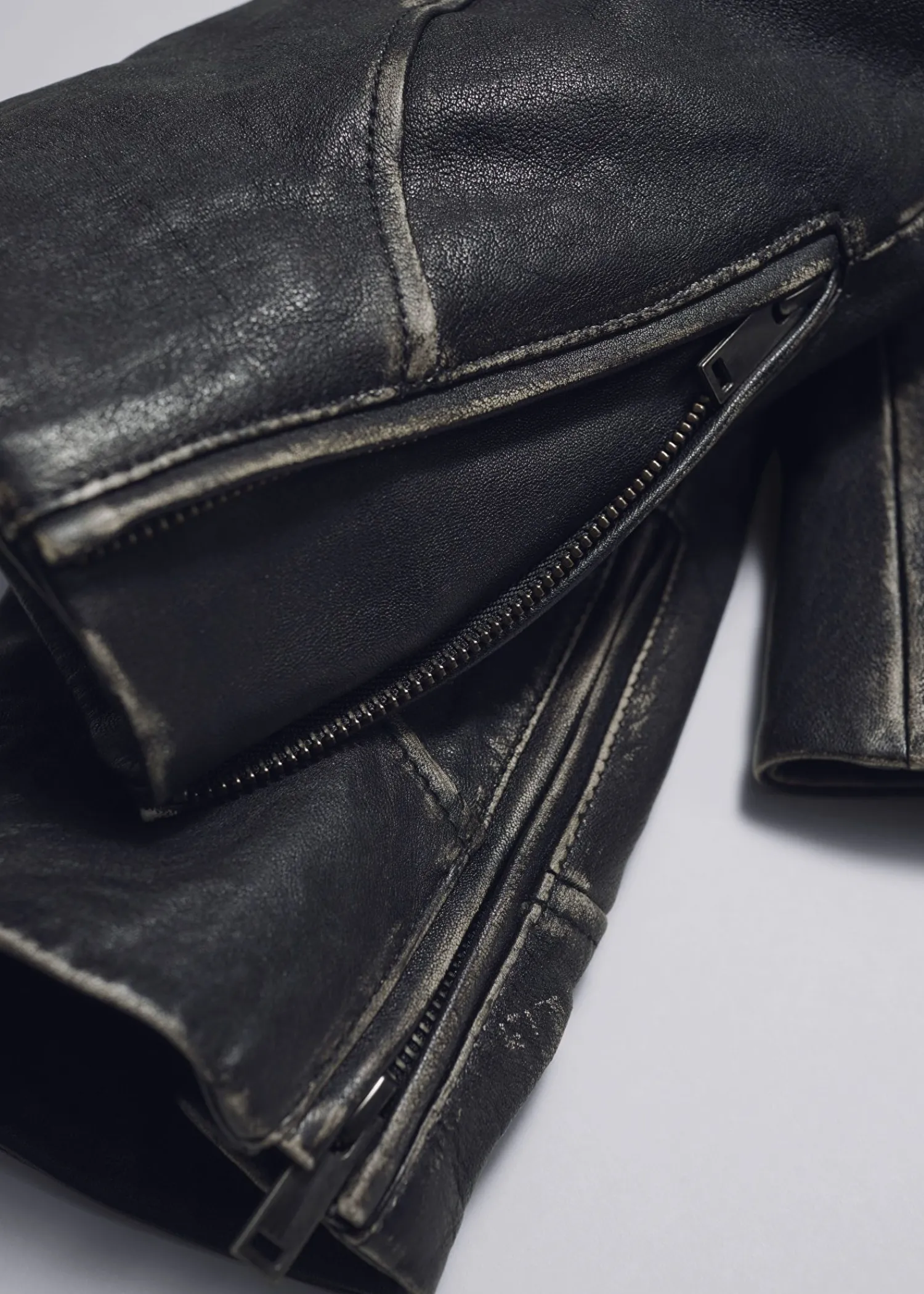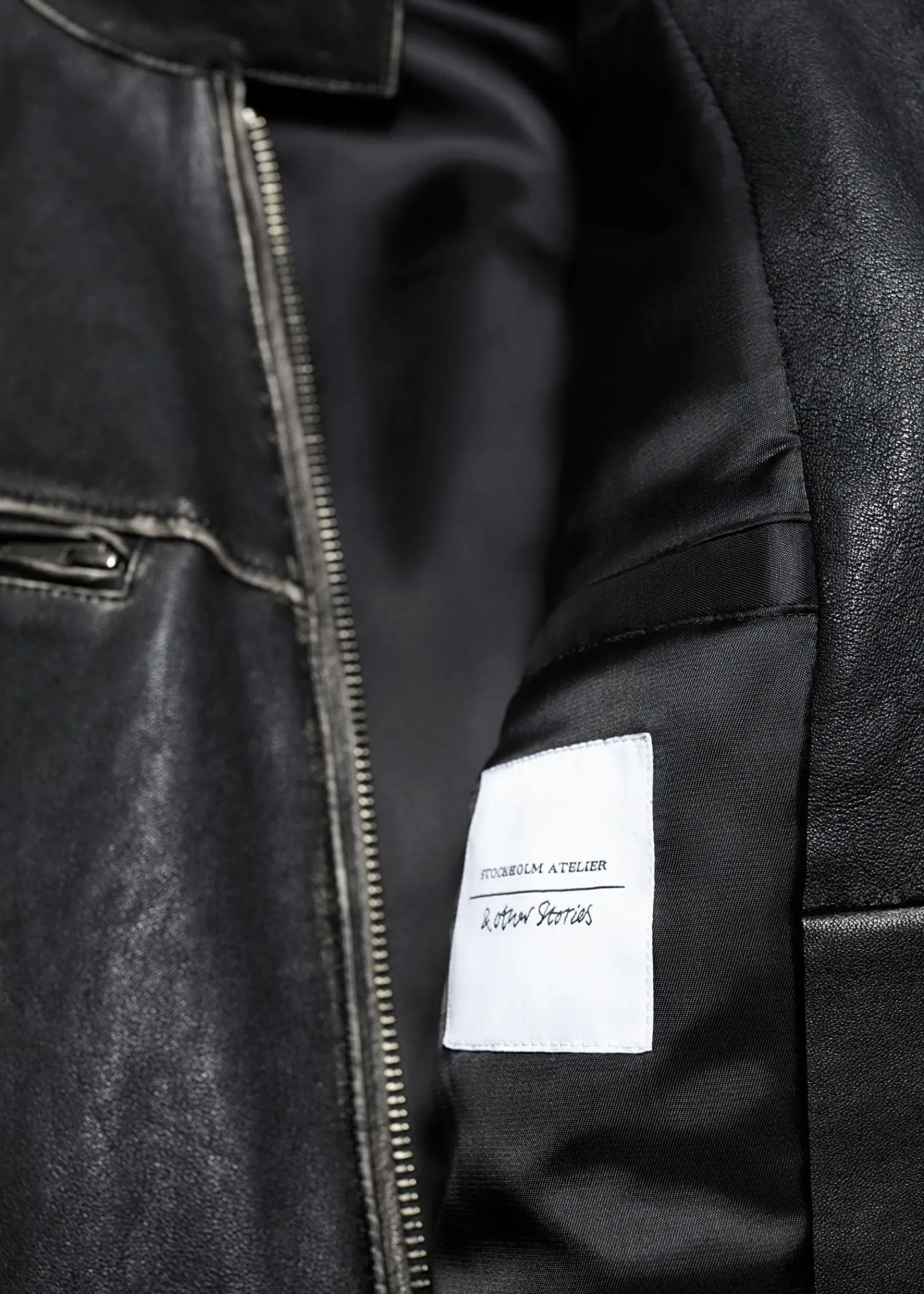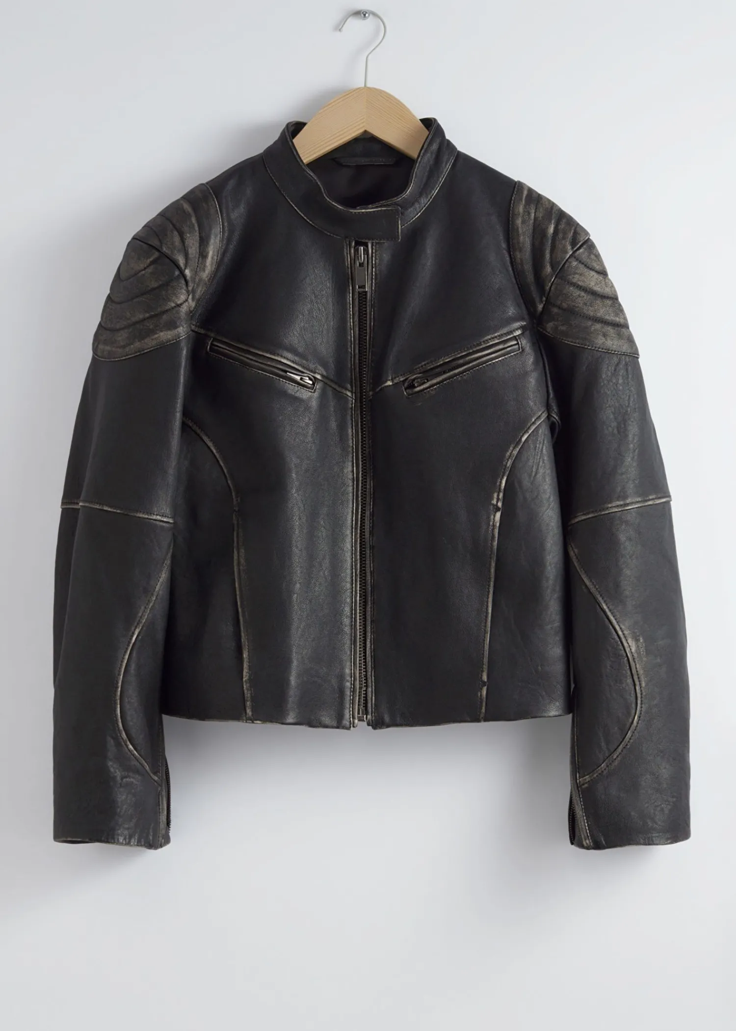 Boksagtig Læderjakke Med Lynlås Med Buede, Topsyede Detaljer Ved Skuldrene, Ryggen Og Ærmerne. Polstret Foring Stand-Up Krave Med Metal Trykknapper Duo Lynlåslommer På Brystet Lynlåsdetaljer På De Indvendige Manchetter Længde På Jakken: 54 Cm / 21,3″ (Str. S)