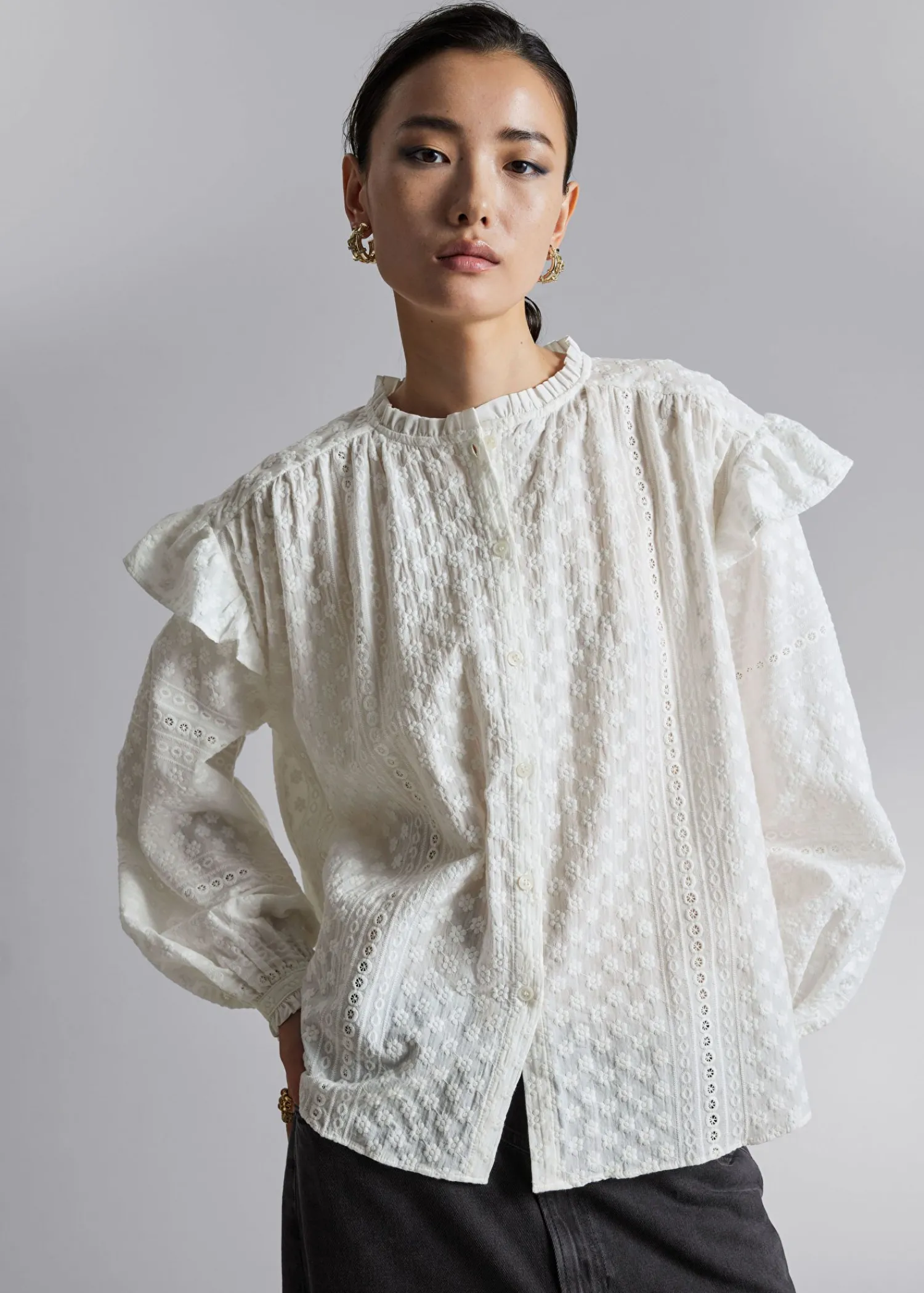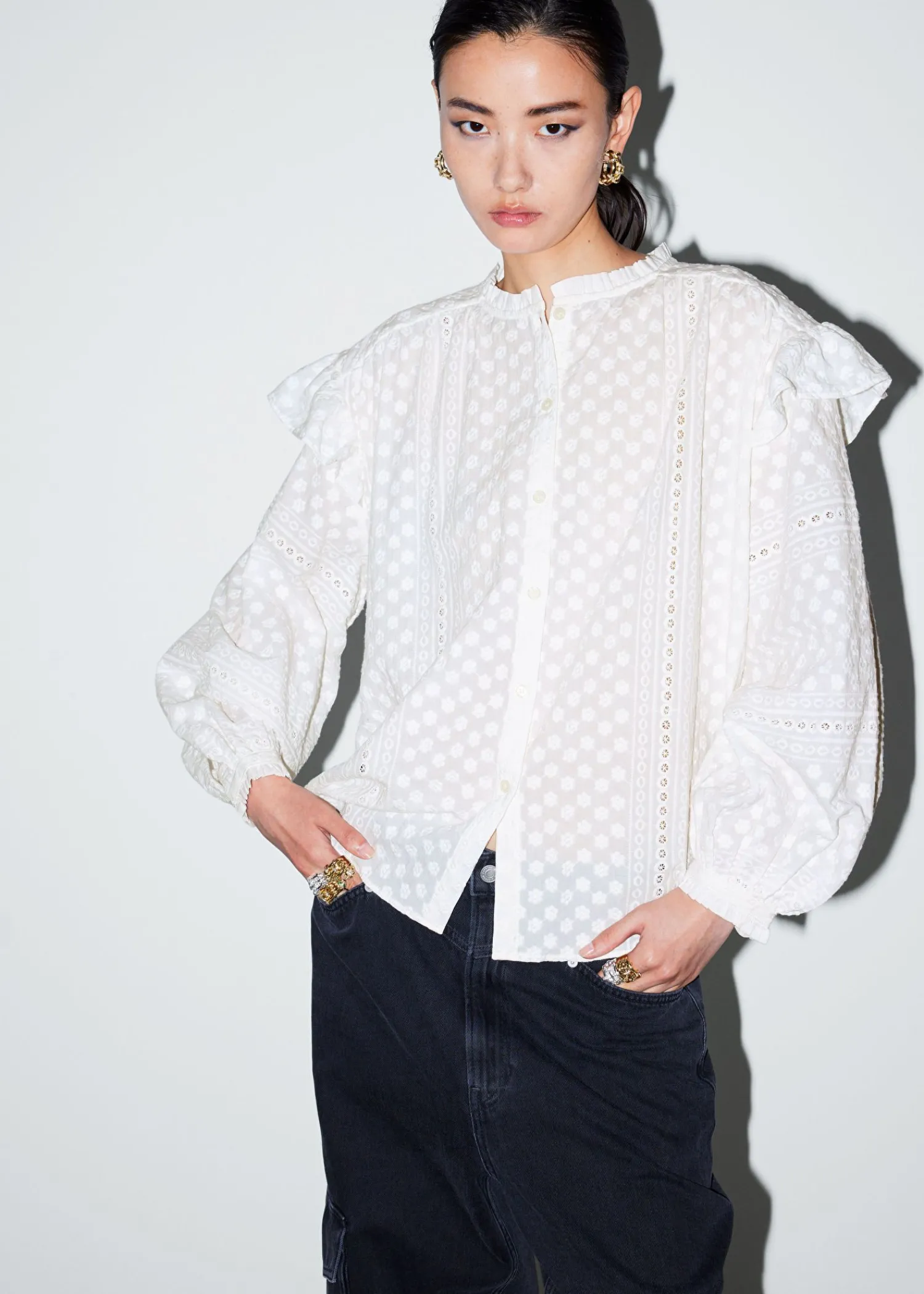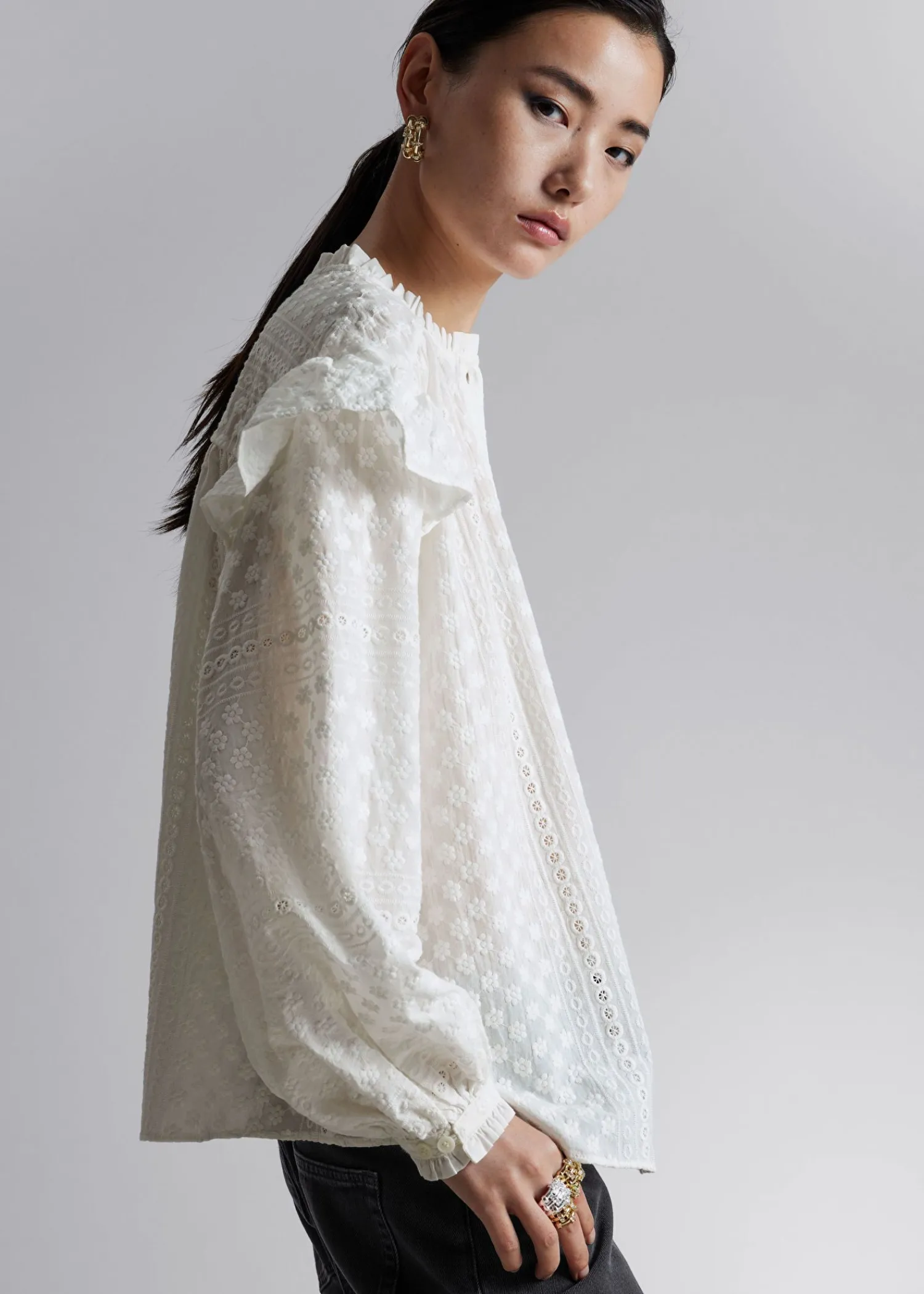 Afslappet Bluse Med Voluminøse Ærmer Med Flæsekant Ved Skulderen. Detaljeret Med Hele Blomsterbroderi. Flæsehalsudskæring Knaplukning Foran Knappede Manchetter Længde På Bluse: 64,5 Cm / 25,4″ (Str. S)