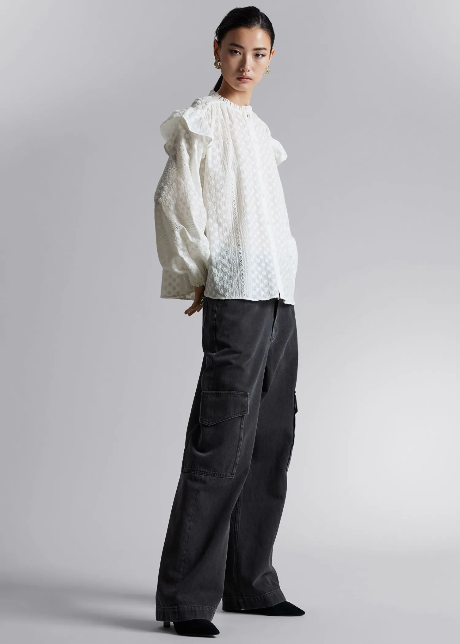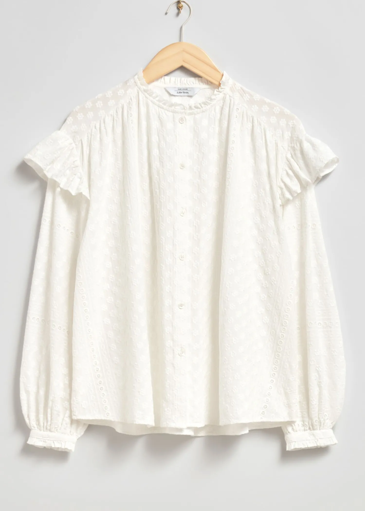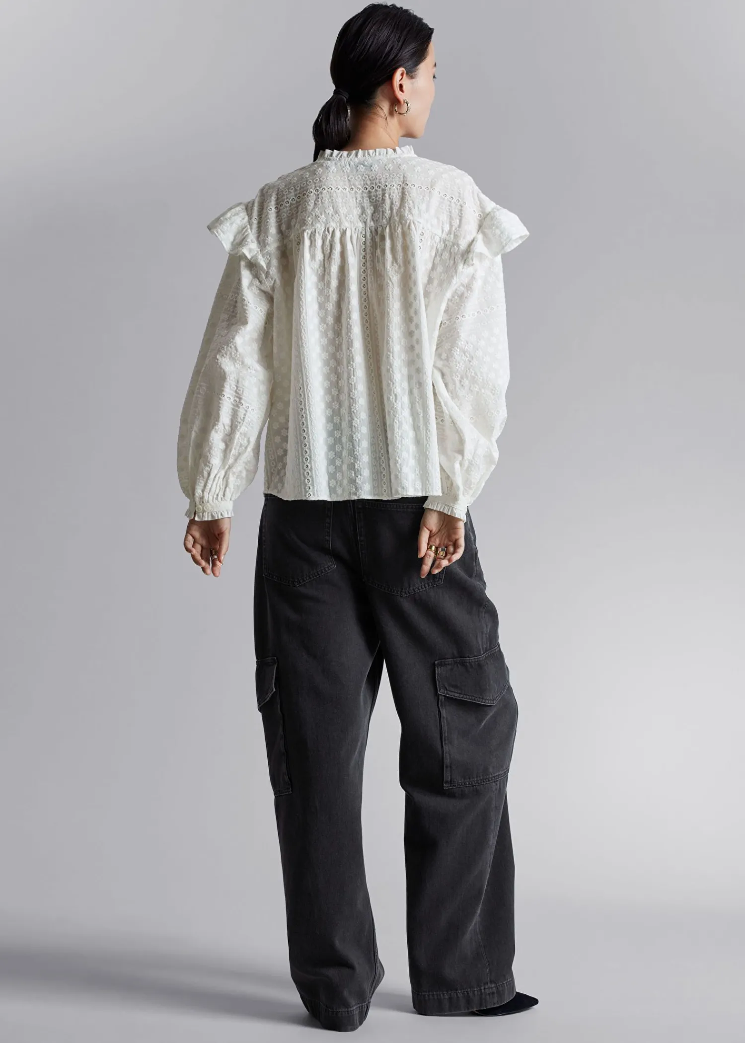 Afslappet Bluse Med Voluminøse Ærmer Med Flæsekant Ved Skulderen. Detaljeret Med Hele Blomsterbroderi. Flæsehalsudskæring Knaplukning Foran Knappede Manchetter Længde På Bluse: 64,5 Cm / 25,4″ (Str. S)