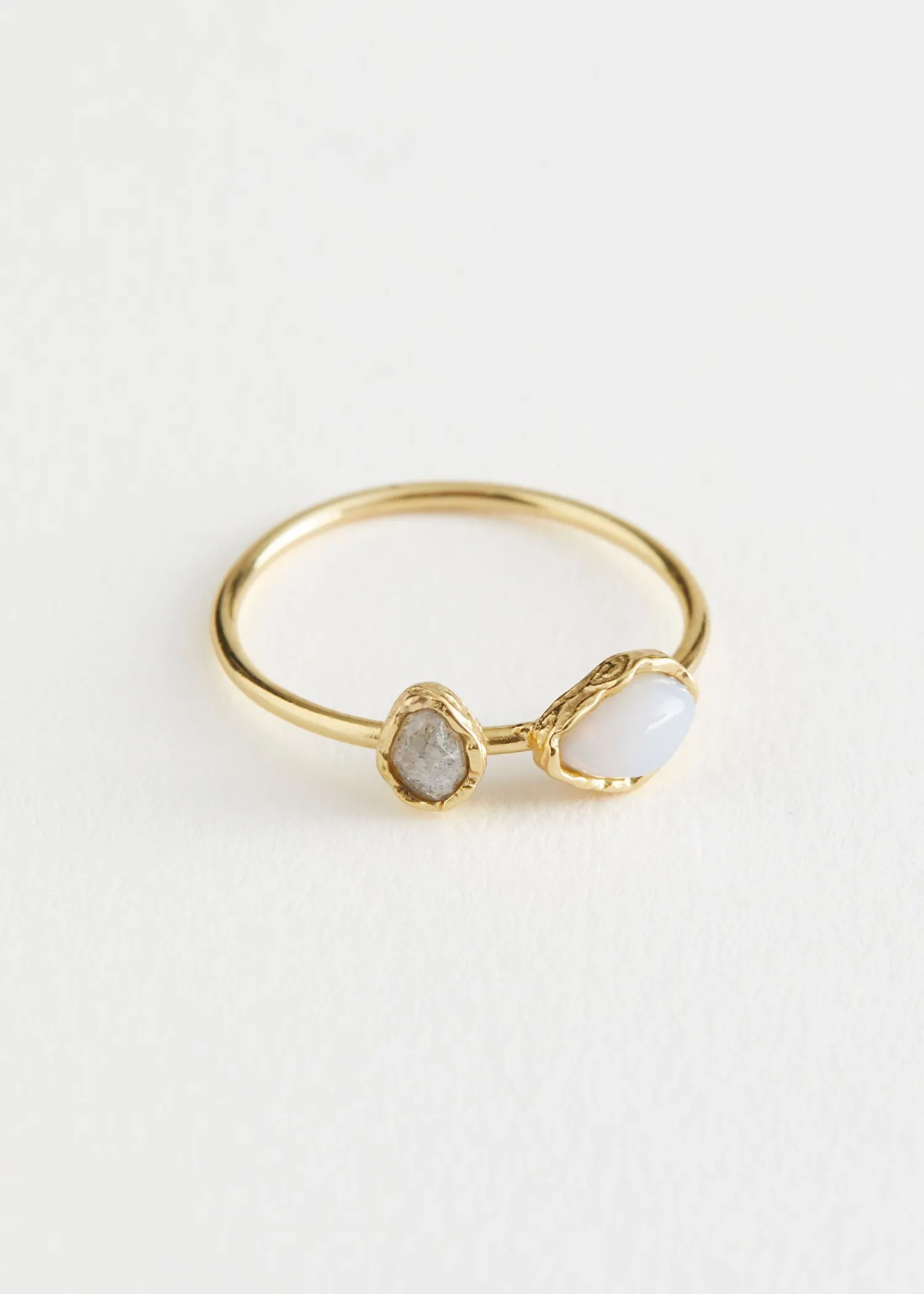 Delikat Guldtonet Ring Med Duo-Stenvedhæng I En Organisk, Hamret Finish. Nikkel Testet