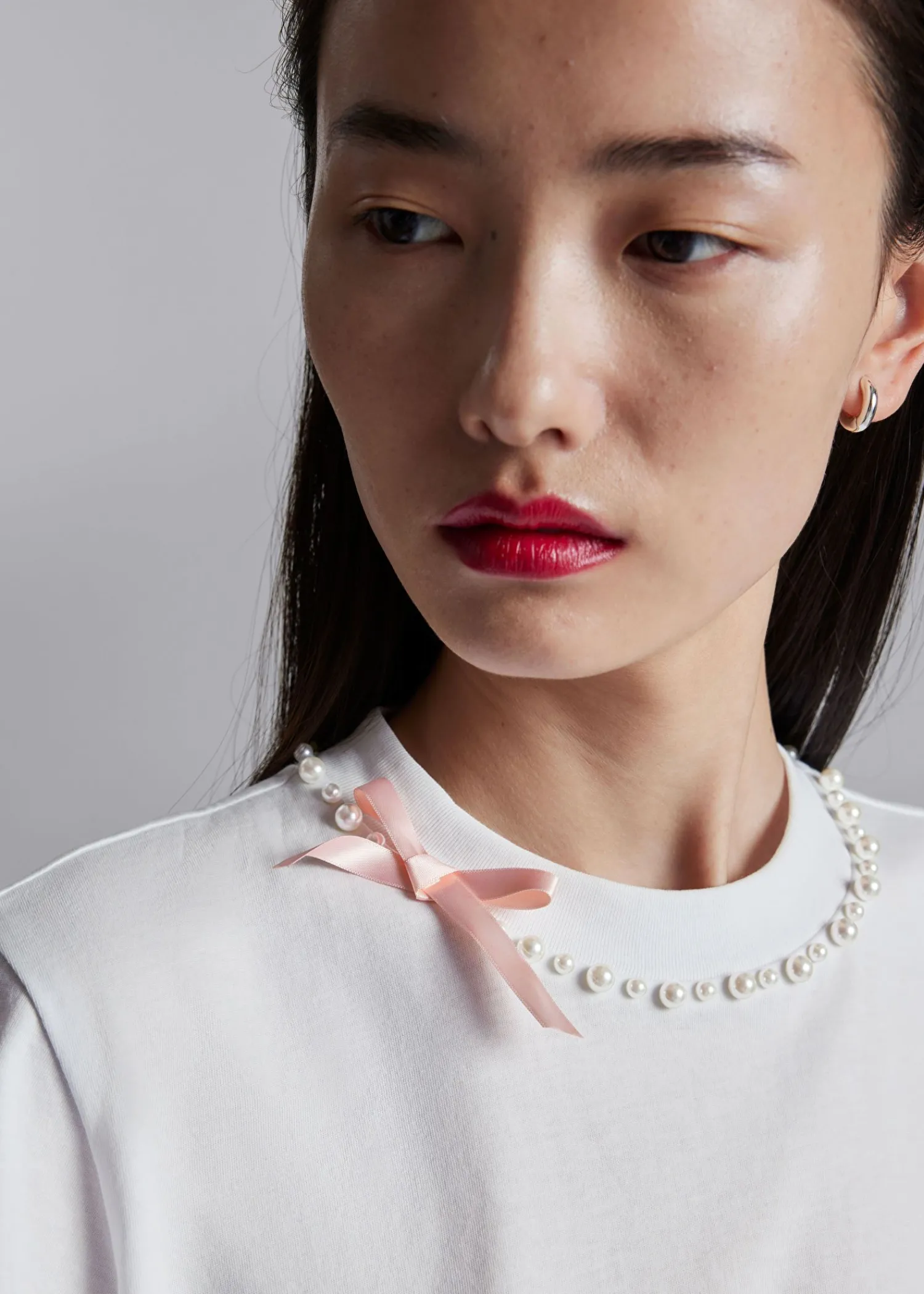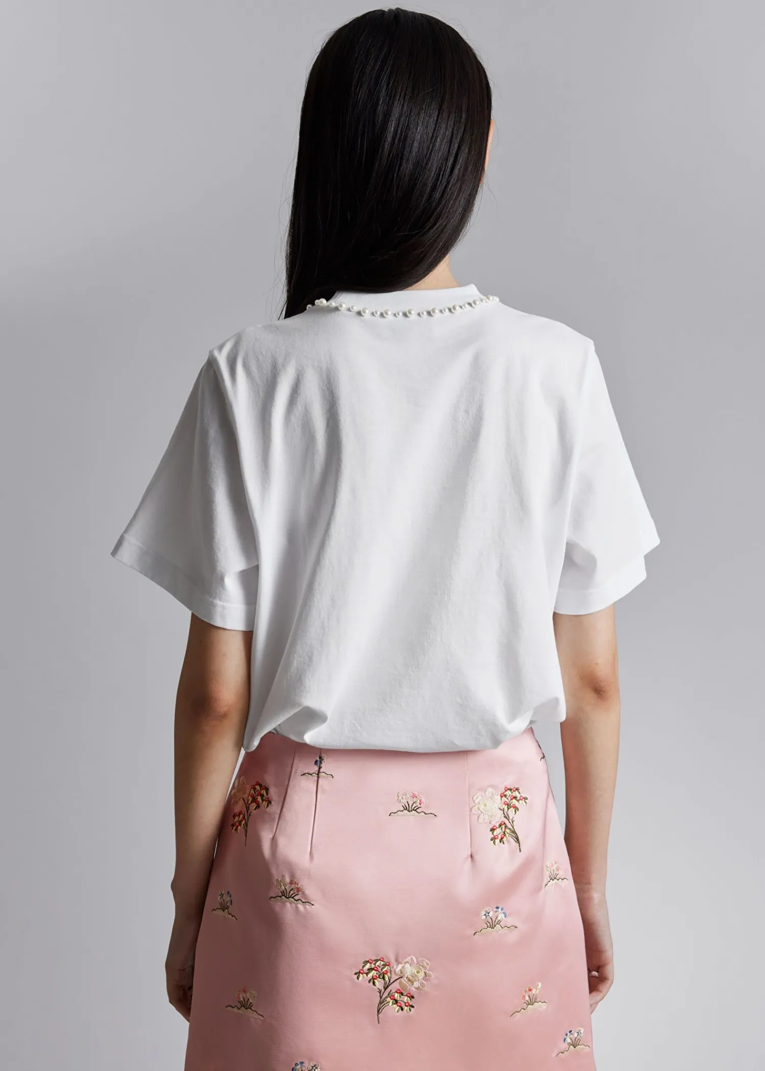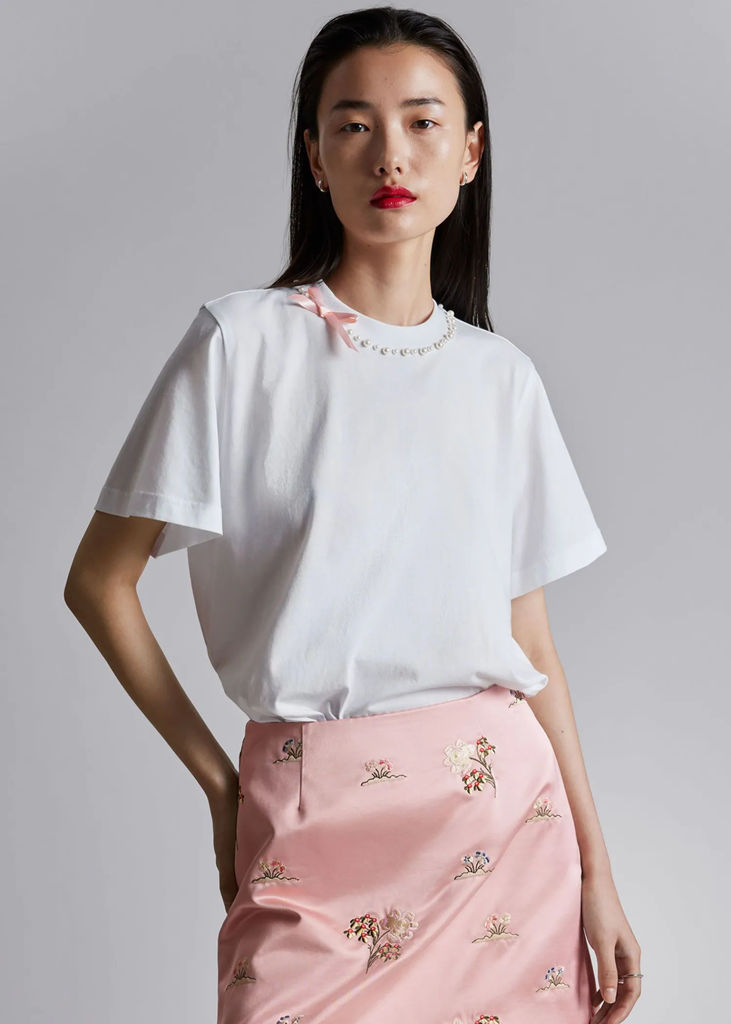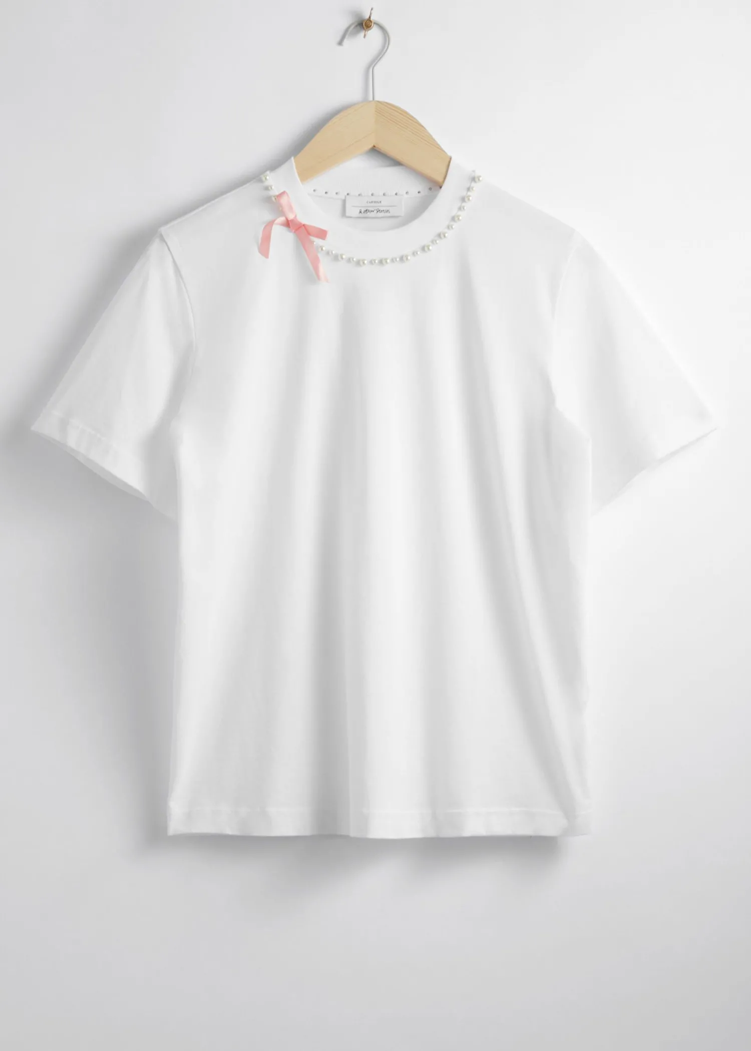 Afslappet T-Shirt Prydet Med Perleperler Og En Lille, Lækker Sløjfe I Nakken. Længde På T-Shirt: 58 Cm / 22,8″ (Størrelse S)