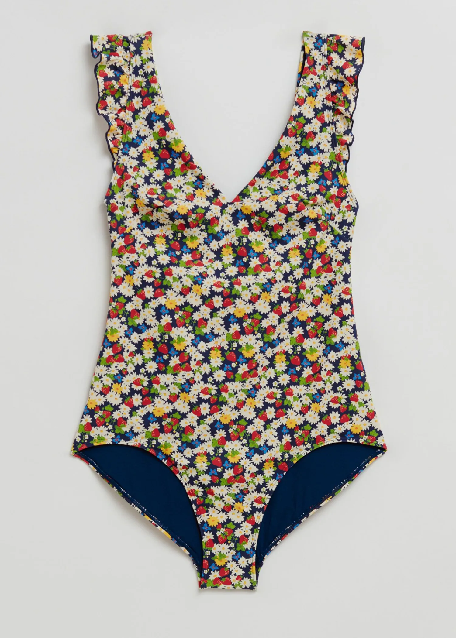 V-Hals Badedragt Med Flæsede Stropper Og Dyb Ryg. Afsluttet Med En Foret Front Og Uden Polstring. Regelmæssig Stigning Midtdækning