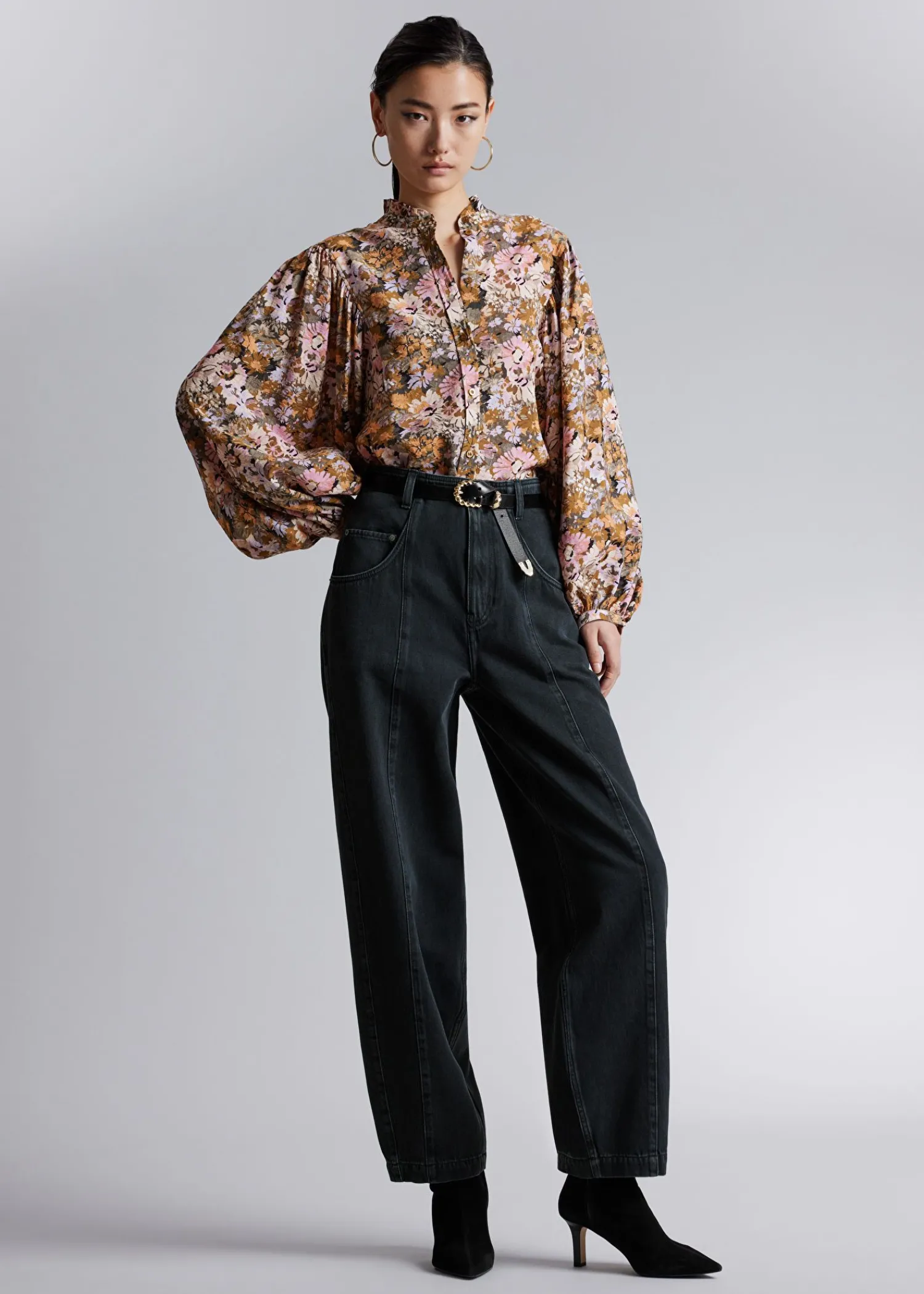 Bluse Med Knapper Med Høj Flæsekrave Og Lange Afslappede Ærmer. Syv Knaplukninger I Midten Foran Knappede Manchetter …