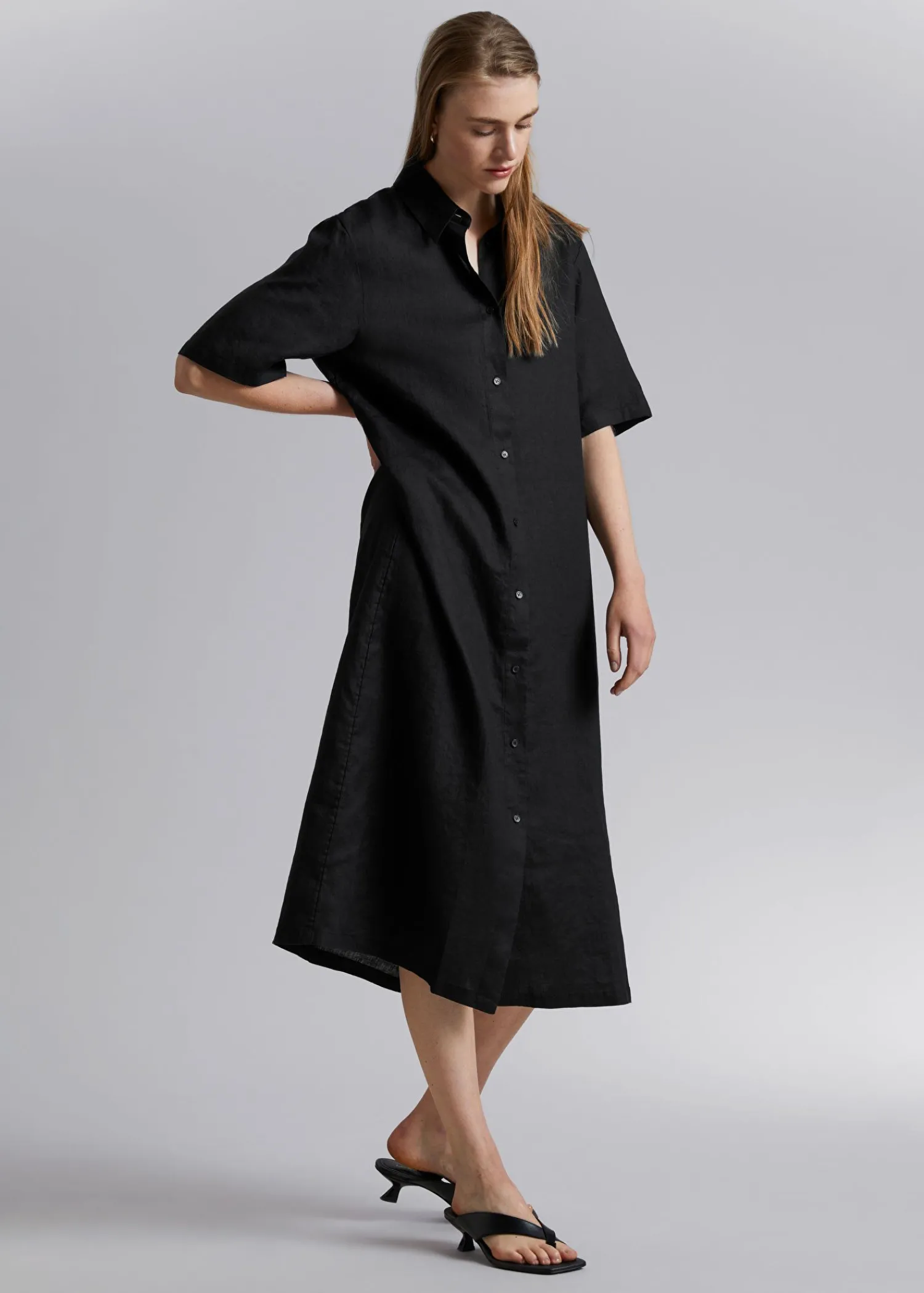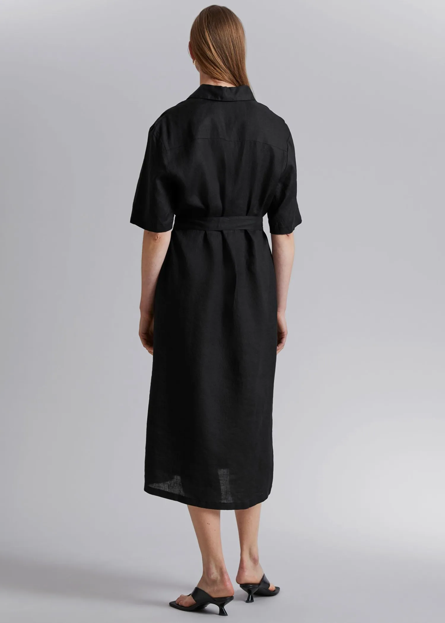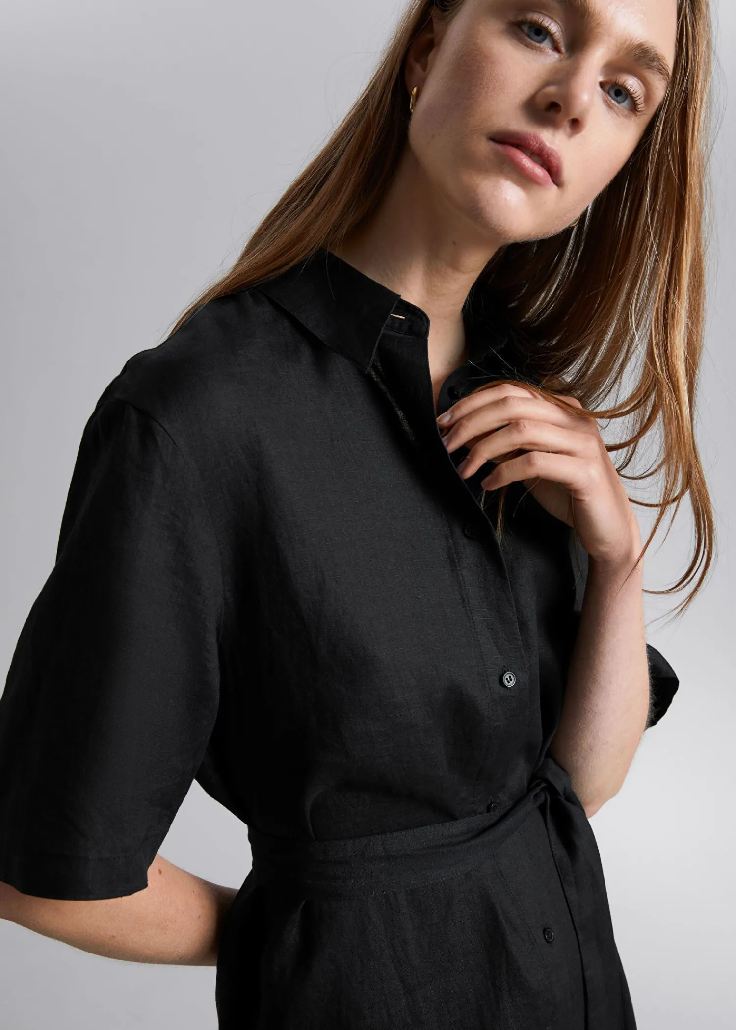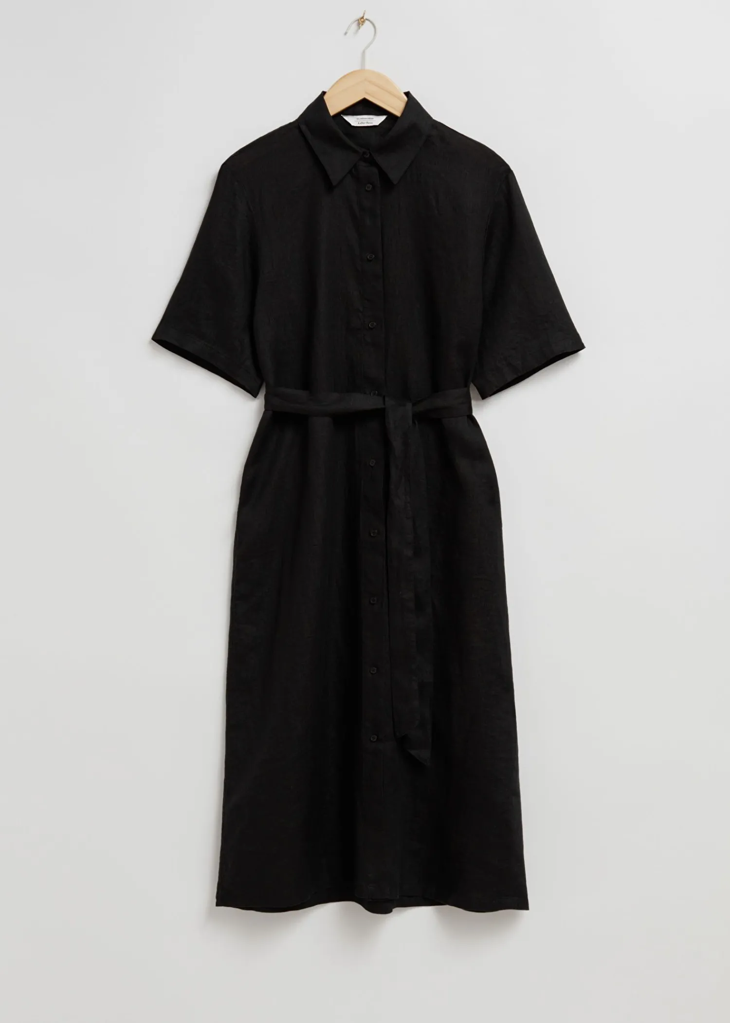 Skjortekjole I Linned Med Bælte Lavet Af Vævet Hør-Voile. Skræddersyet Med Korte Ærmer I En Maxi-Længde Silhuet, Knappet Stolpe Foran Og Bælte I Taljen Og Hæklede Bæltestropper. Afsluttet Med Bærestykke Bagpå Og Sømdetaljer. Kjolens Længde: 124 Cm / 48,8″ (Størrelse S)