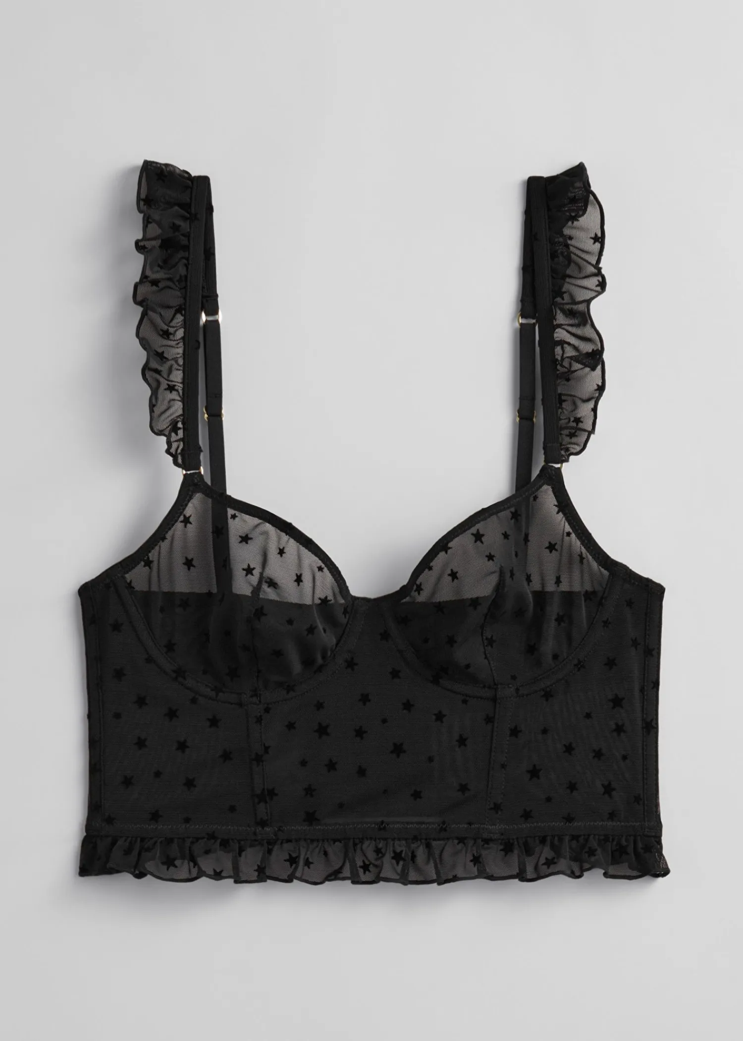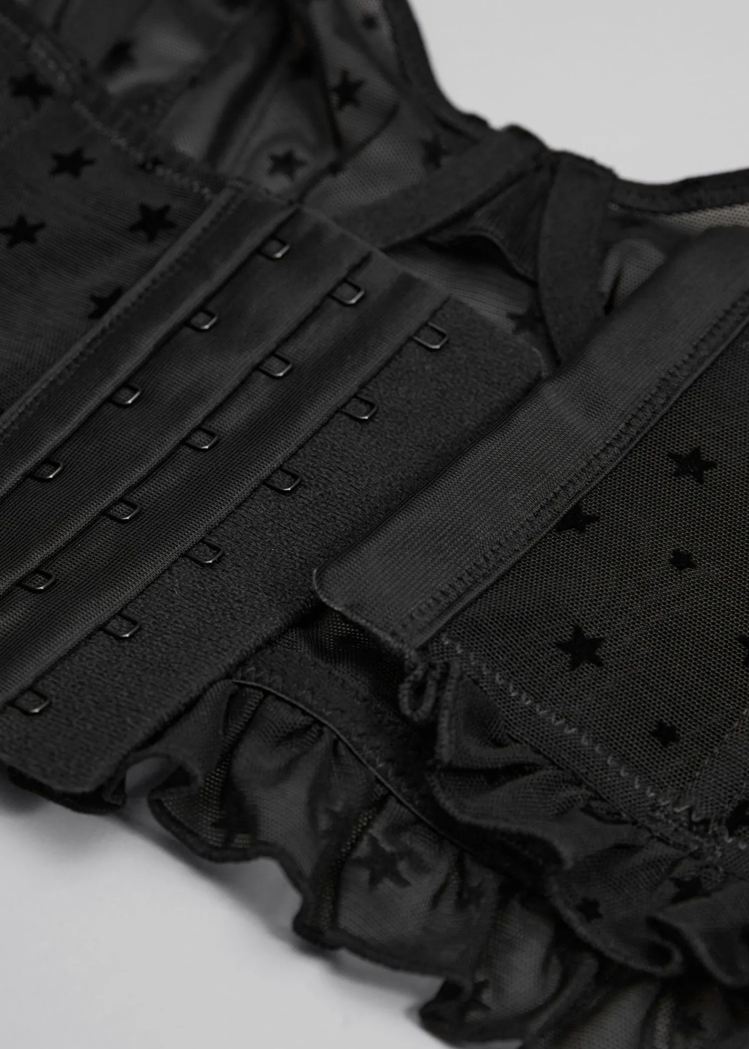 Gennemsigtig Bustier Med Et Allover-Stjernemotiv Og Bøjleskåle Med Støttende Udbening. Flæsedetaljer Ved Stropperne Og Forneden. Flæsekantede, Justerbare Skulderstropper Seks Hægtelukninger Bagpå