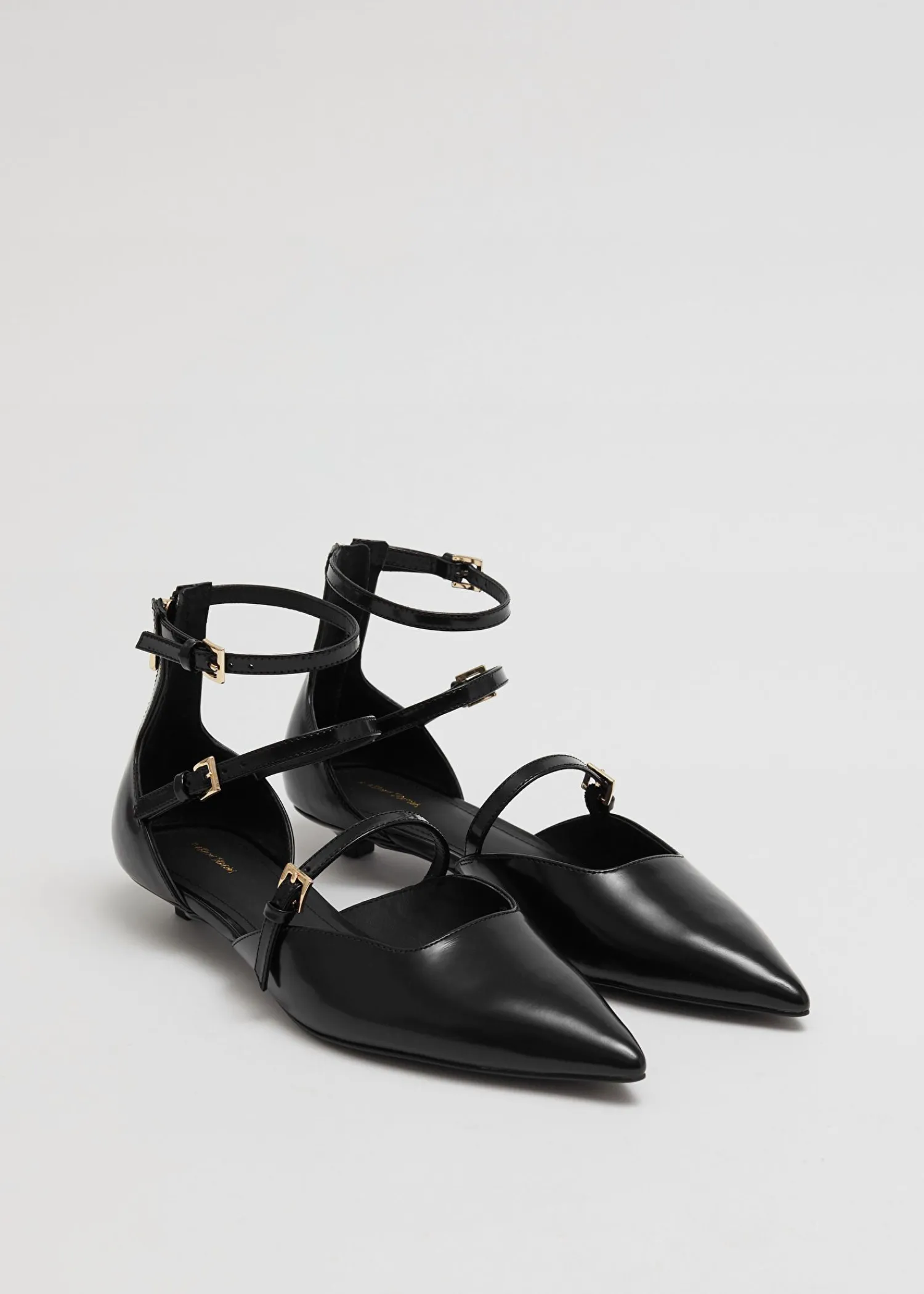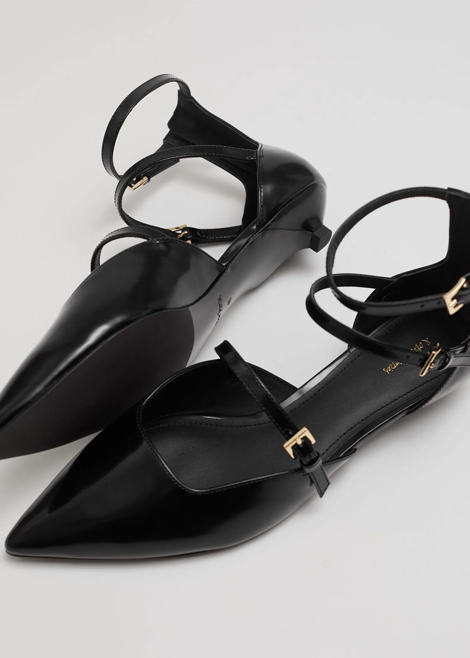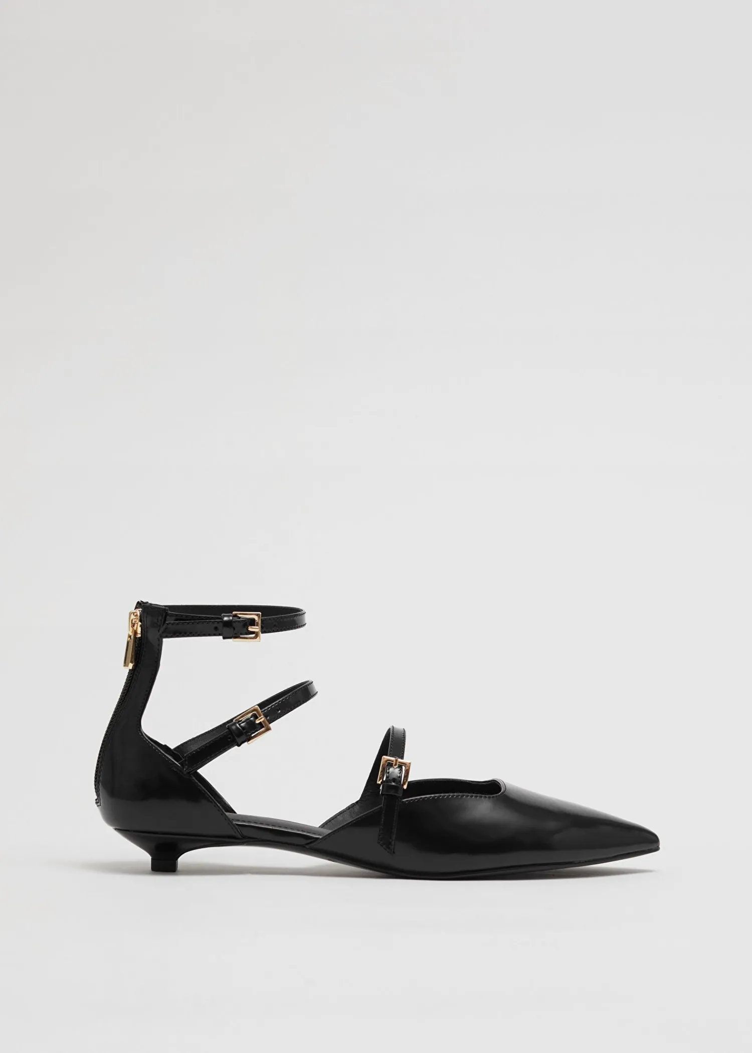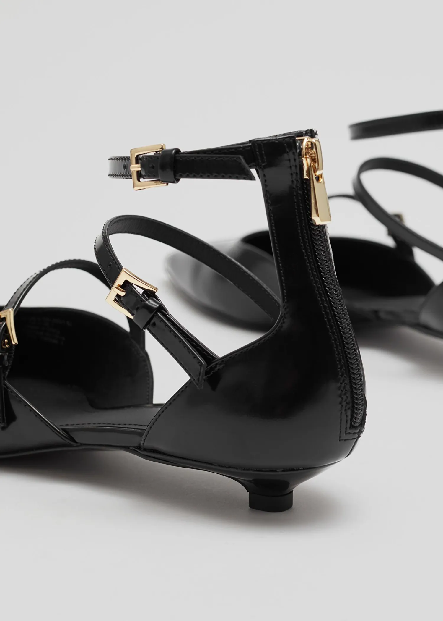 Pumper Hviler På Lave Killingehæle, Lavet Af Læder. Med Slanke Spændestropper, Der Indrammer Foden. Afsluttet Med Spidse Tæer Og Guldfarvede Lynlåse Bagpå.