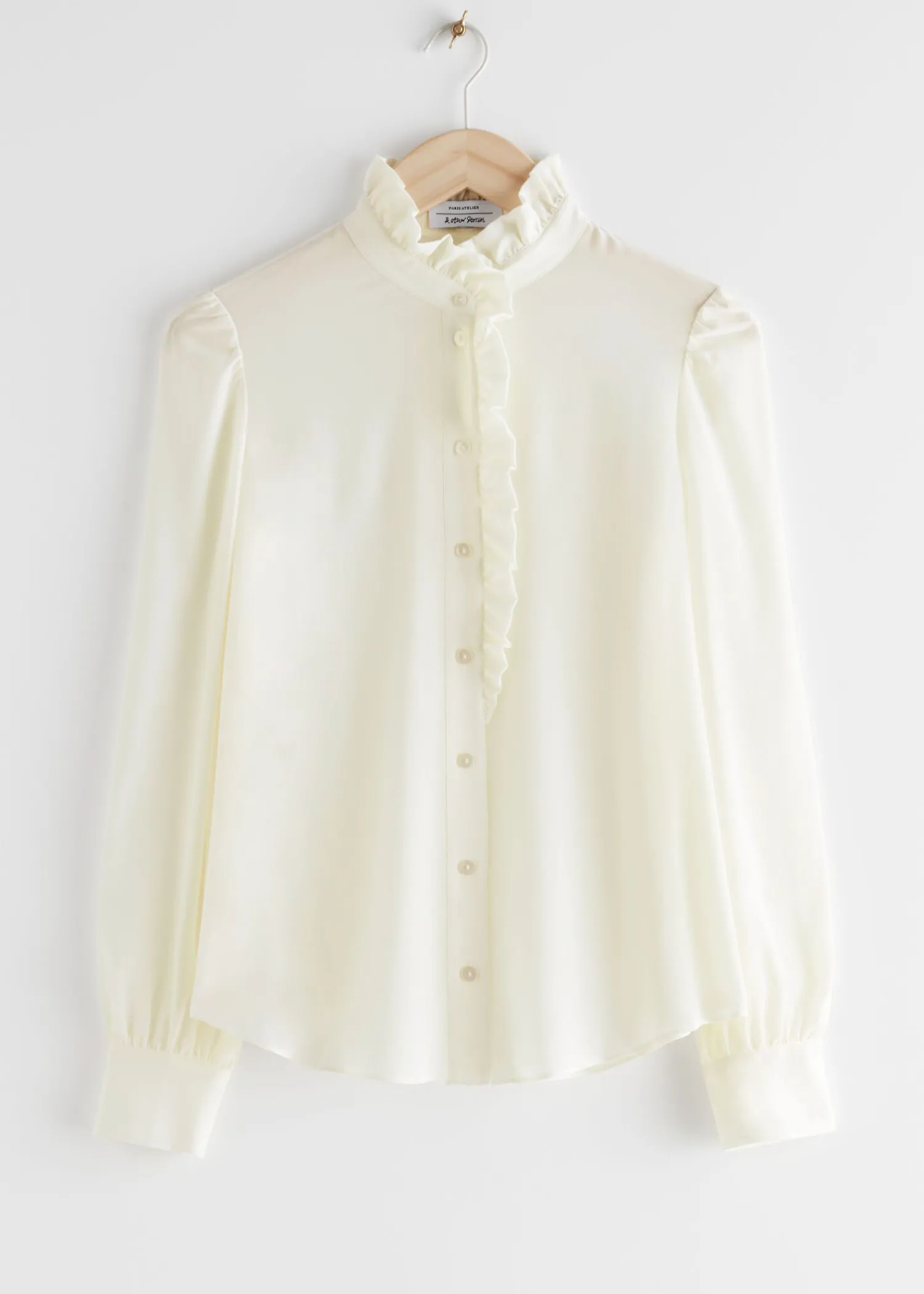 Langærmet Mulberry Silkebluse Med Knapper Med Flæsekrave Og Rynkede Skuldre. Syv Knaplukninger Midt Foran. Tre Knaplukninger Ved Manchetterne Længde På Skjorten: 62,6 Cm / 24,6″ (Eu 36 / Uk 10 / Us 4)