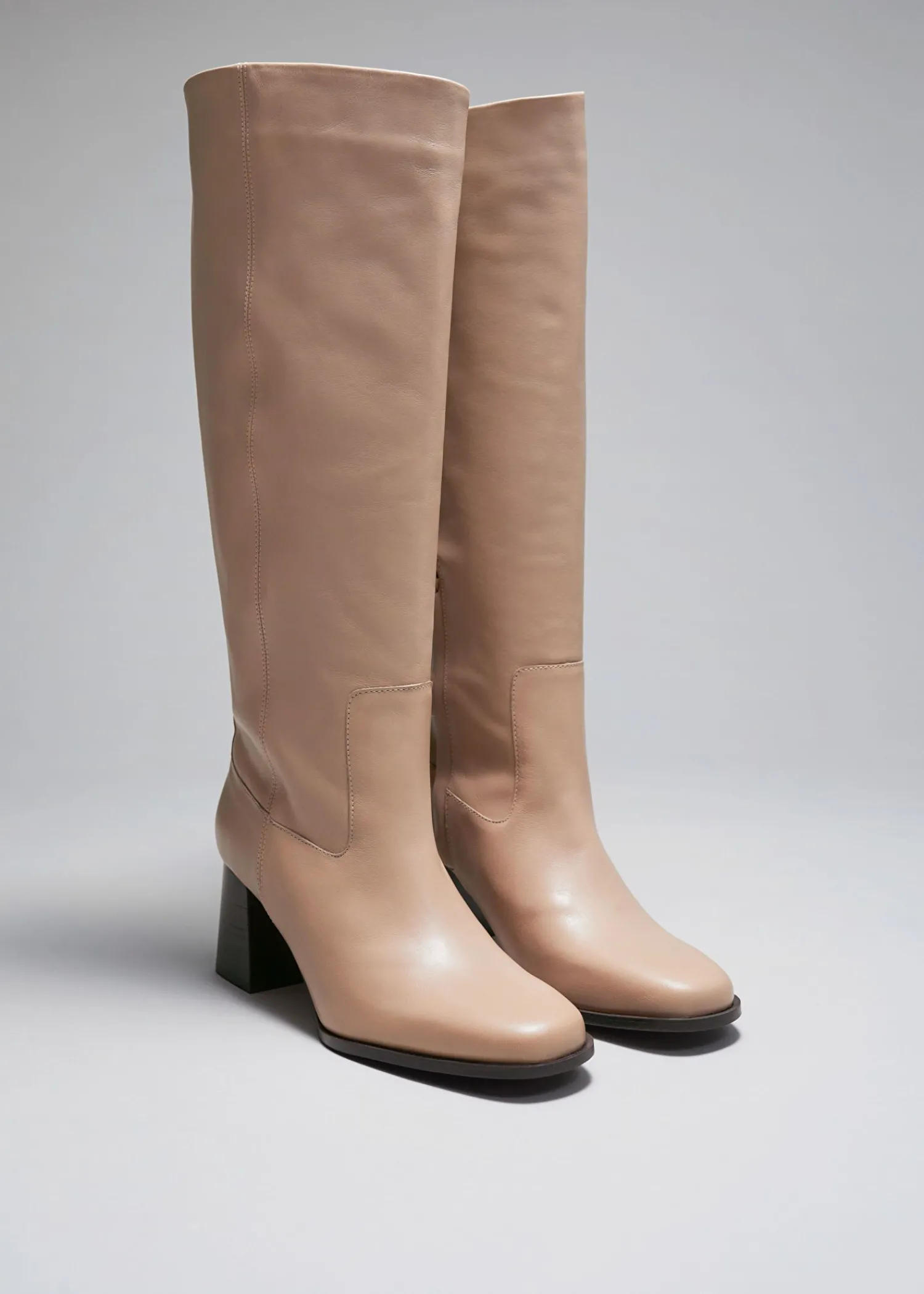Klassiske Knæstøvler I En Poleret Glat Finish, Med En Mellemhøj Komfortabel Blokhæl, Elegant Mandeltå Og Et Klassisk Buet Skaft. Afsluttet Med Skjulte Sidelynlåse. Hælhøjde: 5,5 Cm / 2,2″ Skafthøjde: 38 Cm / 15″
