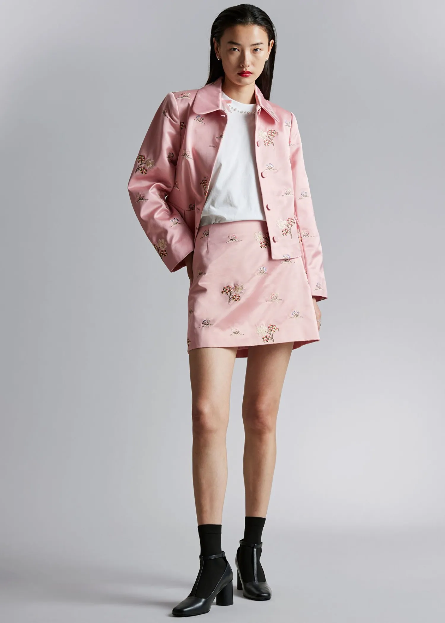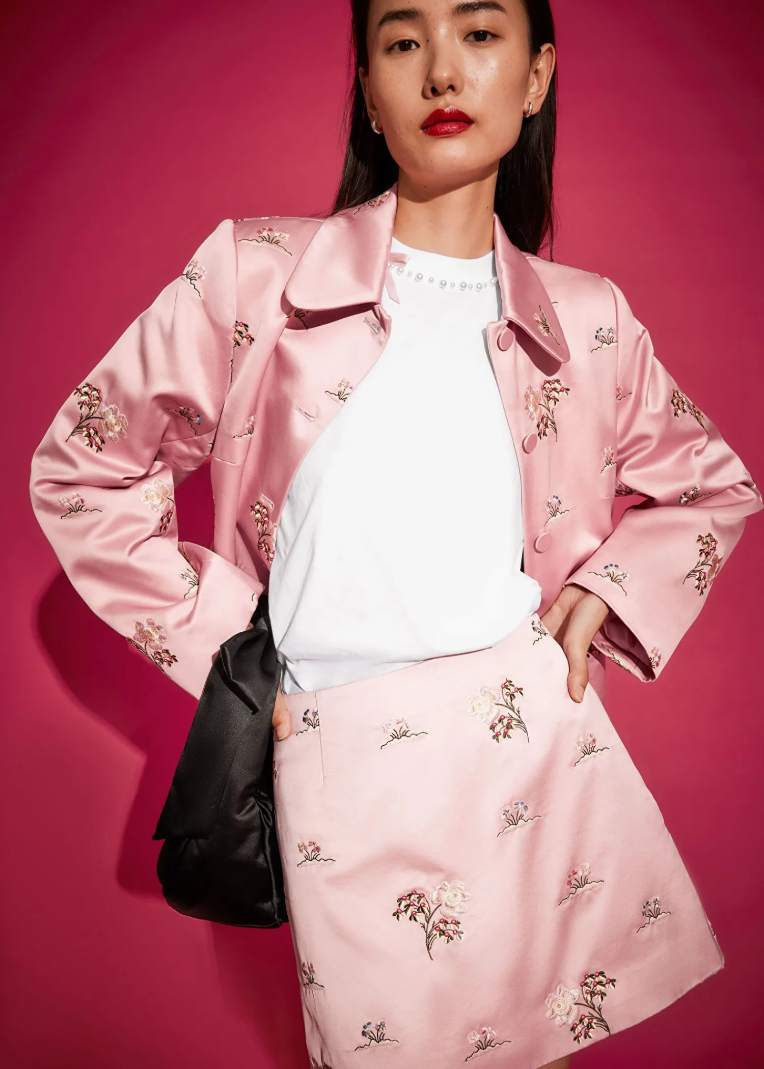 A-Line Satin Mini-Nederdel Med Broderede Blomsterdetaljer. Sikres Med Lynlås I Siden. Længde På Nederdel: 40,5 Cm / 15,9″ (Eu 36 / Uk 8 / Us 4)