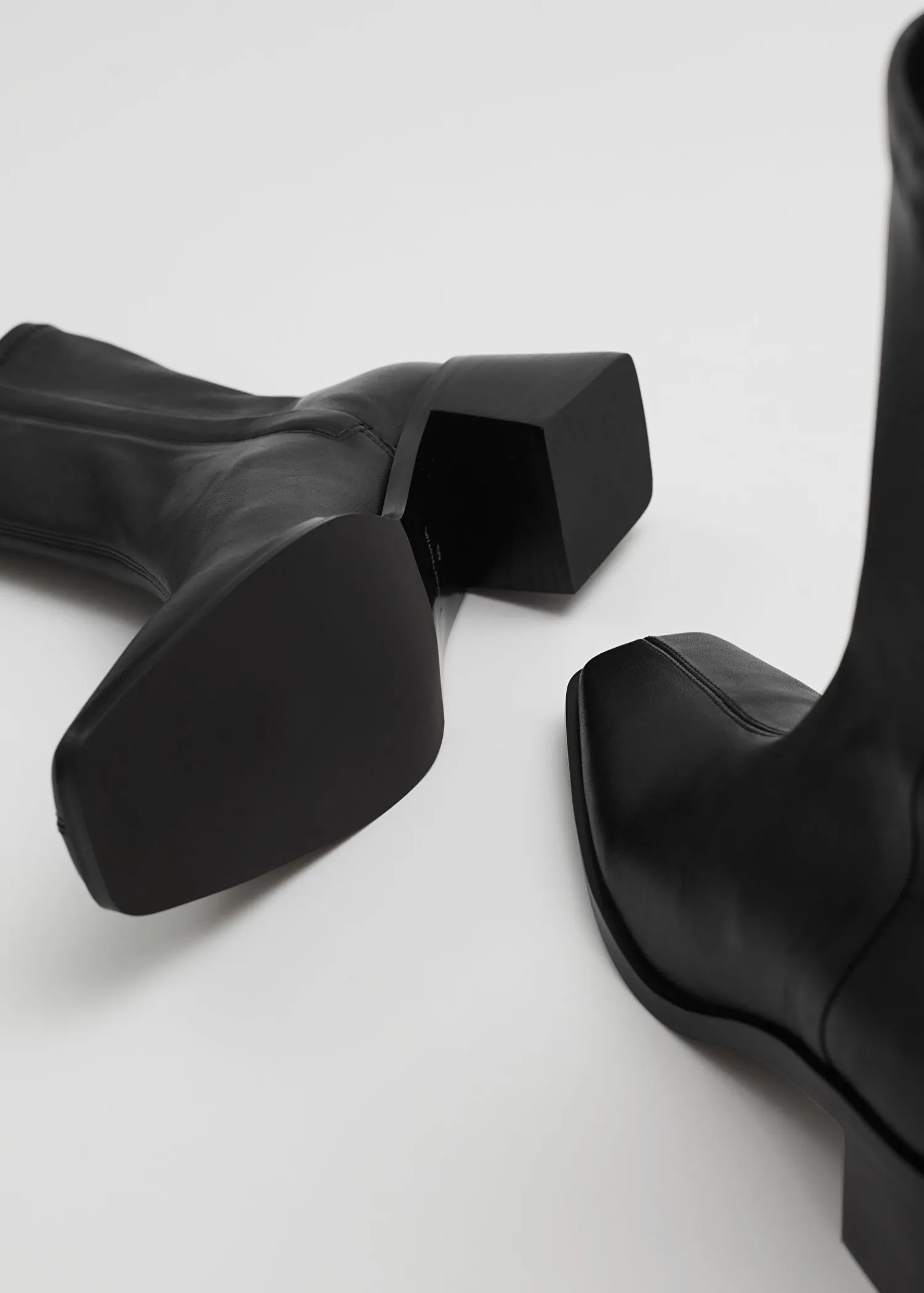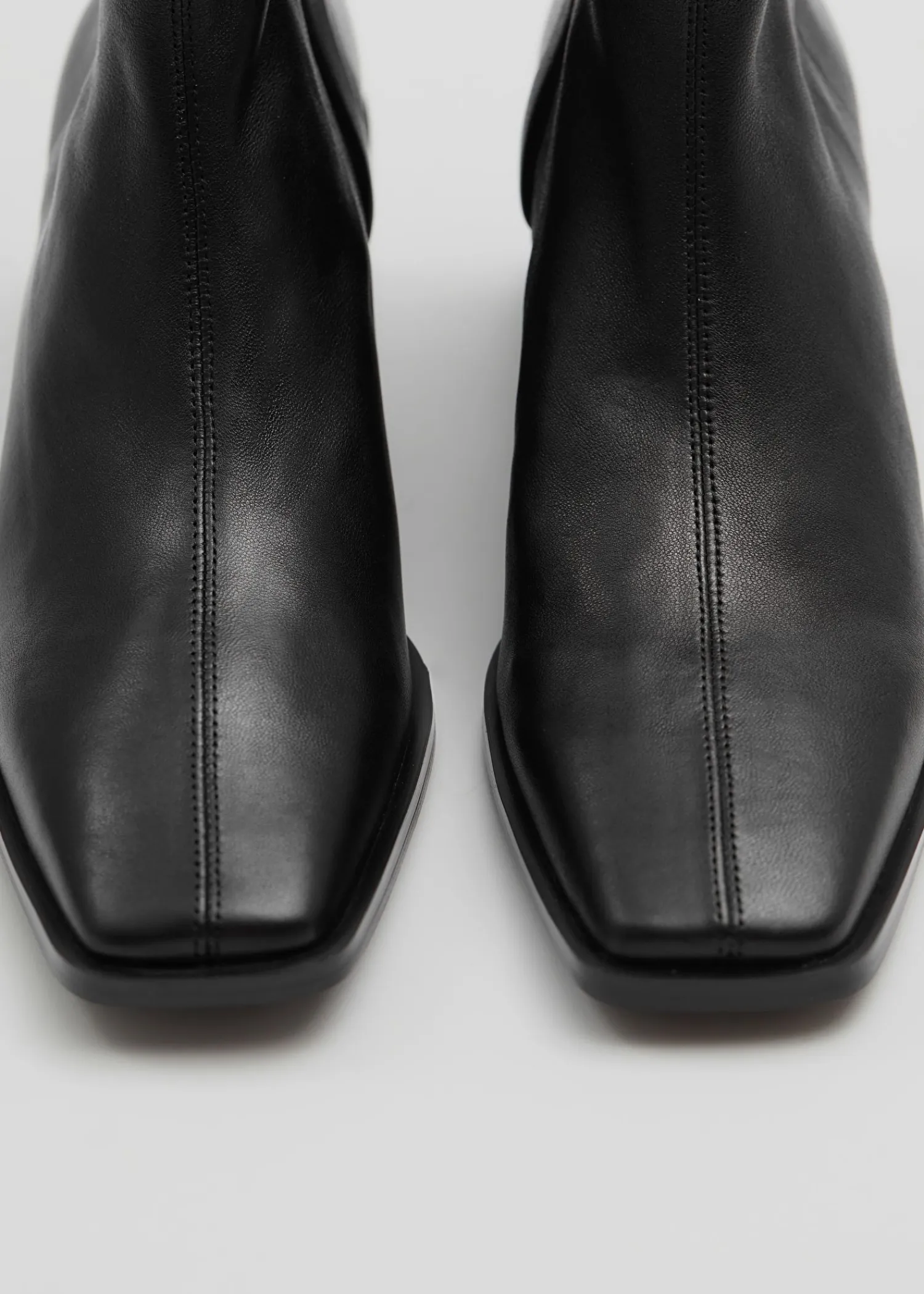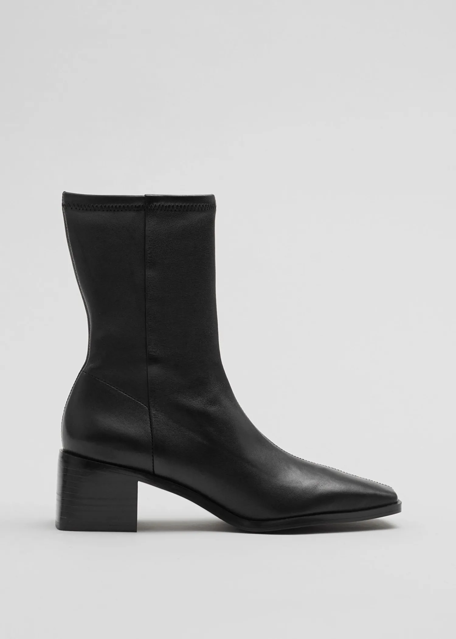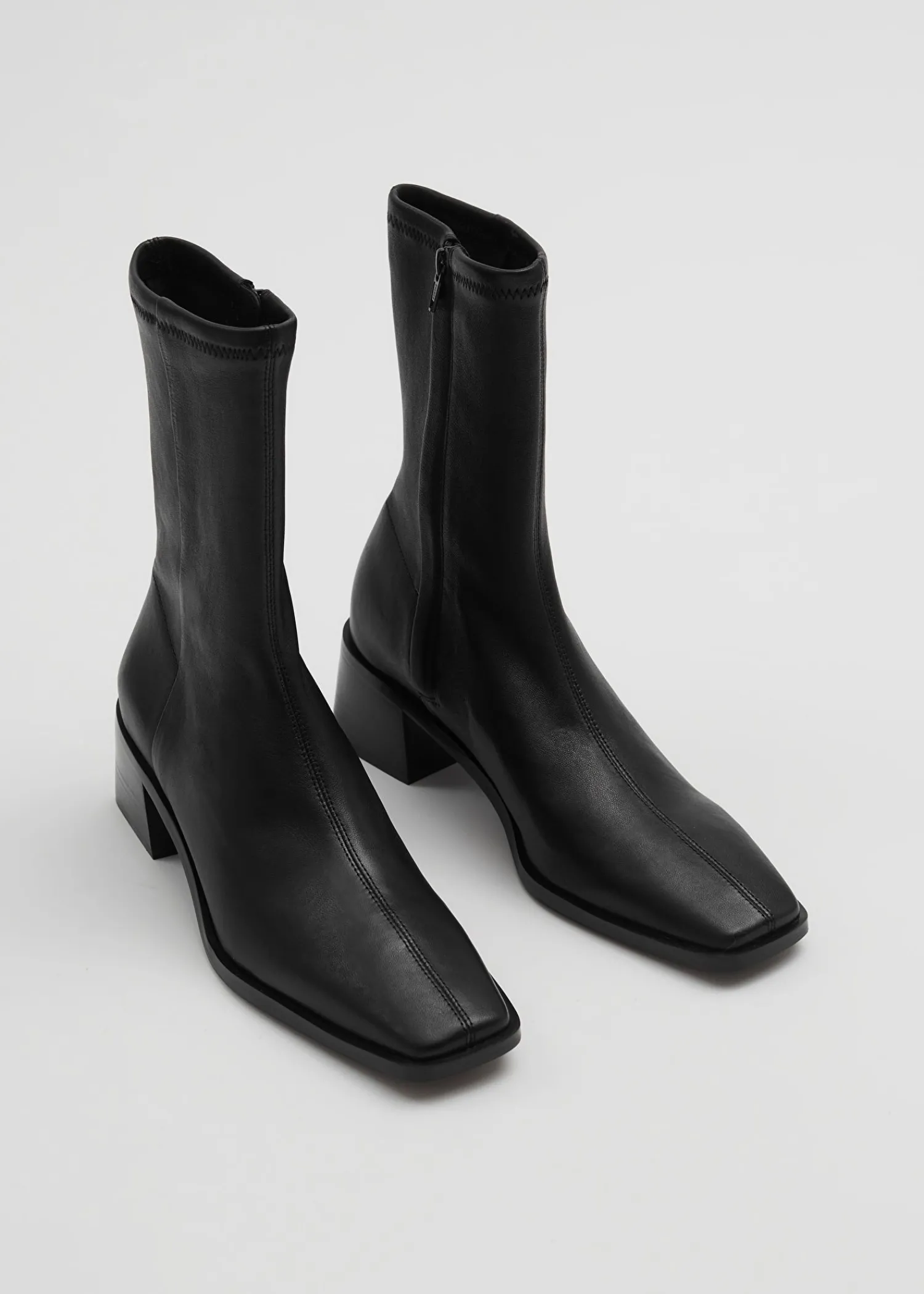 Lædersokkestøvler Med Firkantede Tåer Med Topsyede Midtersømme, Tykke Blokhæle Og Skjulte Lynlåse I Siden. Hælhøjde: 5 Cm / 1,9″