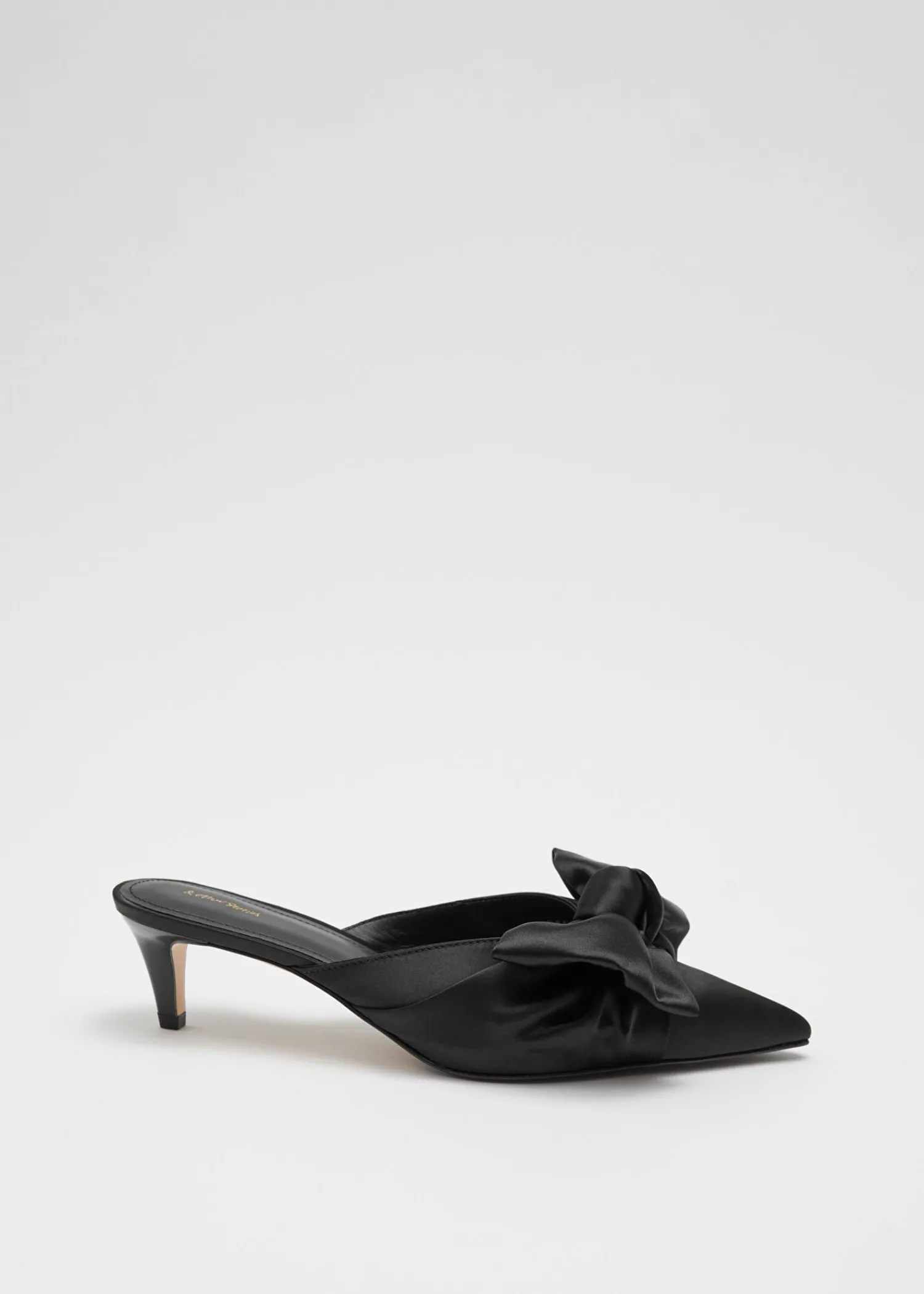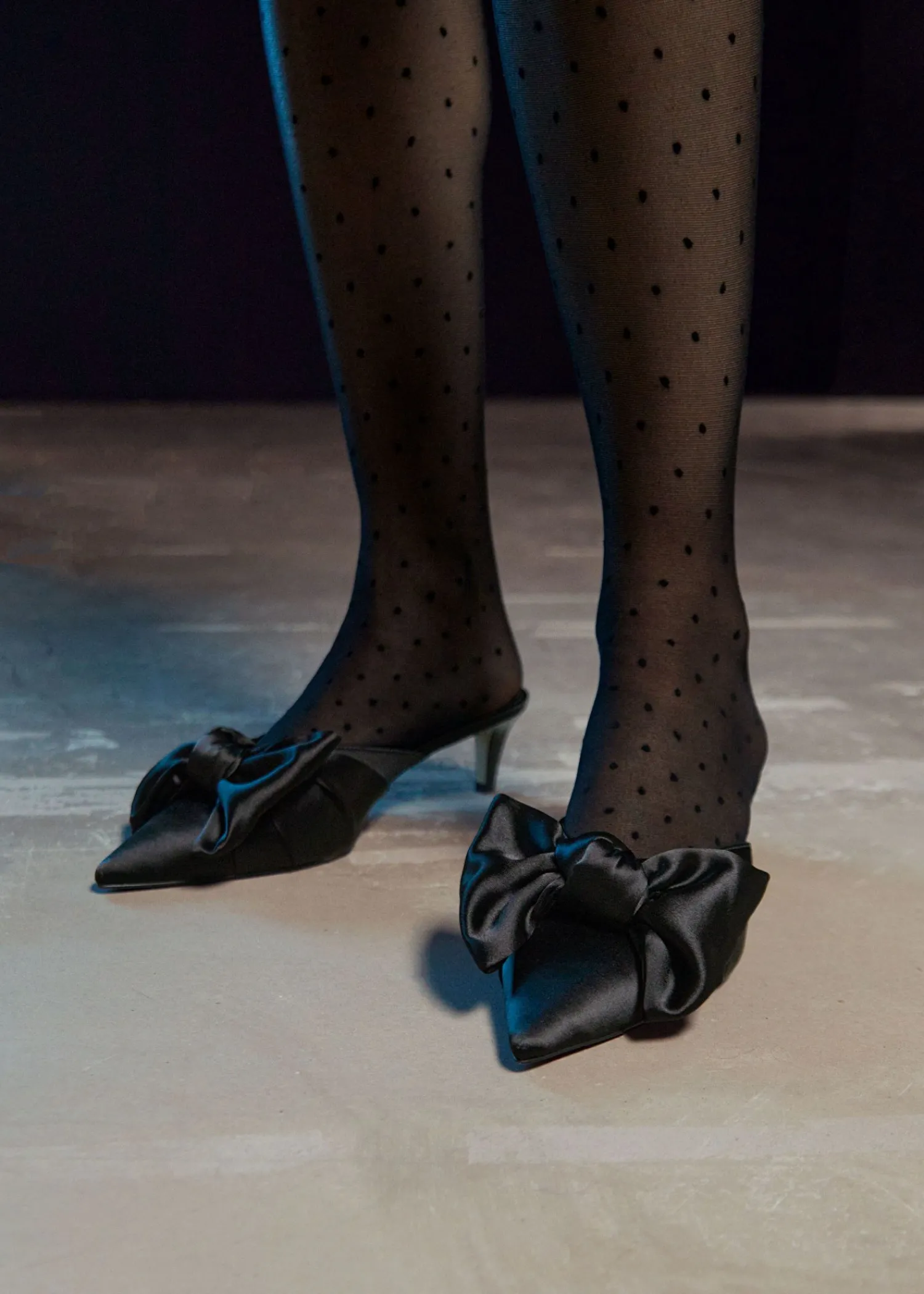 Muldyr Lavet Af Skinnende Satin, Detaljerede Med Bløde Sløjfer Placeret Oven På De Spidse Tæer. Sæt På Slanke Killingehæle, De Er Foret Med Glat Læder For Ekstra Komfort. Hælhøjde: 4,5 Cm / 1,8″