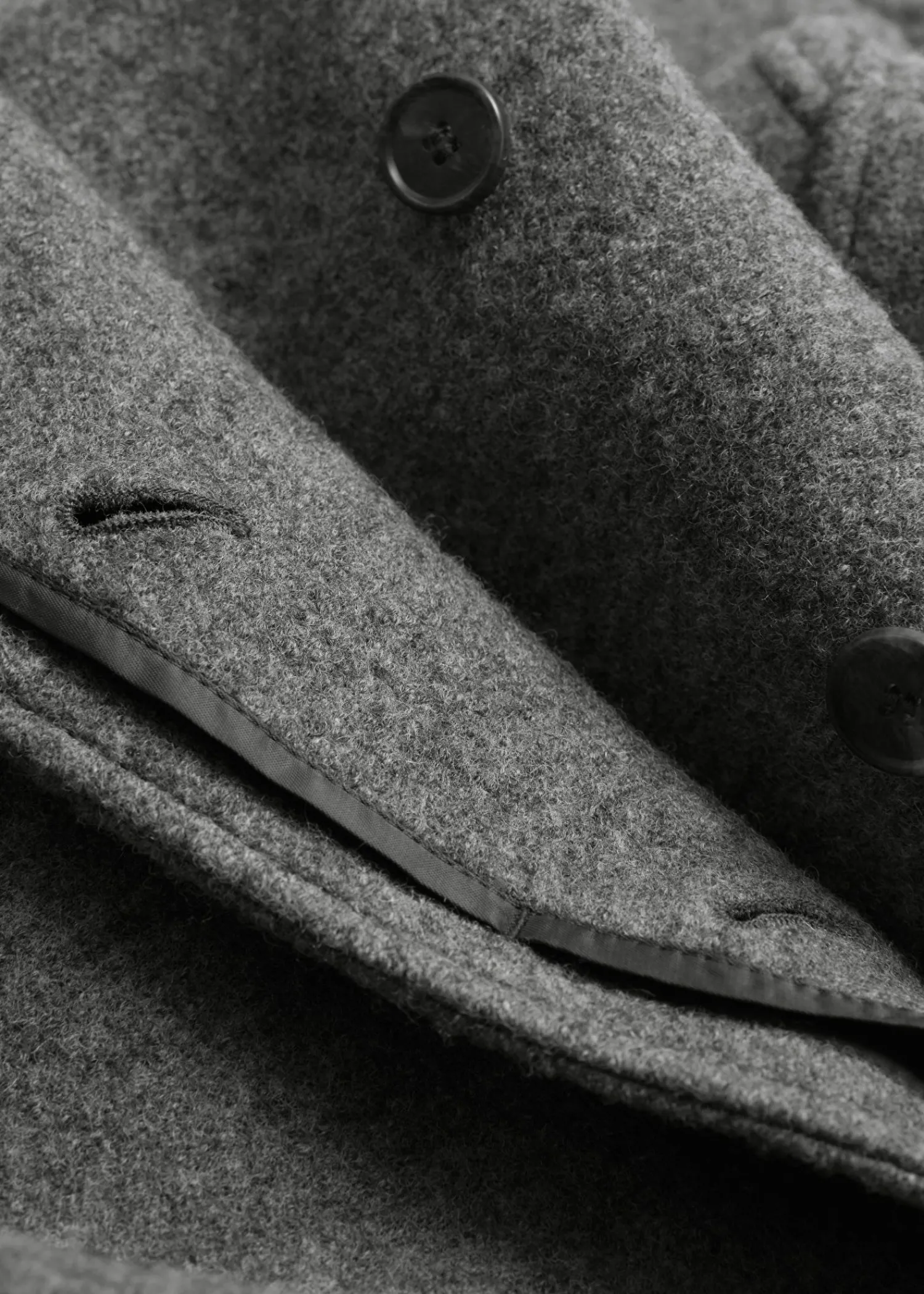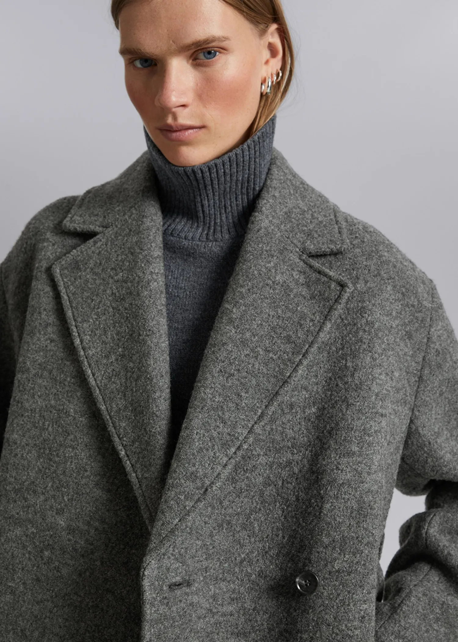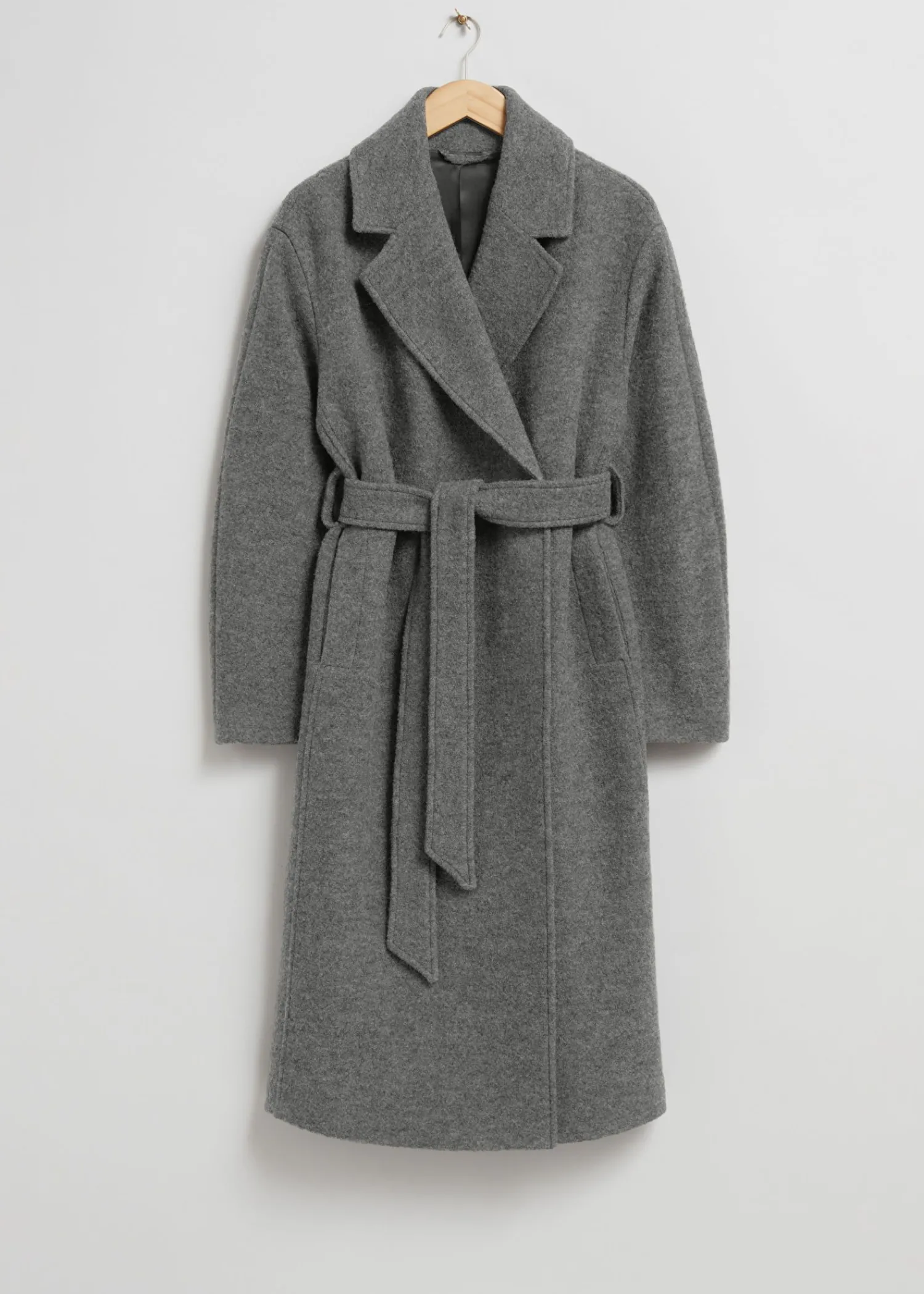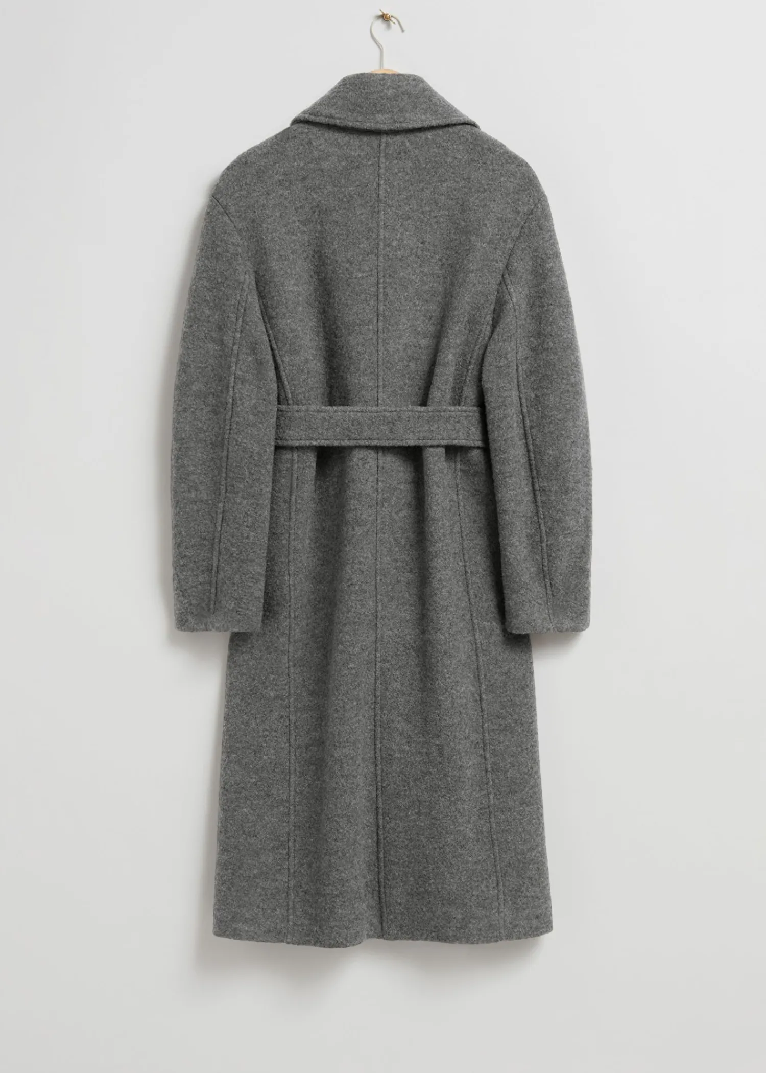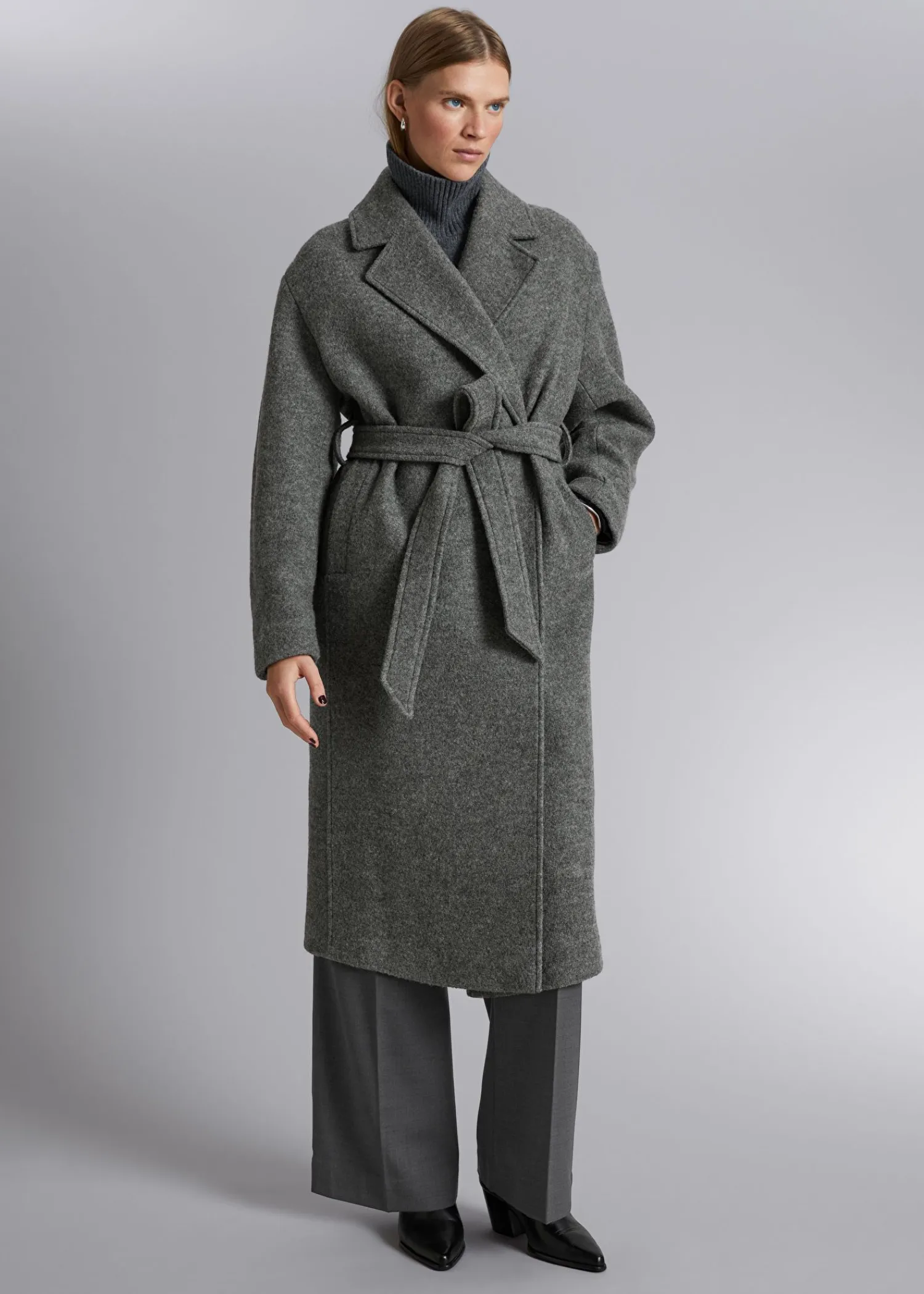 Voluminøs Uldfrakke Med Et Overlappende Revers. Afsluttet Med Et Tonalt Selvbindebælte. Duo Lommer Tre Skjulte Knaplukninger Certificeret I Henhold Til Responsible Wool Standard (Rw0063) Længde På Frakken: 116 Cm / 47,6″ (Størrelse S)