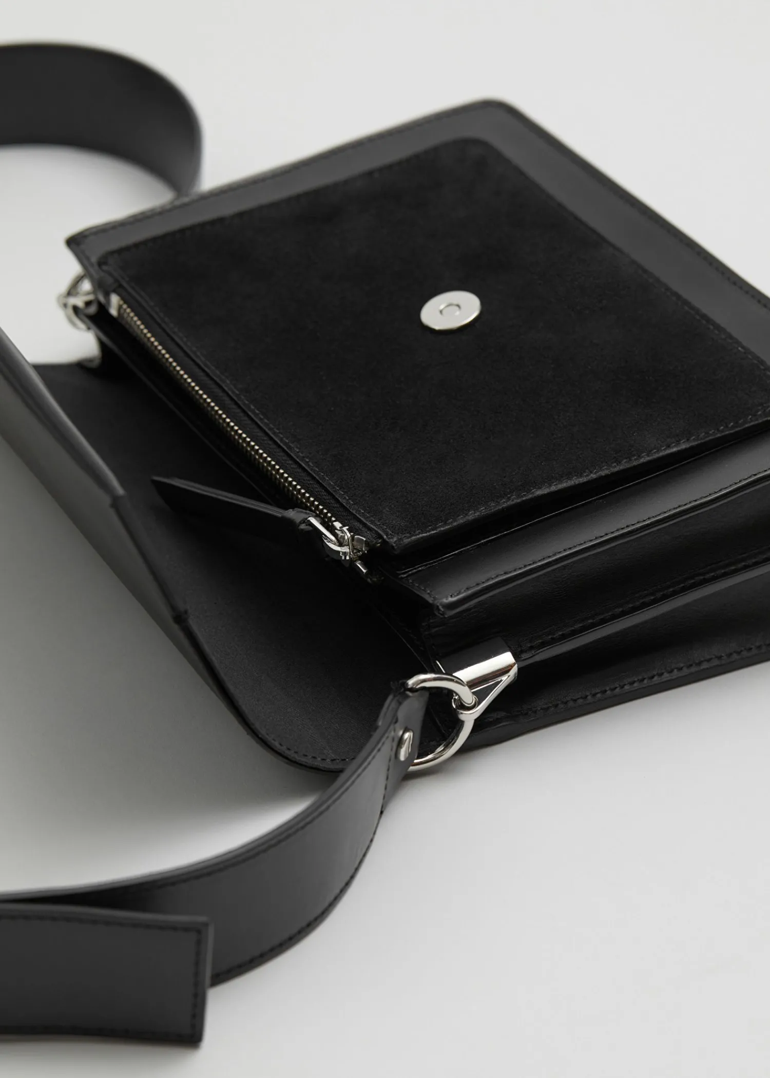 Crossbody-Taske I Mellemstørrelse Lavet Af Læder Med Tre Indvendige Rum, Hvoraf Det Ene Er Med Lynlås. Detaljeret Med En Kontrasterende Ruskindslomme, En Magnetisk Knaplukning Og En Justerbar Skulderrem. For: Bomuld Sølv Hardware Dimensioner: Længde: 25 Cm / 9,8″ Bredde: 19 Cm / 7,5″ Højde: 10 Cm / 3,9″