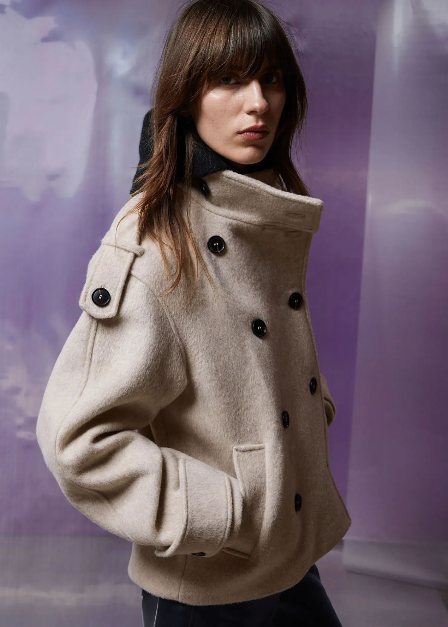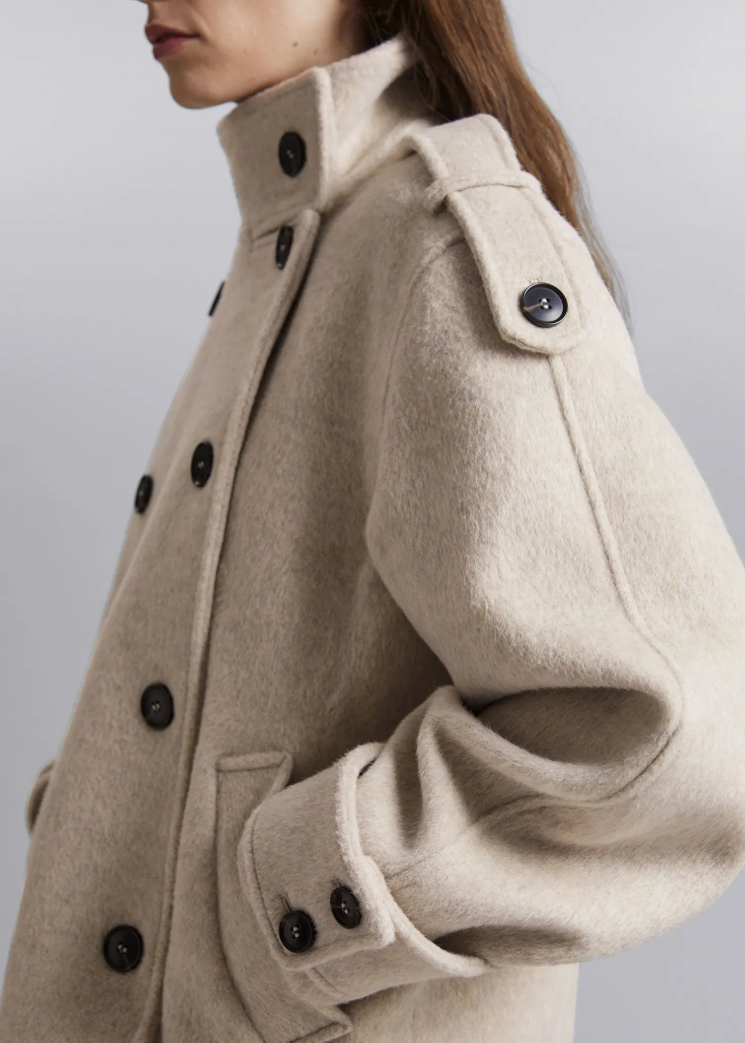 Dobbeltradet Uldjakke Med Faldede Skuldre For En Afslappet Silhuet. Fuldt Forede Welt-Lommer Knaplumper Ved Skuldre Og Manchetter Certificeret I Henhold Til Responsible Wool Standard (Cu888809) Længde På Jakke: 85 Cm / 33,5″ (Størrelse S)