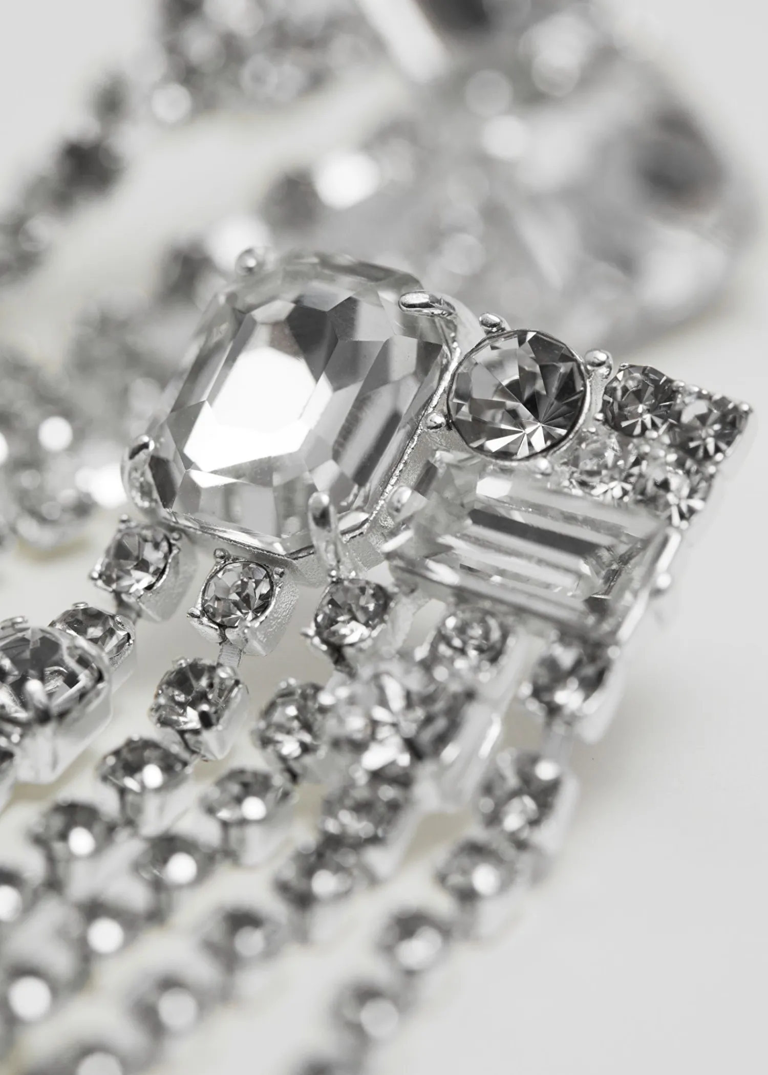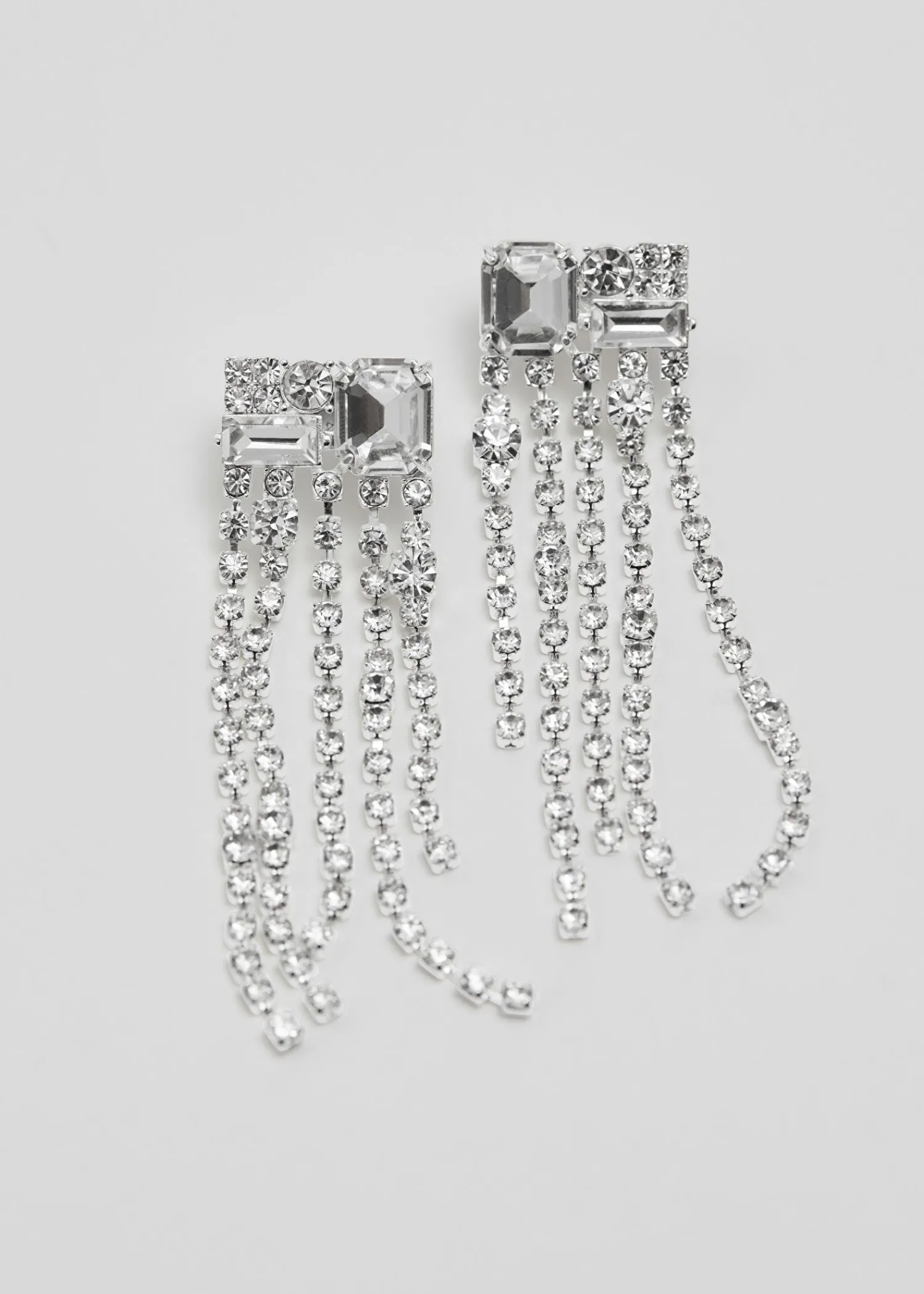 Blændende Sølvfarvede Øreringe Med Rækker Af Fine Krystaller, Der Danner En Asymmetrisk Dråbe For Dramatisk Effekt. Længde: 7,5 Cm / 3″ Nikkeltestet