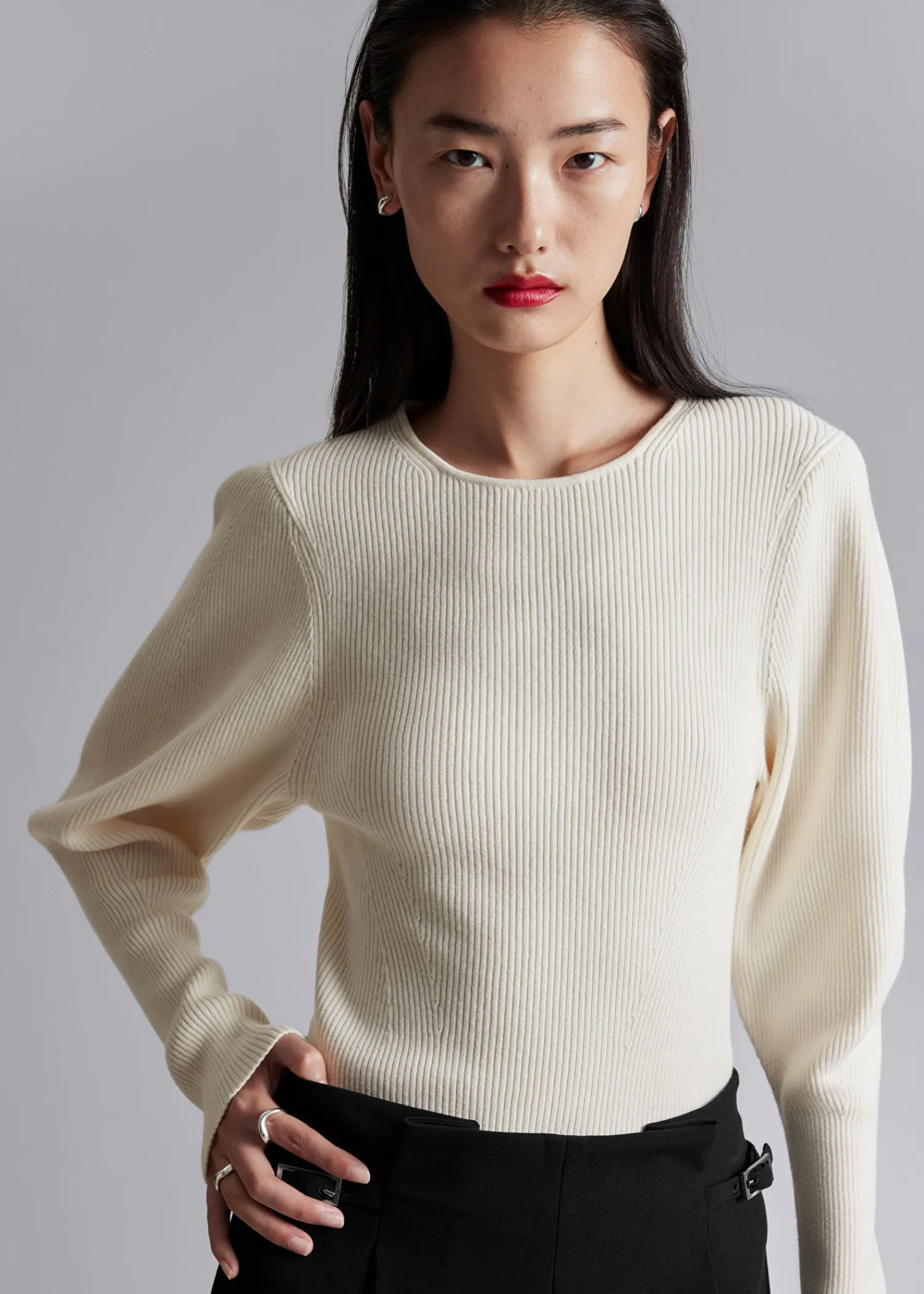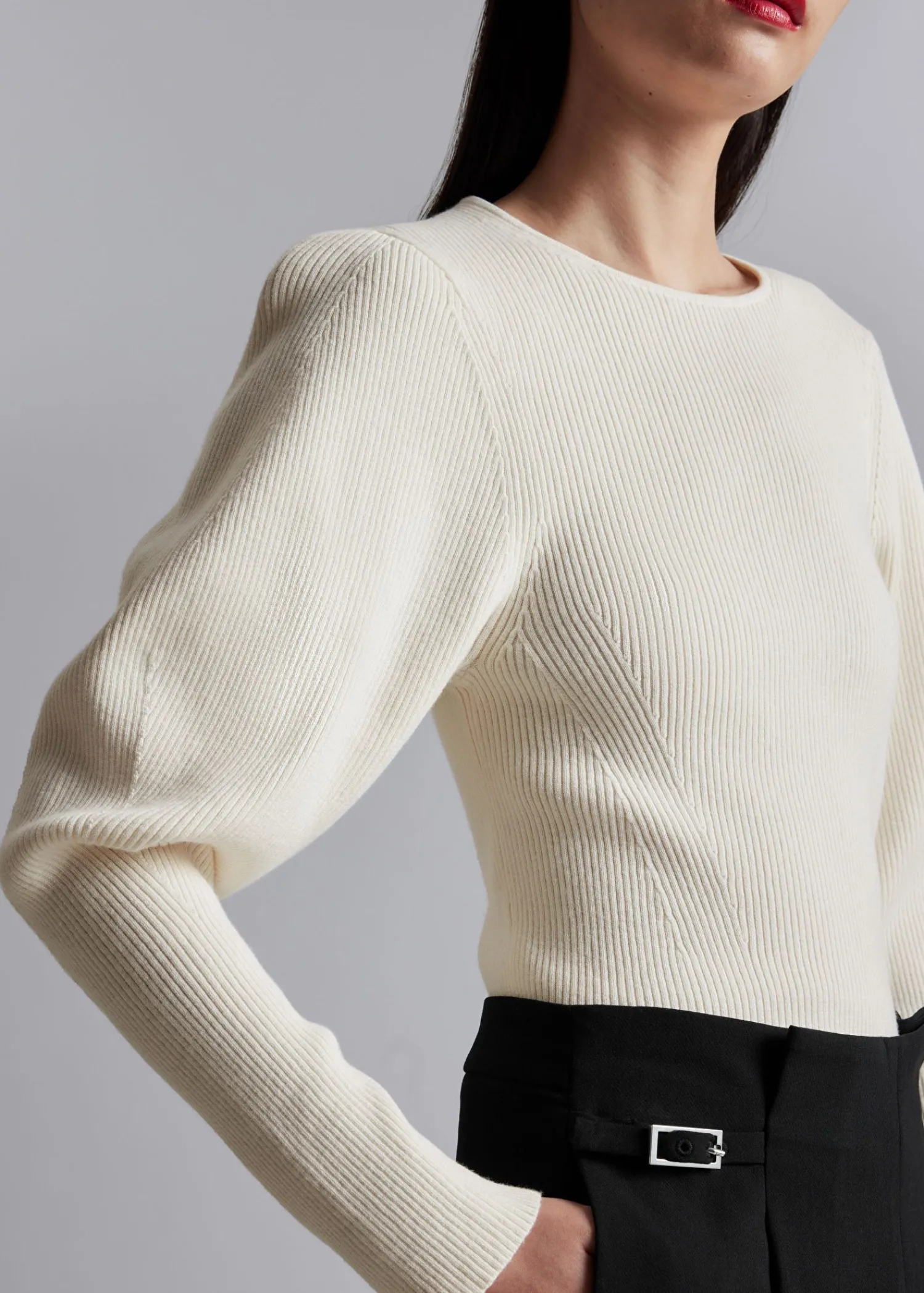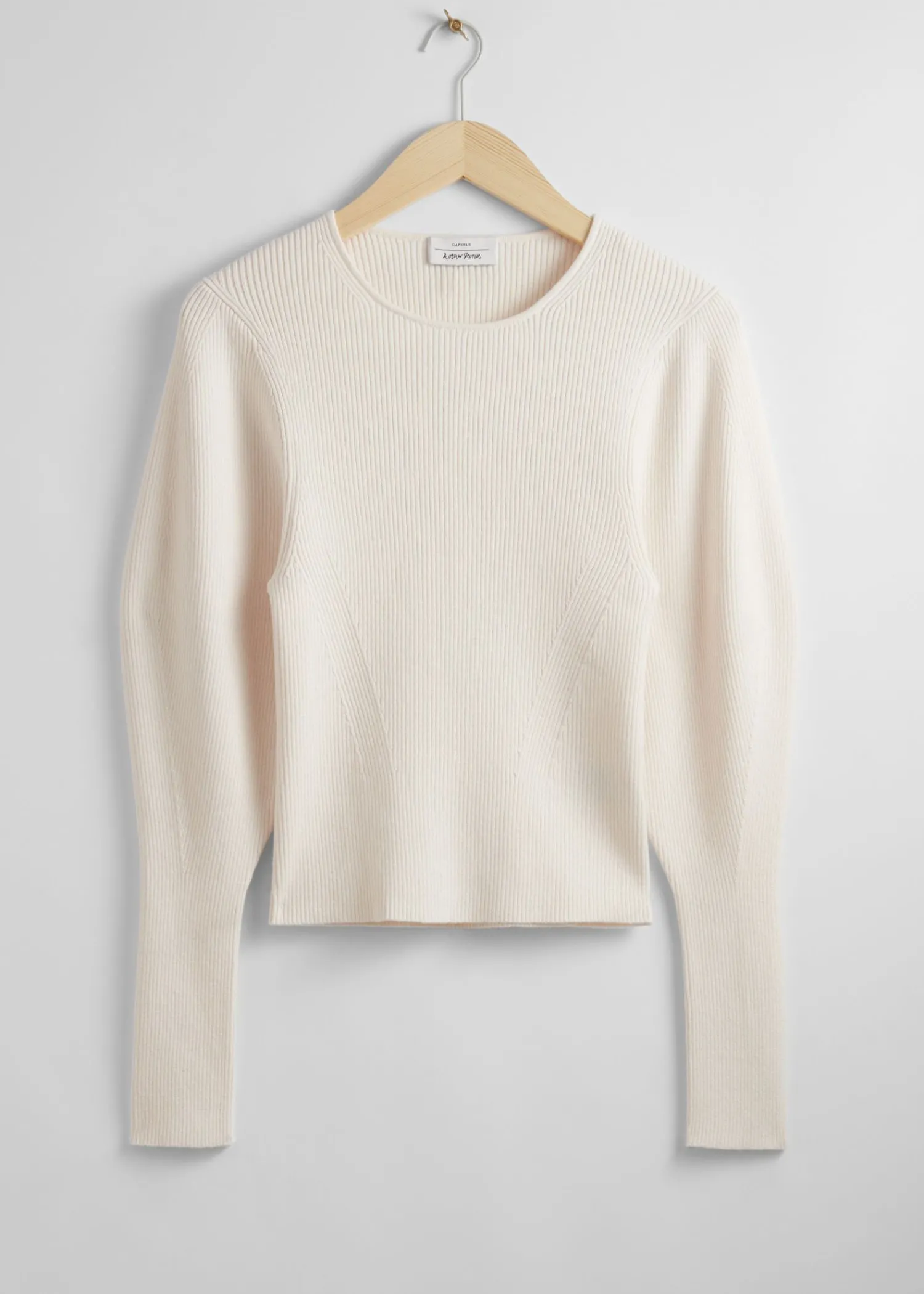Ribstrikket Trøje Med Pufærmer Afsluttet Med Lange, Tætsiddende Manchetter. Slim Fit Rund Halsudskæring 37% Rws Uld Certificeret Af Control Union 893290 Længde På Trøje: 55 Cm / 21,7″ (Str. S)